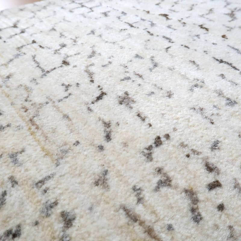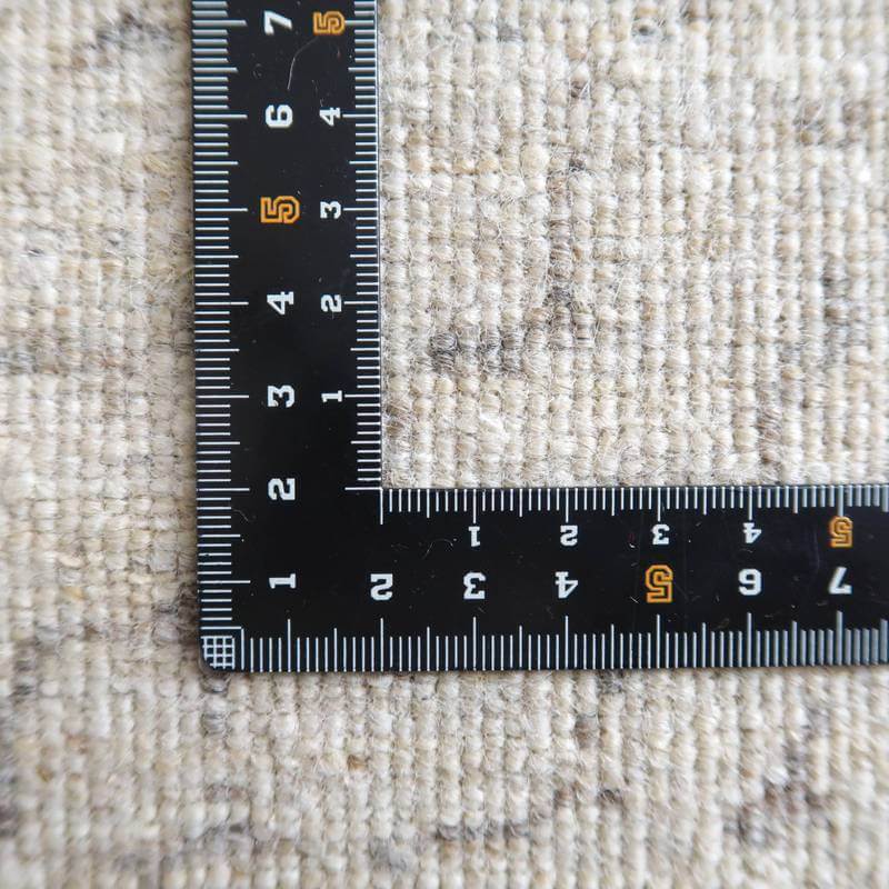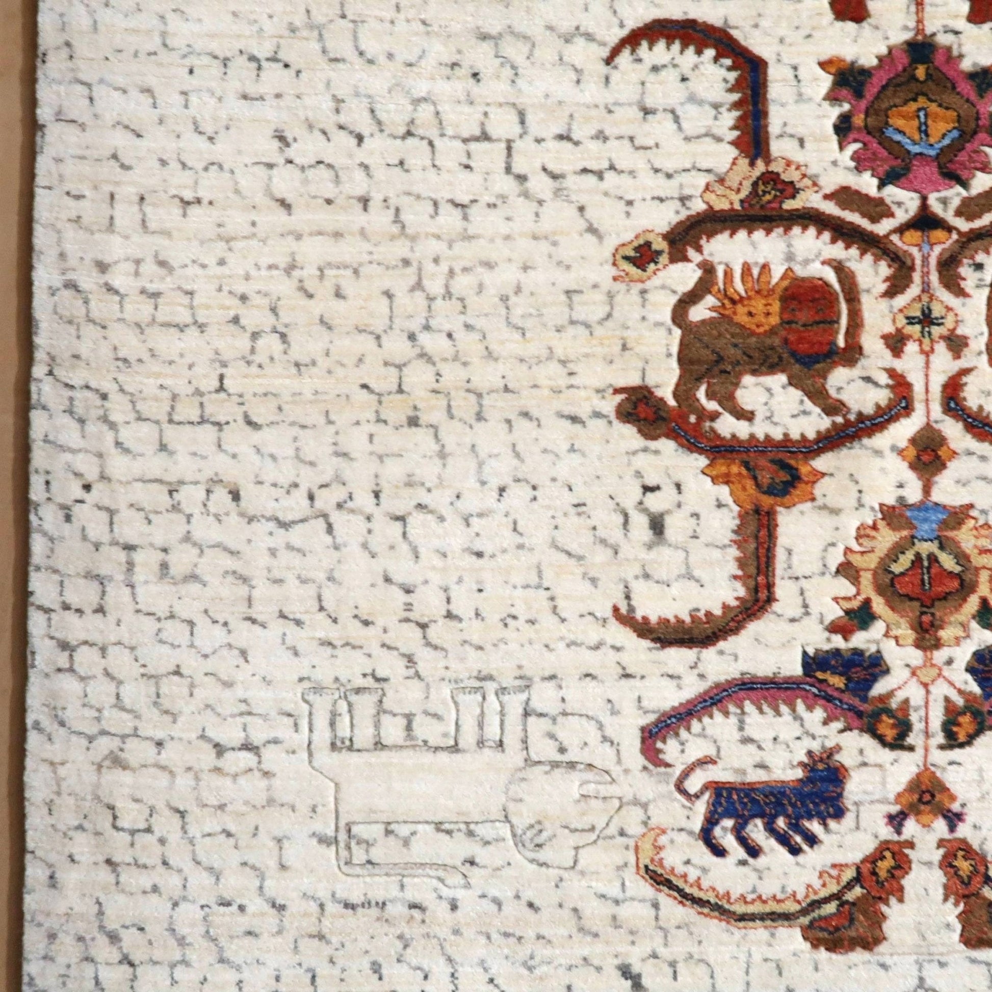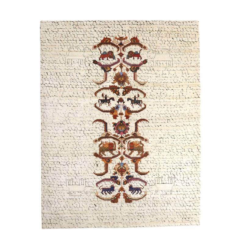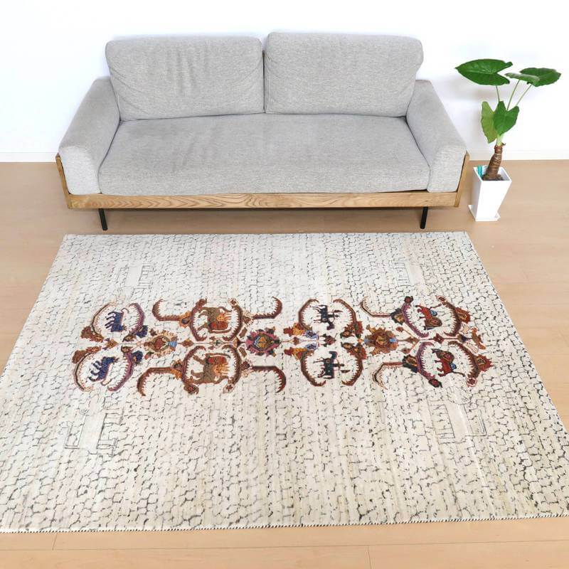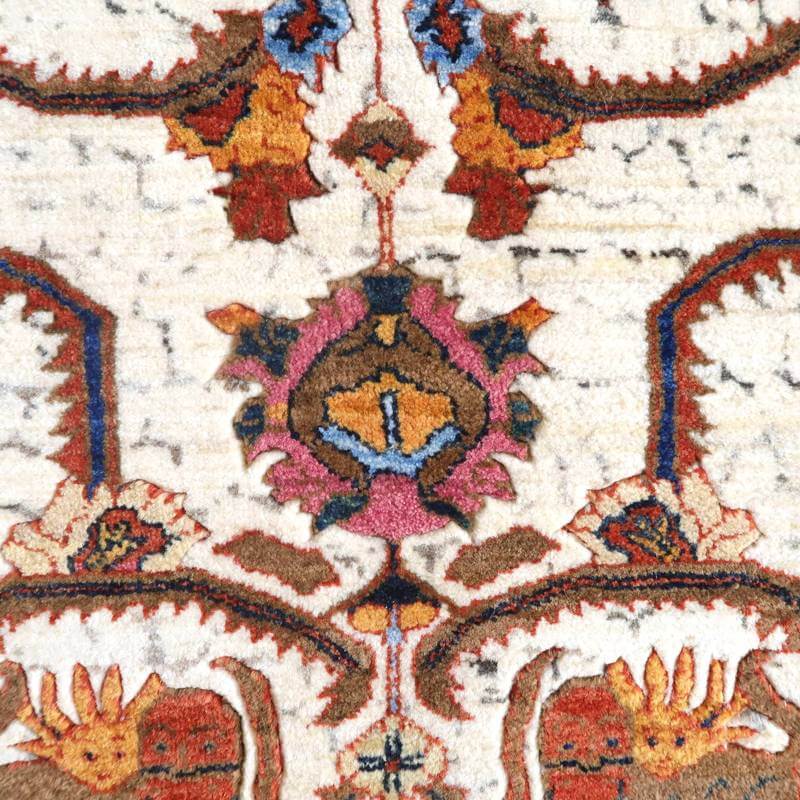 明るいアイボリーと石畳のような文様のグレーは、刈り取った羊の毛を染めずに上手くデザインに活かしています。センター部分は、植物を基にした連続模様が縦に連なり、その合間に剣を持ったライオンや騎士が対称に描かれた雄々しいデザインですが、そのアウトラインは手バサミで段差をつけて、凹凸で柄を際立たせる技法が施されています。作者の個性と感性あふれるアートデザインのギャッベです。冬毛の柔らかな最高部位のウールのみを使用して細かく編んだ最上級のソフトな手触り。