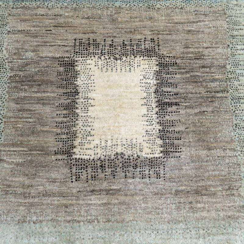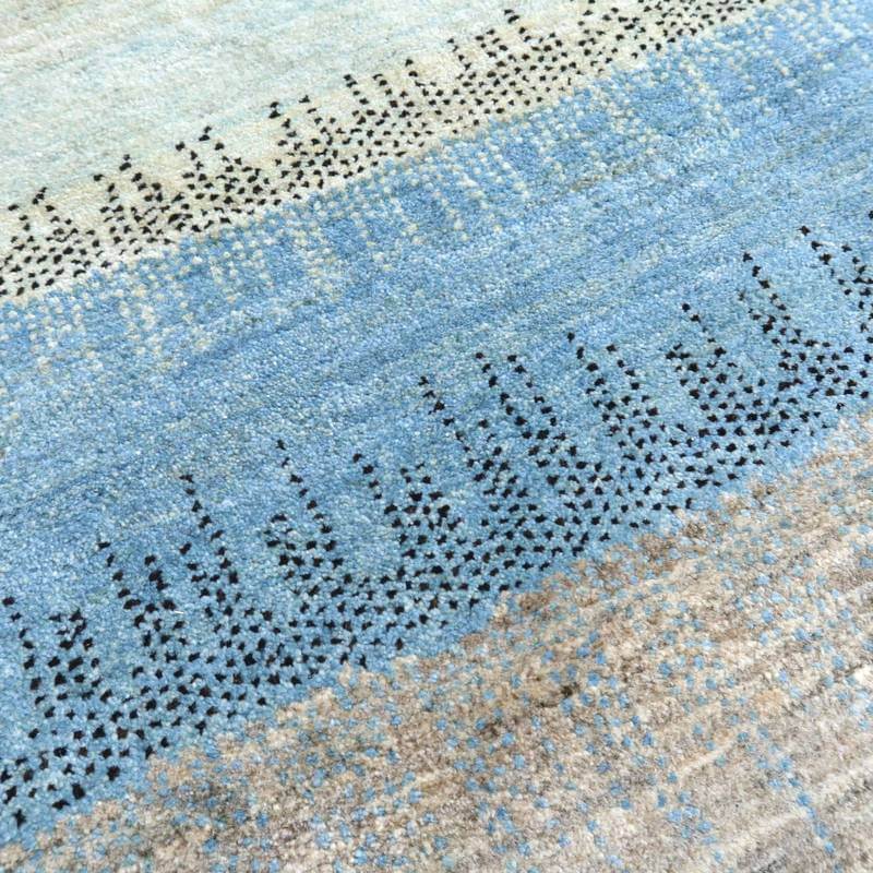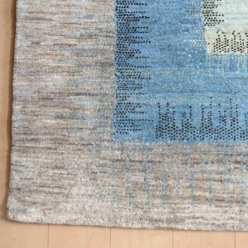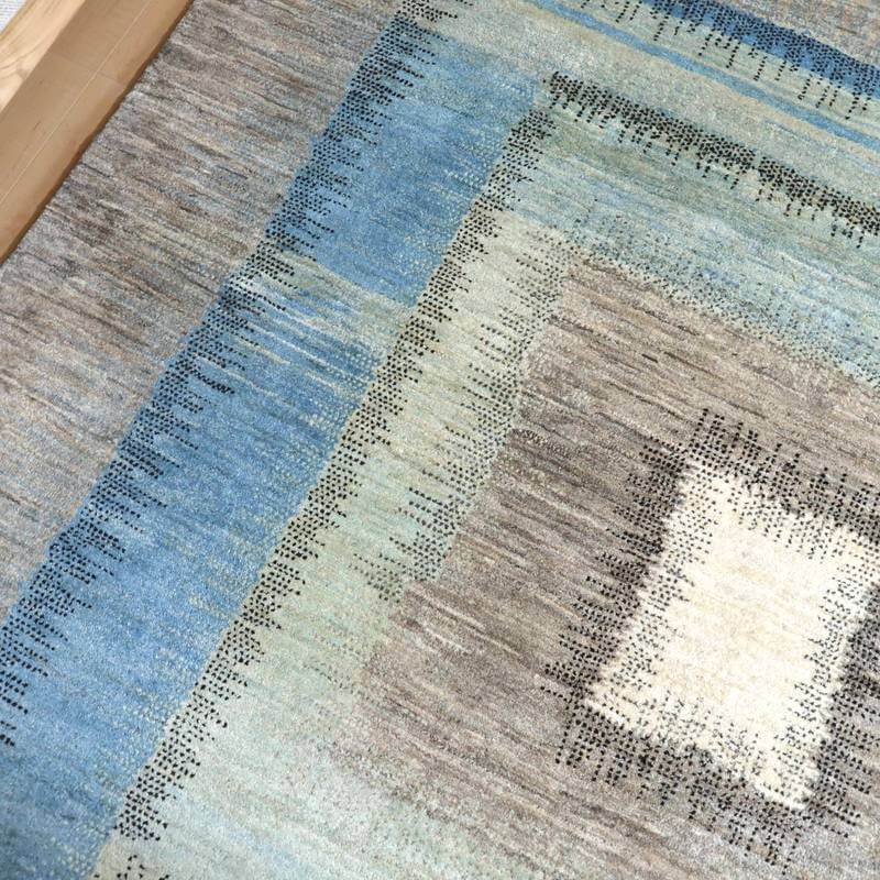 刈り取った羊の毛を染めずにそのままの原毛の色合いを活かしたグレーベージュを基調としています。薄い空色はスモーキーな、くすみカラー。ドットでモダンにつながった、柔らかなアブラシ(色むらのグラデーション)の美しさを味わってください。暖かみのある木のインテリアでもモダンな空間でも馴染むスタイリッシュなアートデザインのギャッベ。冬毛の柔らかな最高部位のウールのみを使用して細かく編んだ最上級のソフトな手触りです。