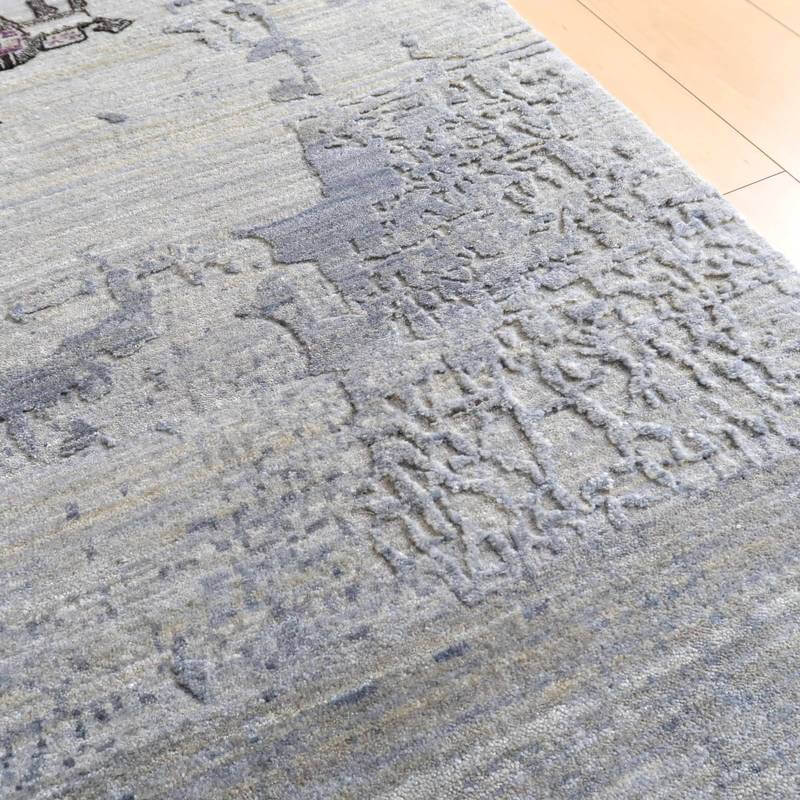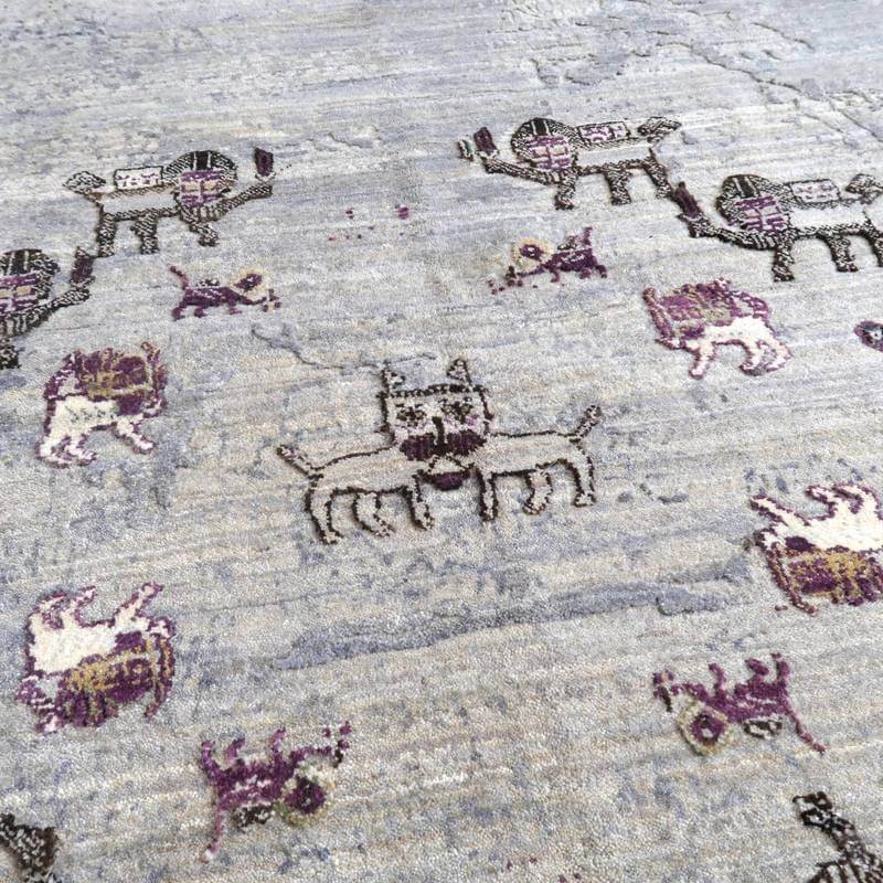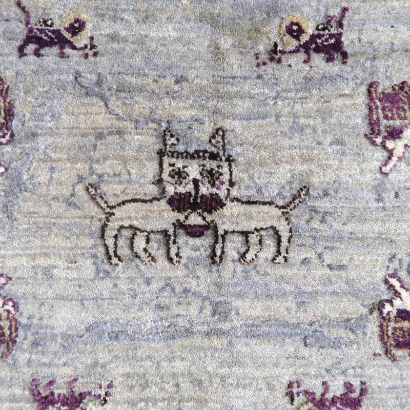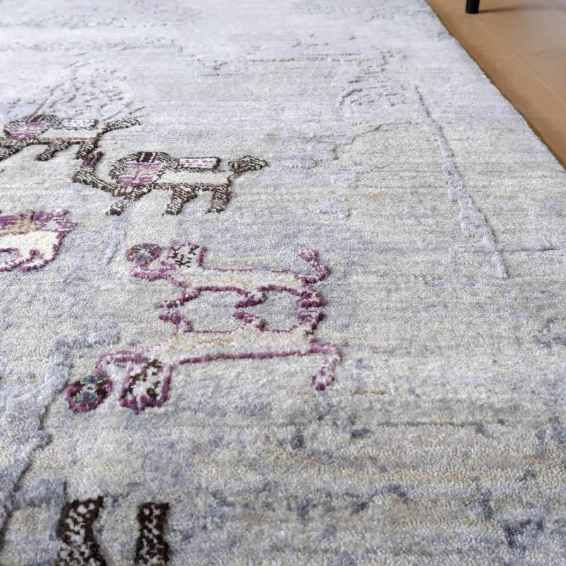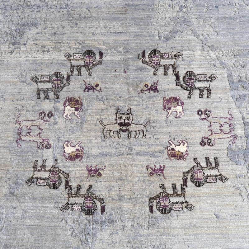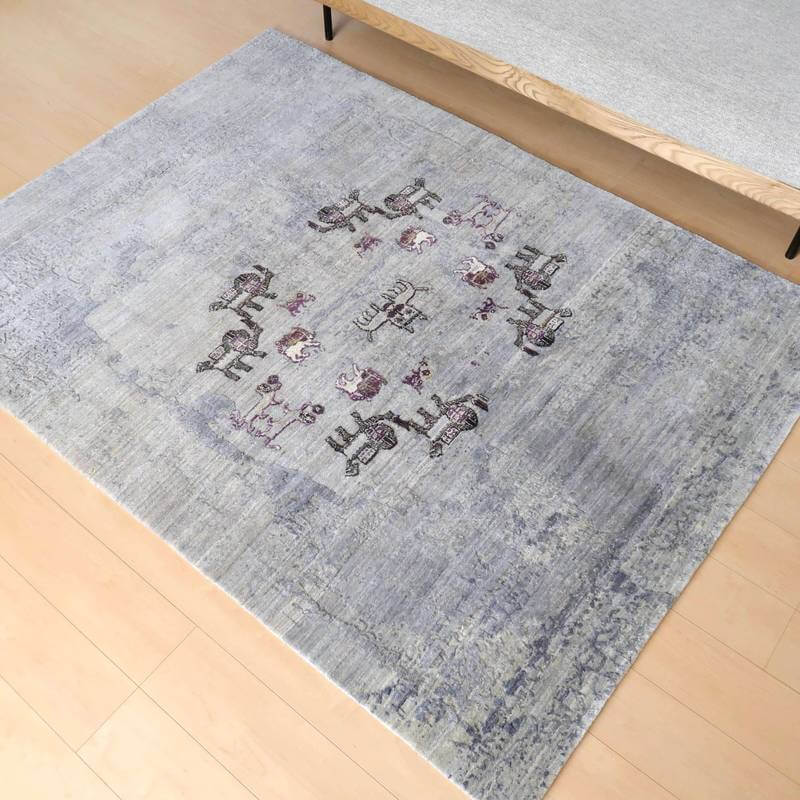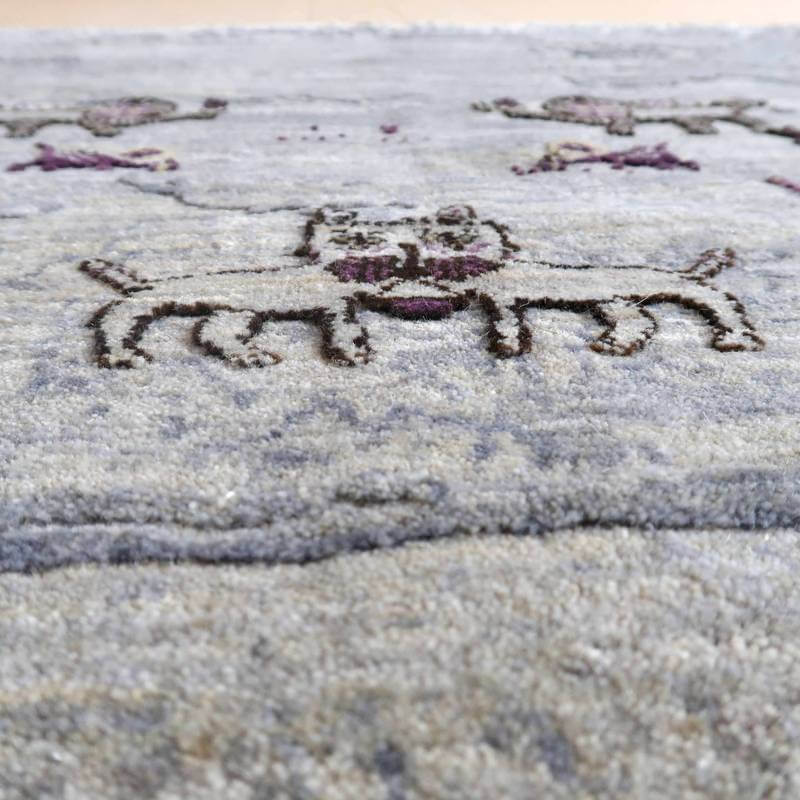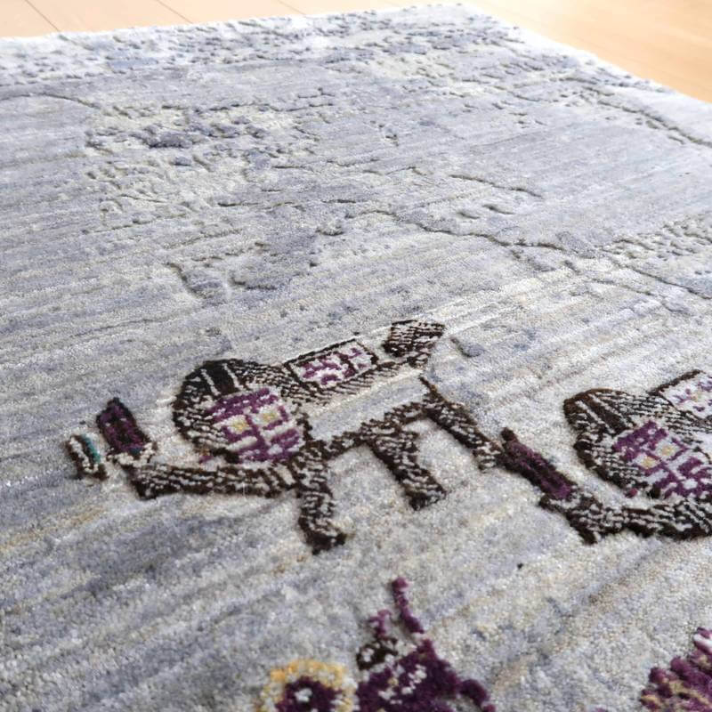 森か、はたまた雲の中か、剣を持ったライオンたちが対峙する世界が、幻想的なニュアンスカラーの中に表現されています。薄グレーと薄むらさき、薄水色が混ざり合ったグラデーションは、もともとのウールにあるアブラシ(色むらのグラデーション)のグレーベージュと融合して、何とも微妙な、くすみカラーとなっています。手バサミを使って、動物部分はもとより、パイルに凹凸をつけて、浮きたつ文様をセンターから円状に広がるようにデザインした革新的なアートデザインです。冬毛の柔らかな最高部位のウールのみを使用して細かく編んだ最上級のソフトな手触り。