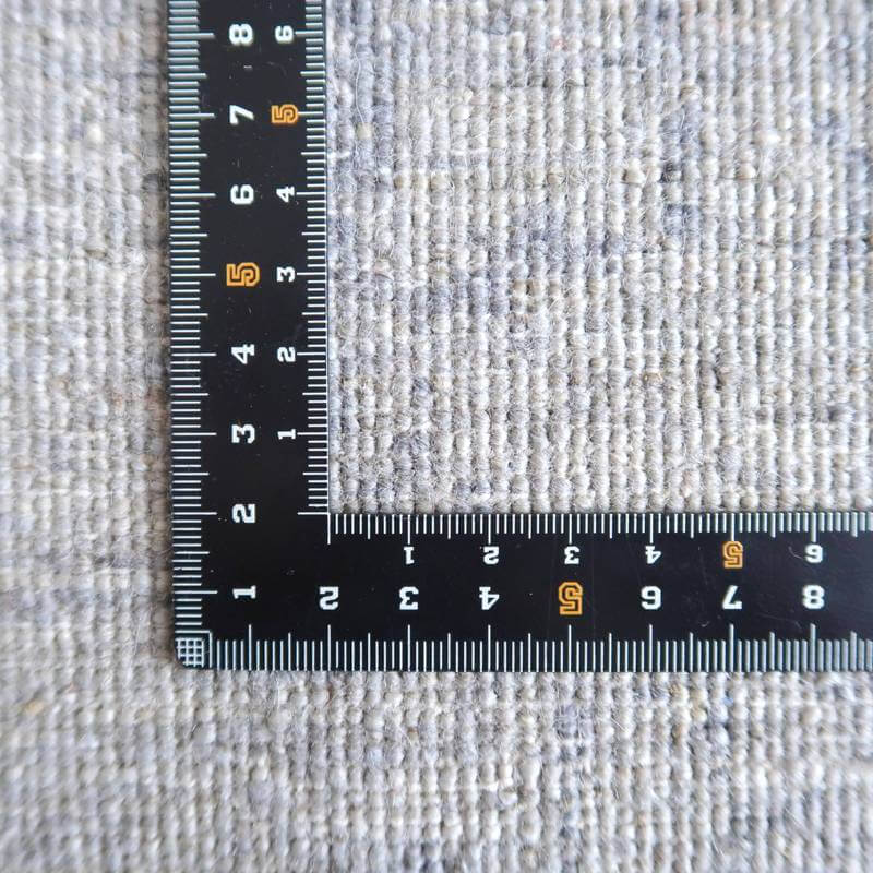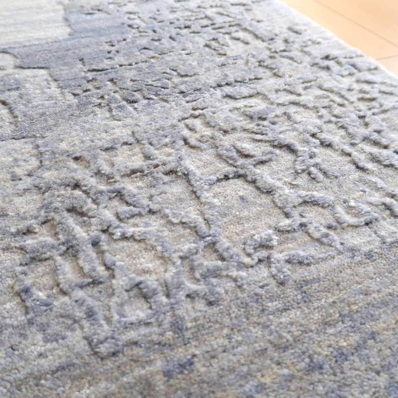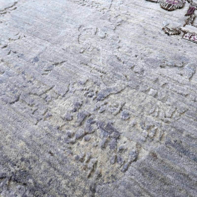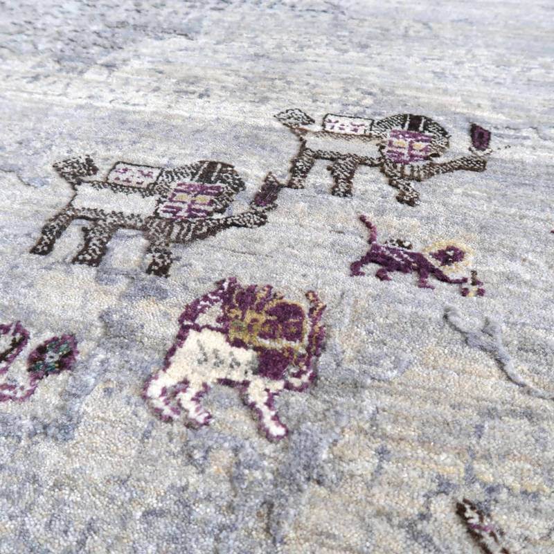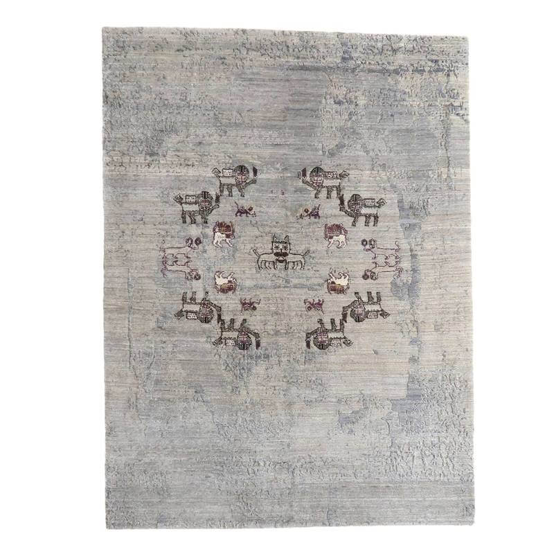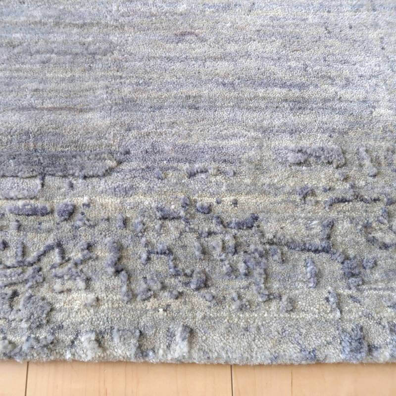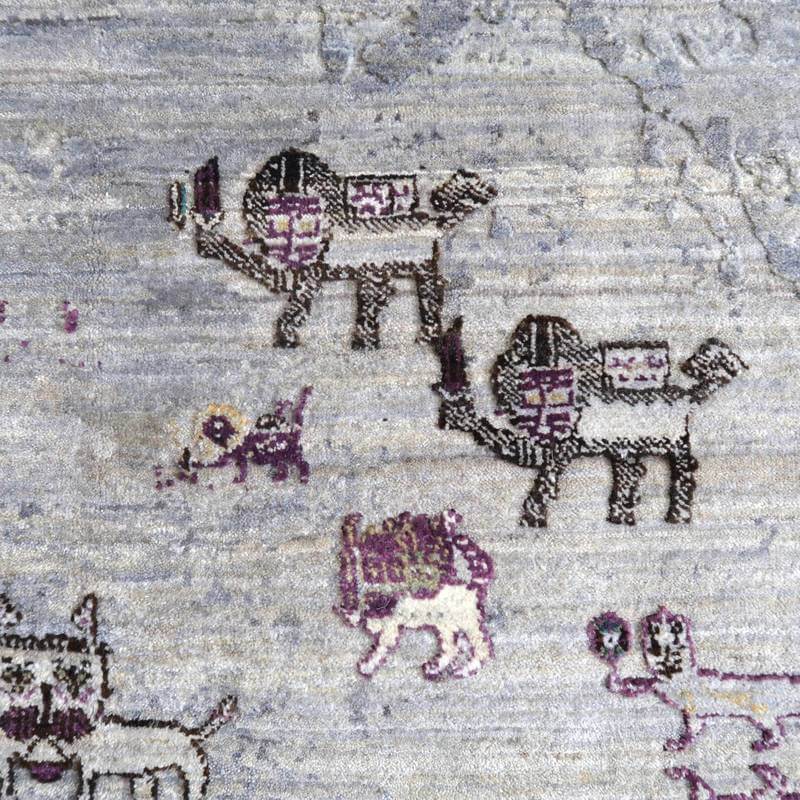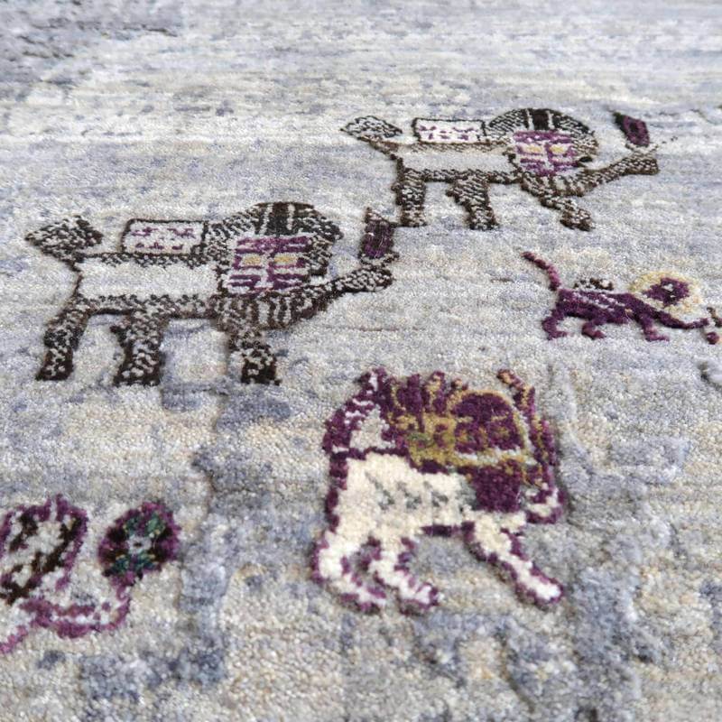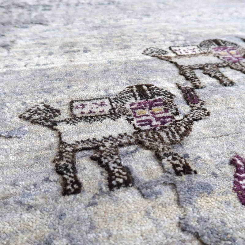 森か、はたまた雲の中か、剣を持ったライオンたちが対峙する世界が、幻想的なニュアンスカラーの中に表現されています。薄グレーと薄むらさき、薄水色が混ざり合ったグラデーションは、もともとのウールにあるアブラシ(色むらのグラデーション)のグレーベージュと融合して、何とも微妙な、くすみカラーとなっています。手バサミを使って、動物部分はもとより、パイルに凹凸をつけて、浮きたつ文様をセンターから円状に広がるようにデザインした革新的なアートデザインです。冬毛の柔らかな最高部位のウールのみを使用して細かく編んだ最上級のソフトな手触り。