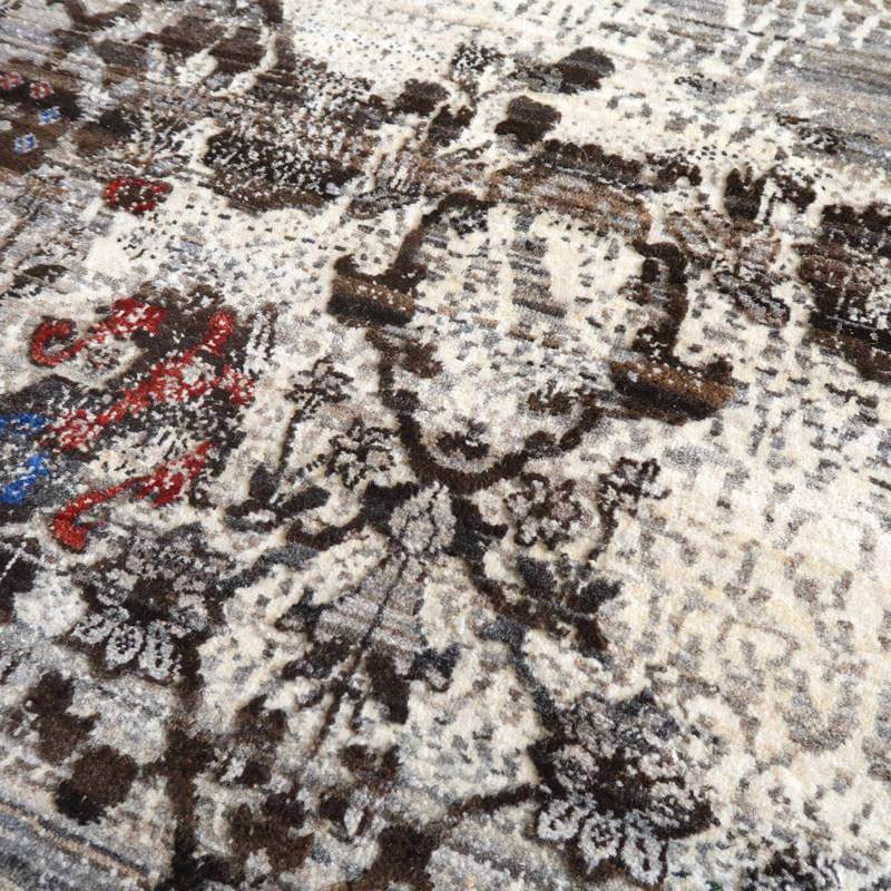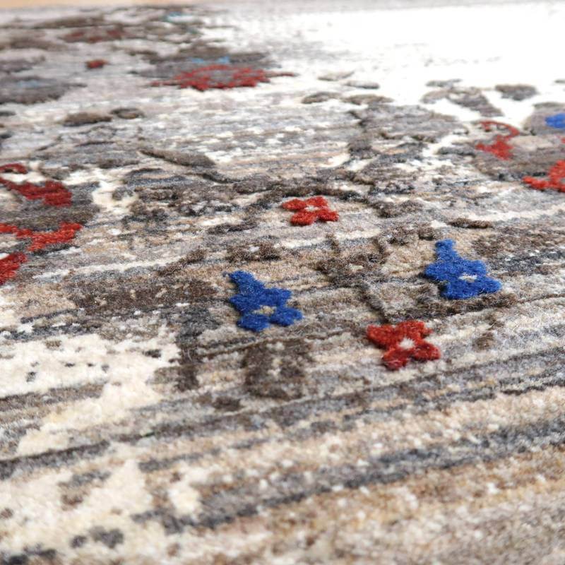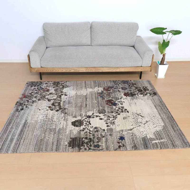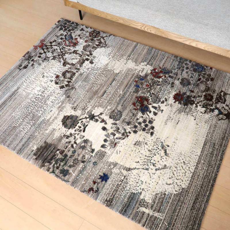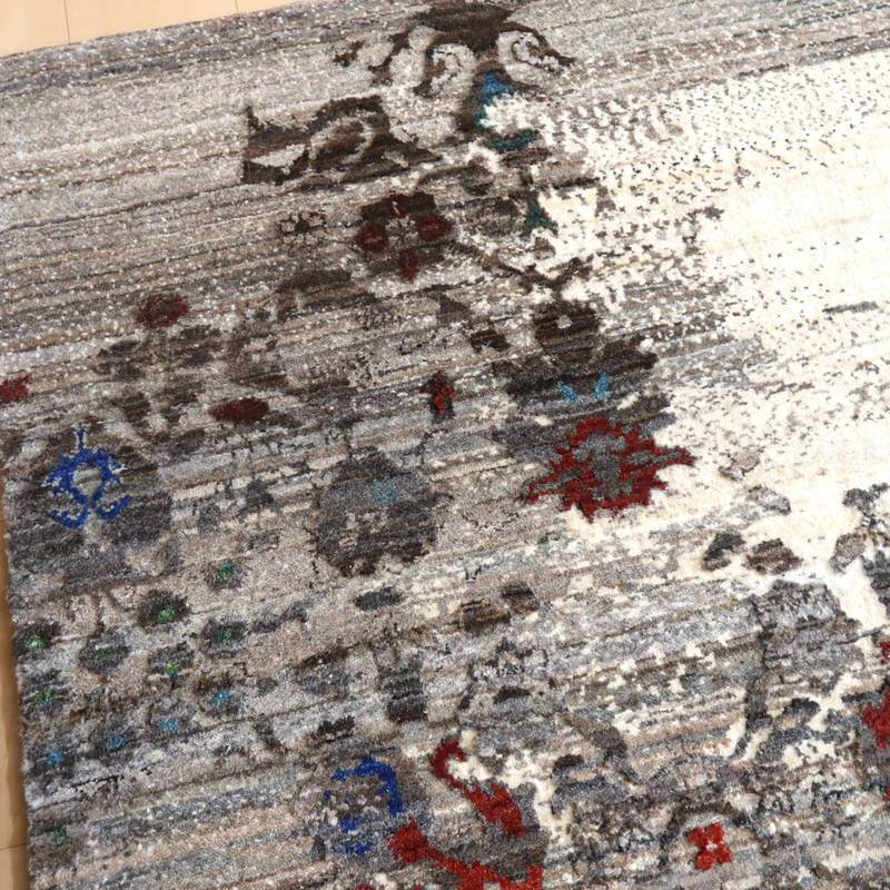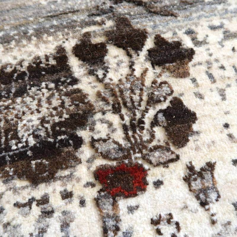 草花のモチーフが、曲線のライン状に咲く、流れるようなデザイン。手バサミでパイルに凹凸をつけて、模様を際立たせるように設計した革新的なテクニックが取り入れられています。赤と青の花の部分以外は、刈り取った羊の毛を染めずにそのまま利用しており、濃いめの茶・ベージュのアブラシ(色むらのグラデーション)が複雑にかかります。明るいアイボリーは大きなうねりのように、マダラ状の余韻を漂わせつつ混じり合った、斬新なアートデザインですが、天然素材のもつ和み素朴な風合いも感じられます。冬毛の柔らかな最高部位のウールのみを使用して細かく編んだ最上級のソフトな手触り。