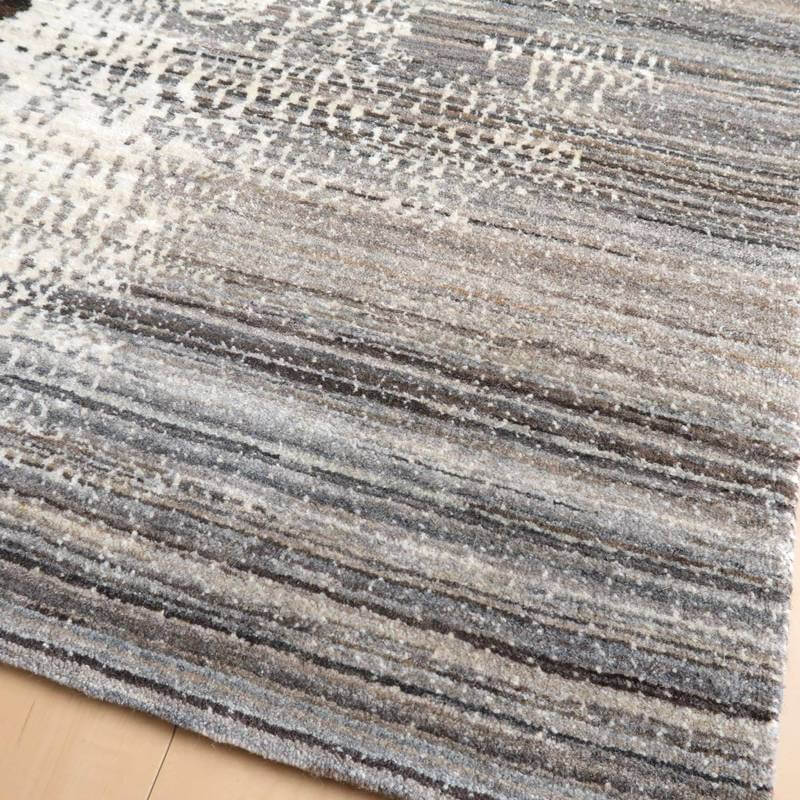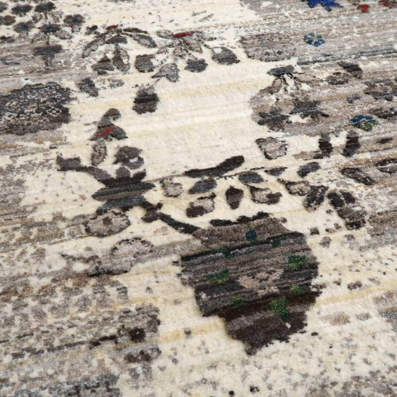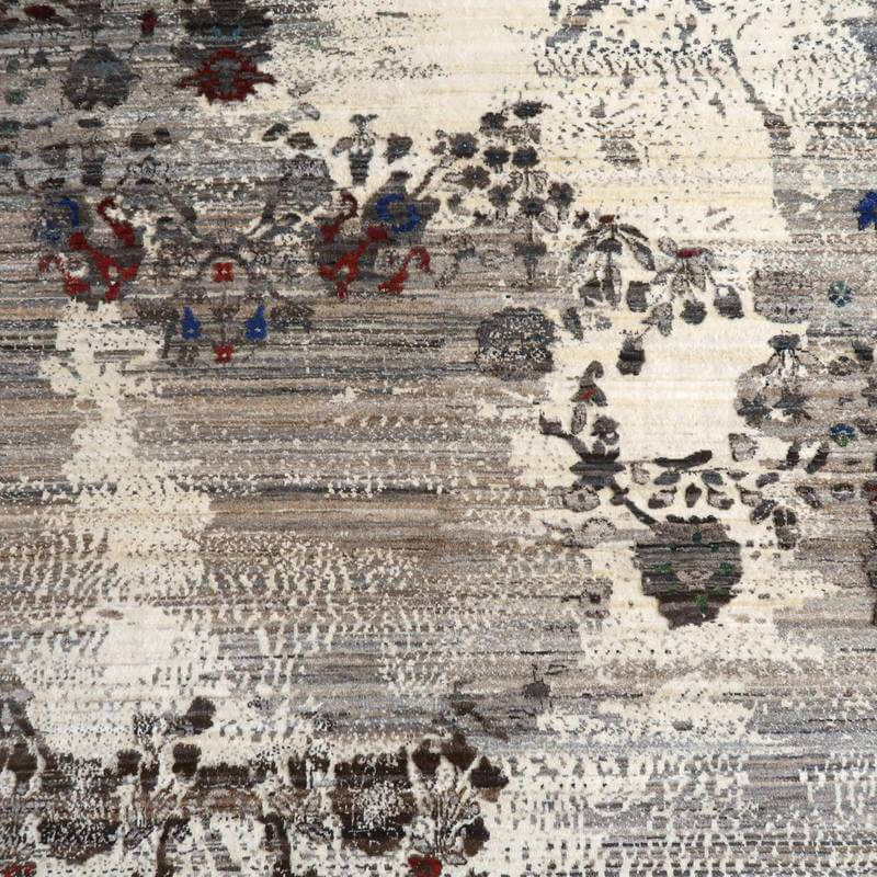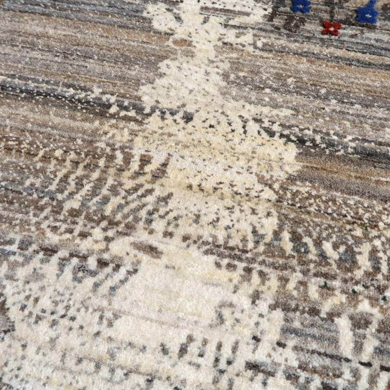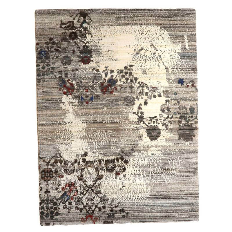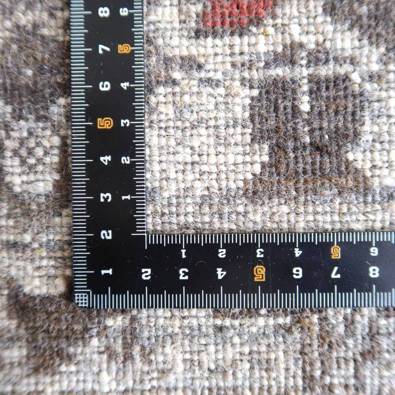 草花のモチーフが、曲線のライン状に咲く、流れるようなデザイン。手バサミでパイルに凹凸をつけて、模様を際立たせるように設計した革新的なテクニックが取り入れられています。赤と青の花の部分以外は、刈り取った羊の毛を染めずにそのまま利用しており、濃いめの茶・ベージュのアブラシ(色むらのグラデーション)が複雑にかかります。明るいアイボリーは大きなうねりのように、マダラ状の余韻を漂わせつつ混じり合った、斬新なアートデザインですが、天然素材のもつ和み素朴な風合いも感じられます。冬毛の柔らかな最高部位のウールのみを使用して細かく編んだ最上級のソフトな手触り。