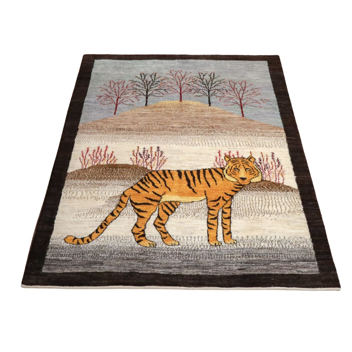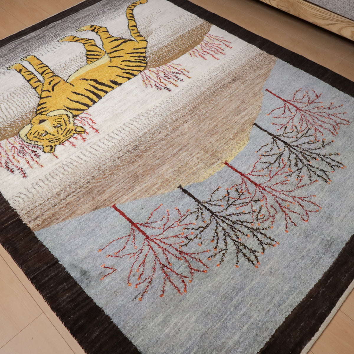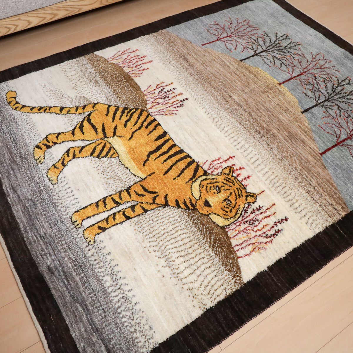 自然の風景を背景に力強い虎が描かれた、独特のデザインが魅力のギャッベです。美しい茶色のアブラシ(色むらのグラデーション)を基調とした山や丘には、生命の木や植物が描かれています。落ち着いた色合いの中に自然の力強さを感じさせてくれる、個性的な一枚です。