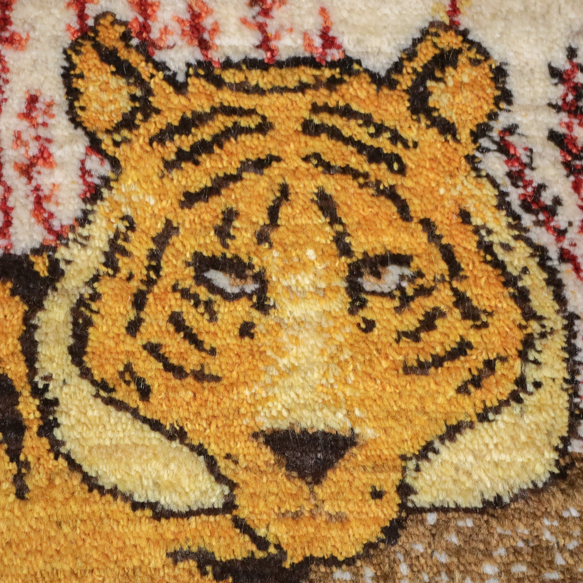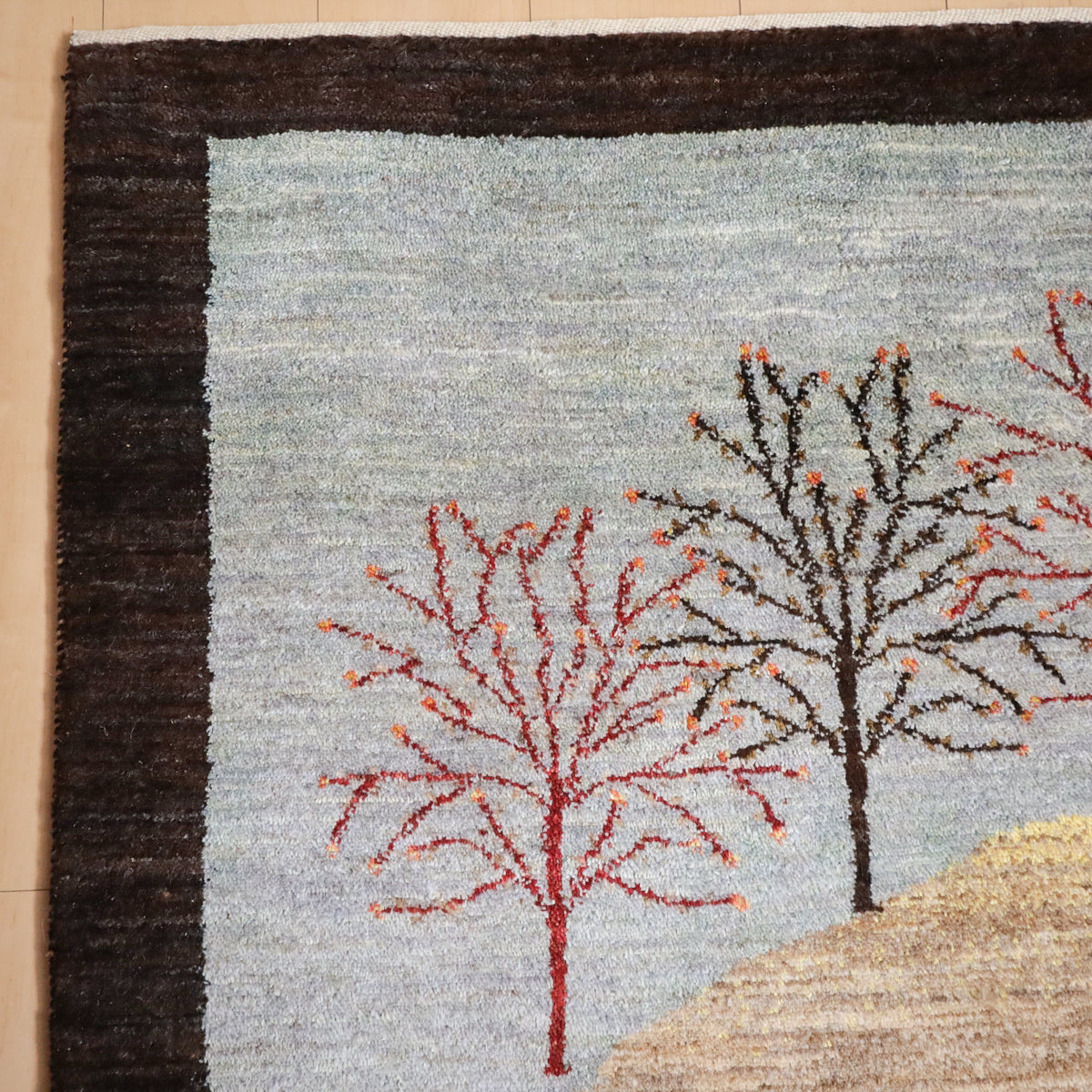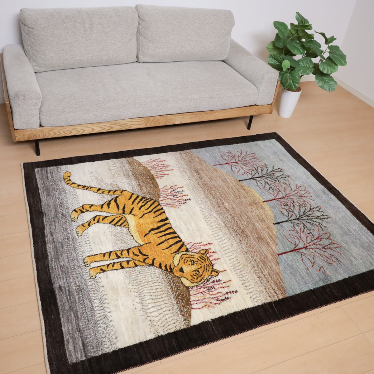 自然の風景を背景に力強い虎が描かれた、独特のデザインが魅力のギャッベです。美しい茶色のアブラシ(色むらのグラデーション)を基調とした山や丘には、生命の木や植物が描かれています。落ち着いた色合いの中に自然の力強さを感じさせてくれる、個性的な一枚です。