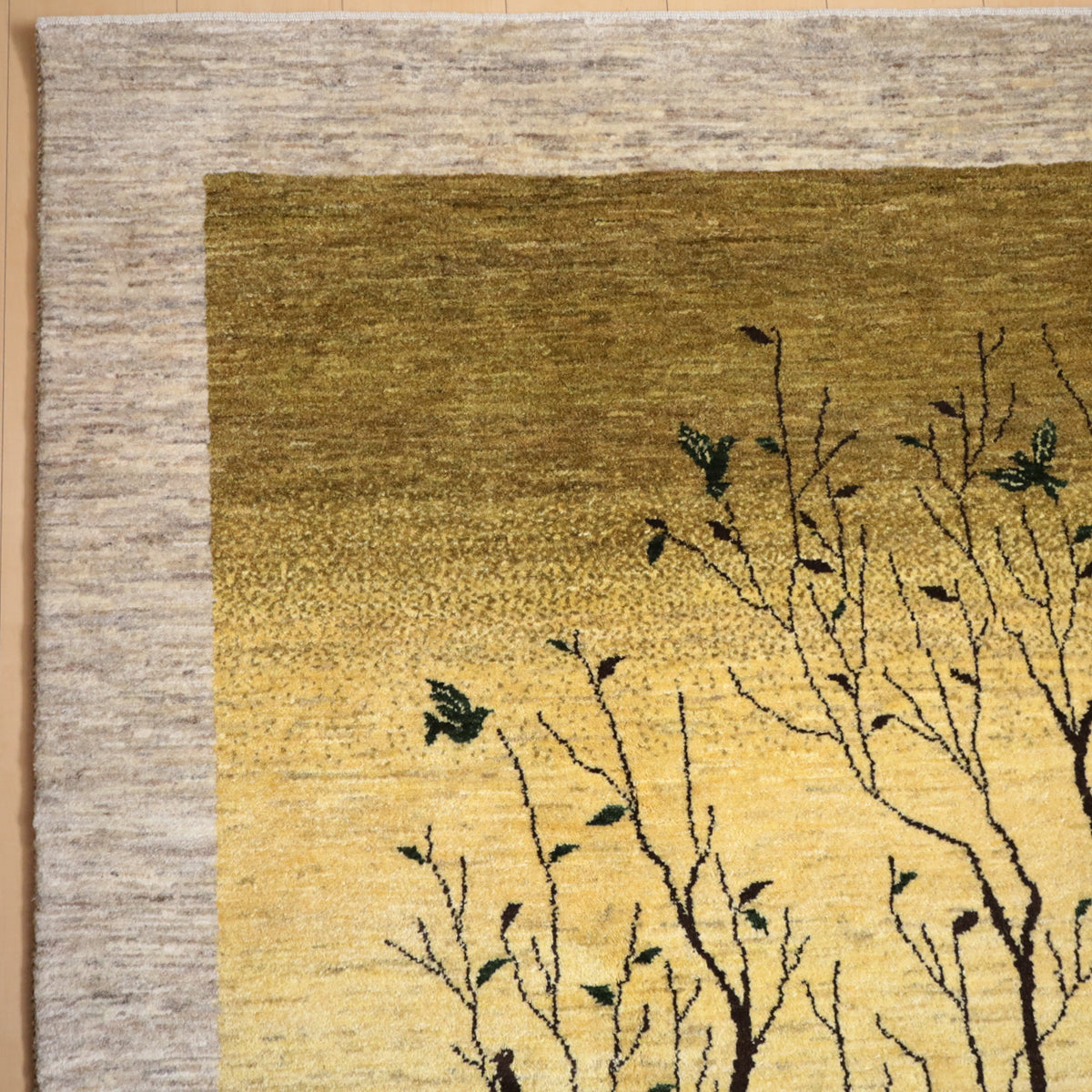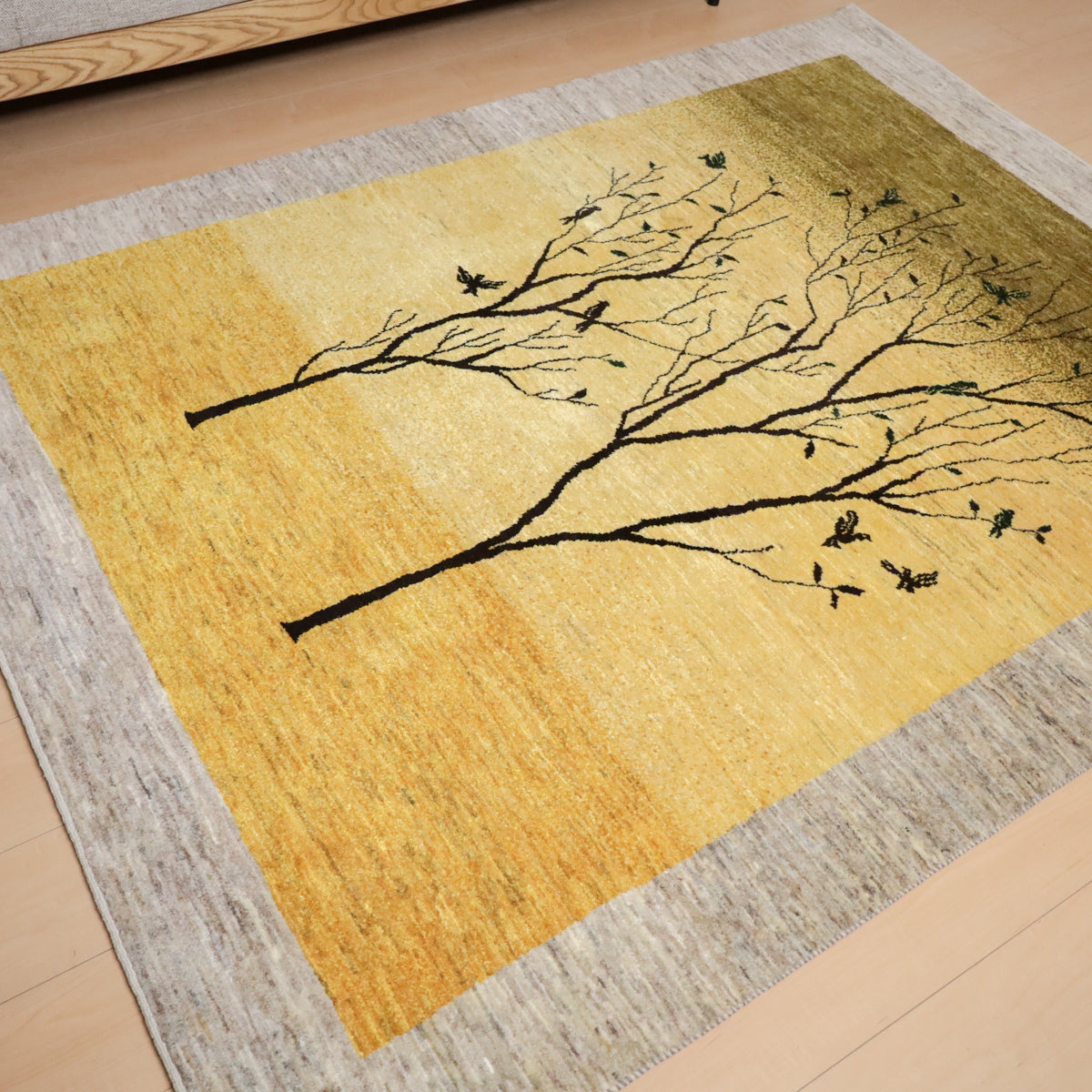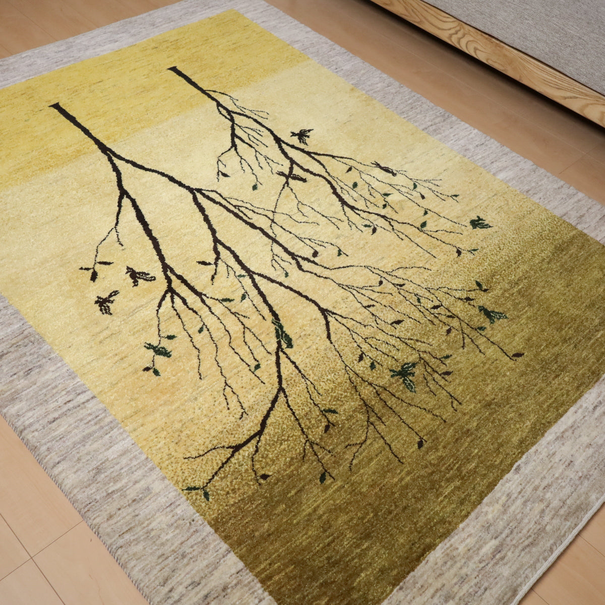 黄色から暗い黄緑への美しいグラデーションを基調としたこのギャッベには、黒い枝が印象的に描かれています。枝には鳥が舞い、自然の静かな動きを感じさせるデザインです。周囲の柔らかい生成りのフレームが、全体の落ち着いた雰囲気を引き立てています。お部屋に自然の温もりと優雅な彩りをもたらす一枚です。