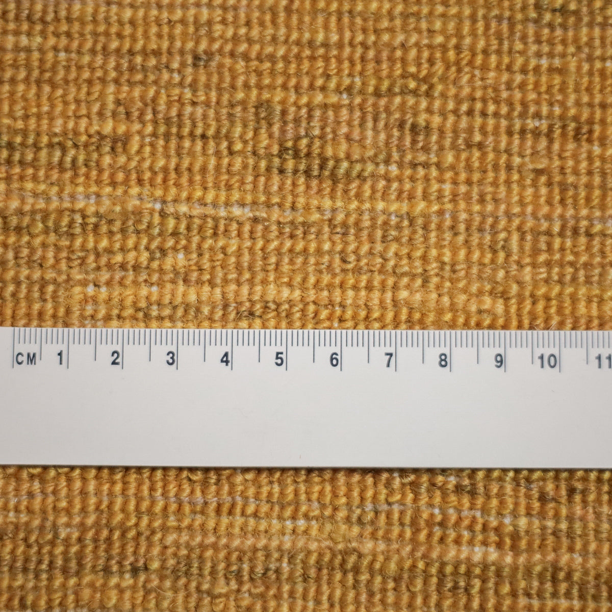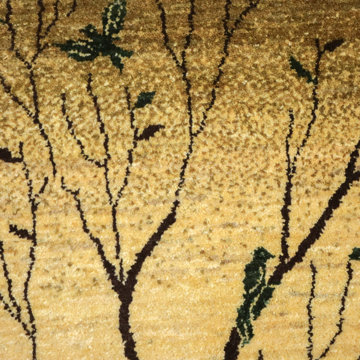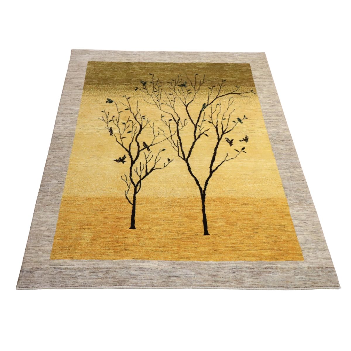 黄色から暗い黄緑への美しいグラデーションを基調としたこのギャッベには、黒い枝が印象的に描かれています。枝には鳥が舞い、自然の静かな動きを感じさせるデザインです。周囲の柔らかい生成りのフレームが、全体の落ち着いた雰囲気を引き立てています。お部屋に自然の温もりと優雅な彩りをもたらす一枚です。