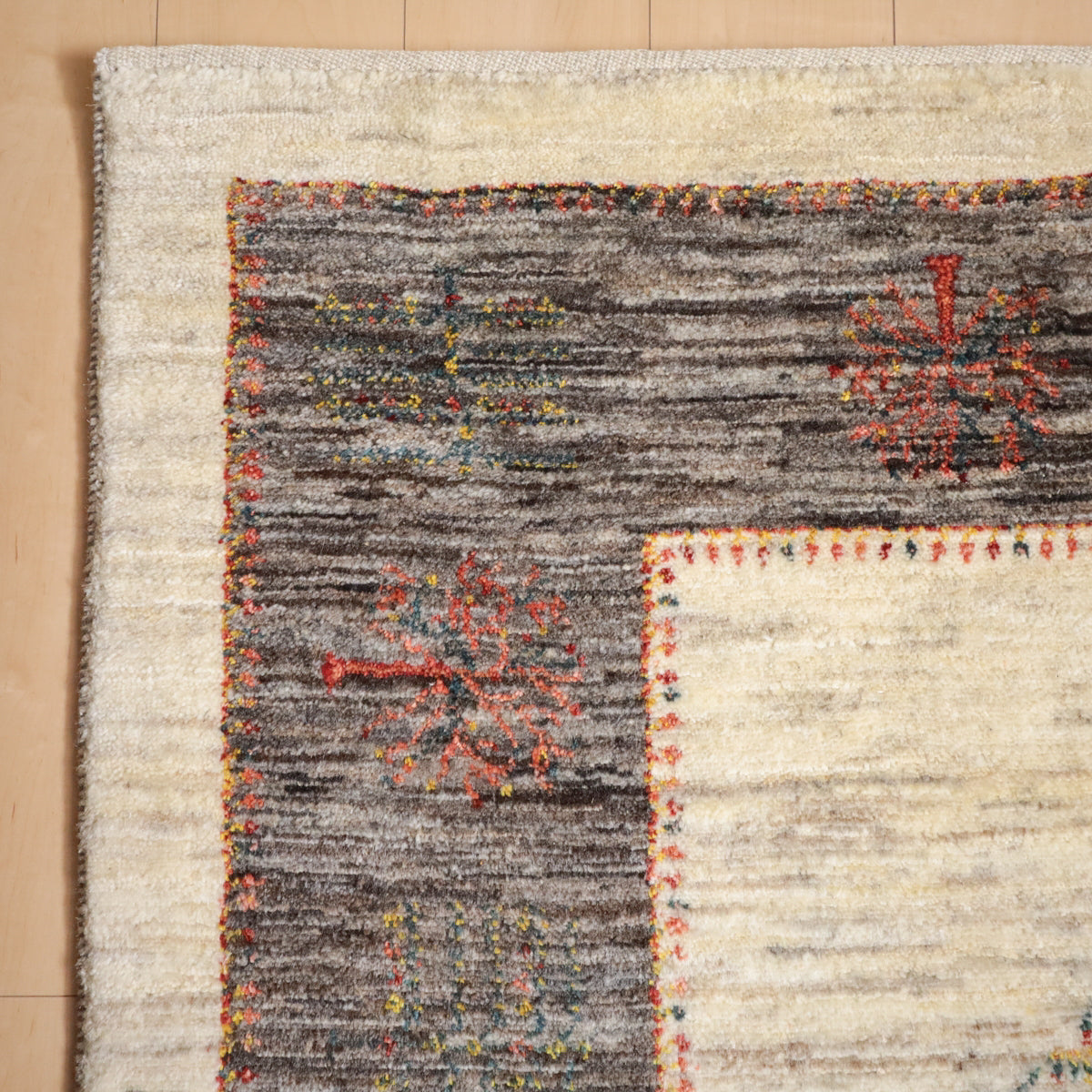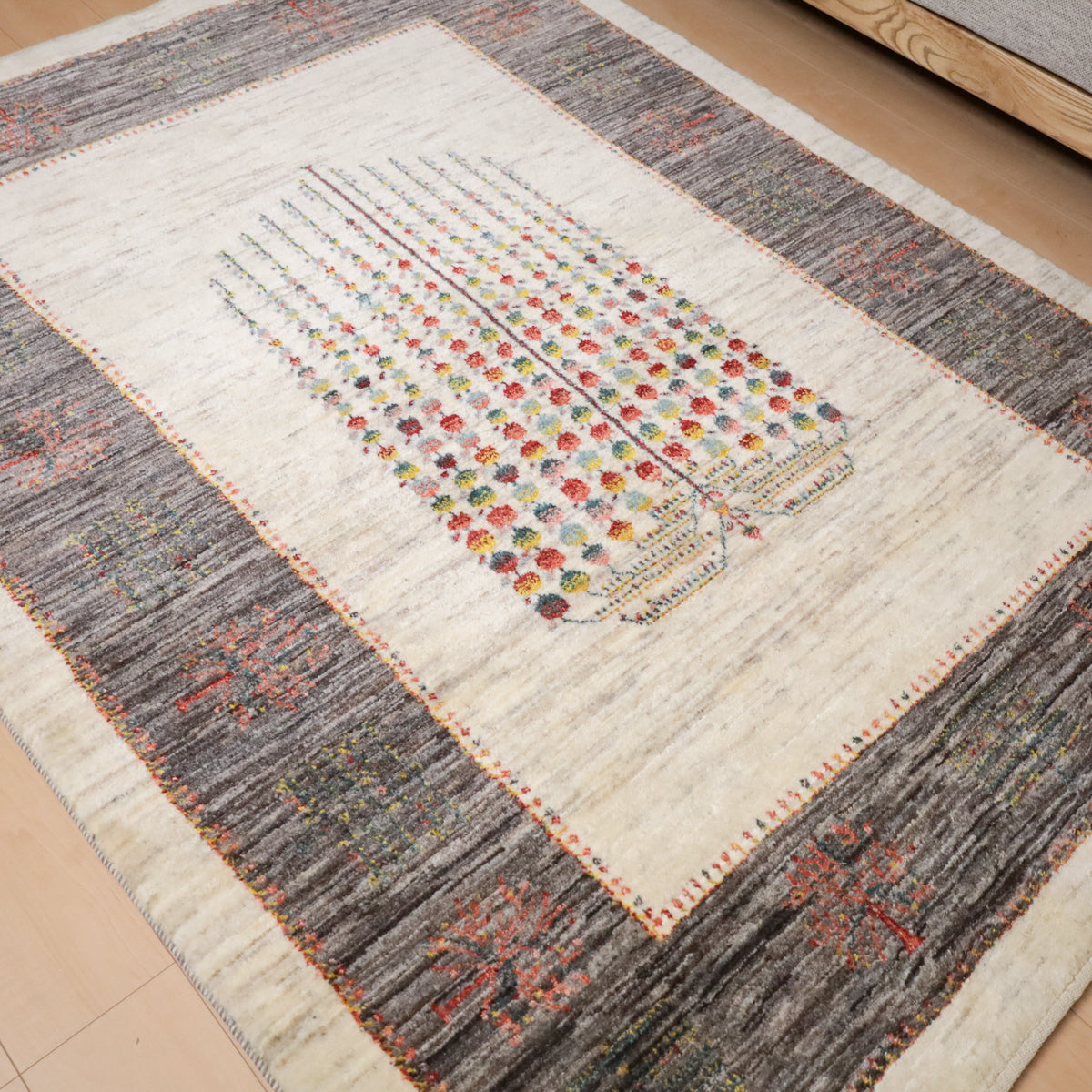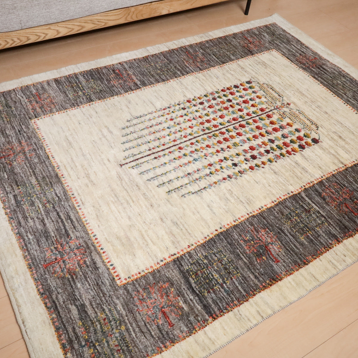 羊の毛色を生かした生成りを基調にしたこのギャッベには、中心に華やかでカラフルな生命の木のモチーフが描かれています。垂れ下がるよう小さな実が並ぶ様子はシャンデリアのようで、繊細でありながらも可愛らしいデザインです。周囲のフレーム部分には、灰茶を基調にした背景に落ち着いた色彩で描かれた木々のモチーフが配され、さり気ない色彩とデザインのアクセントになっています。和やかさと華やかさを兼ね備えた、魅力あふれる一枚です。