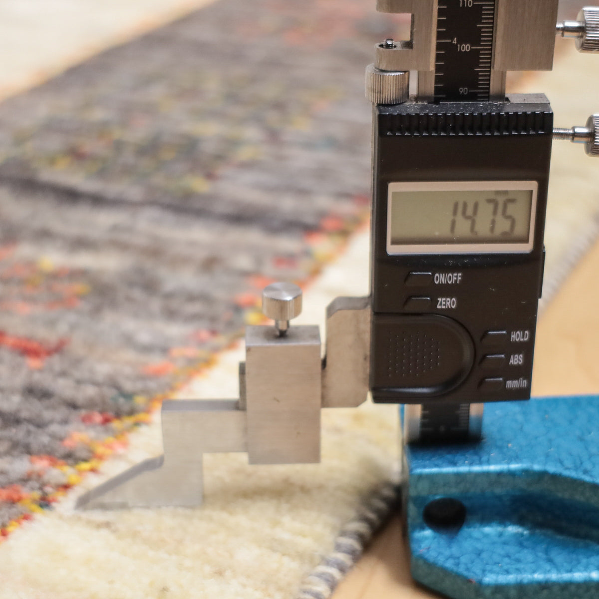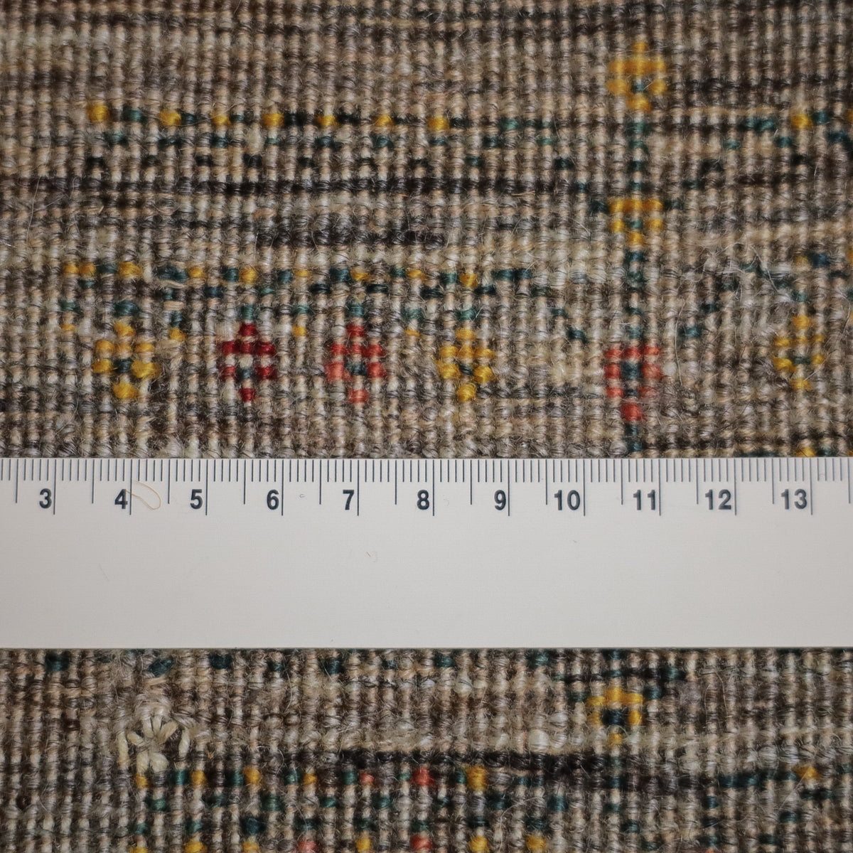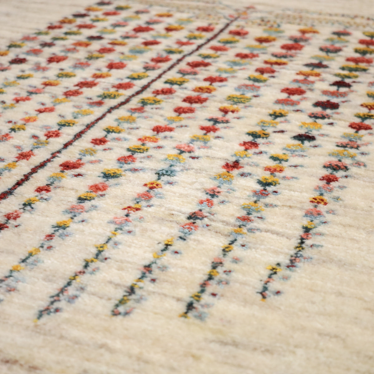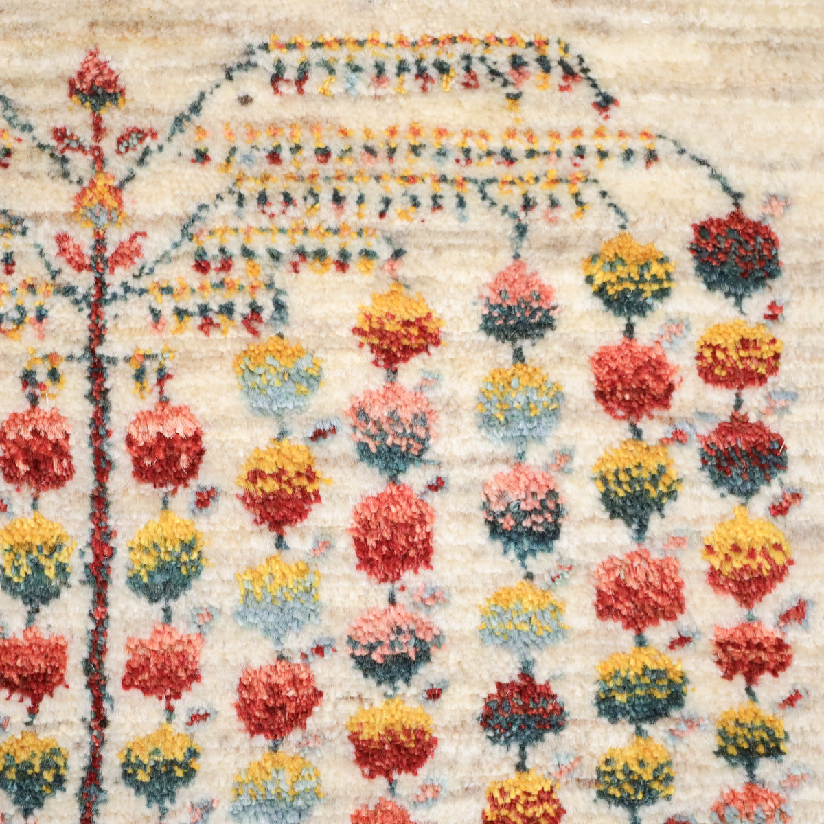 羊の毛色を生かした生成りを基調にしたこのギャッベには、中心に華やかでカラフルな生命の木のモチーフが描かれています。垂れ下がるよう小さな実が並ぶ様子はシャンデリアのようで、繊細でありながらも可愛らしいデザインです。周囲のフレーム部分には、灰茶を基調にした背景に落ち着いた色彩で描かれた木々のモチーフが配され、さり気ない色彩とデザインのアクセントになっています。和やかさと華やかさを兼ね備えた、魅力あふれる一枚です。