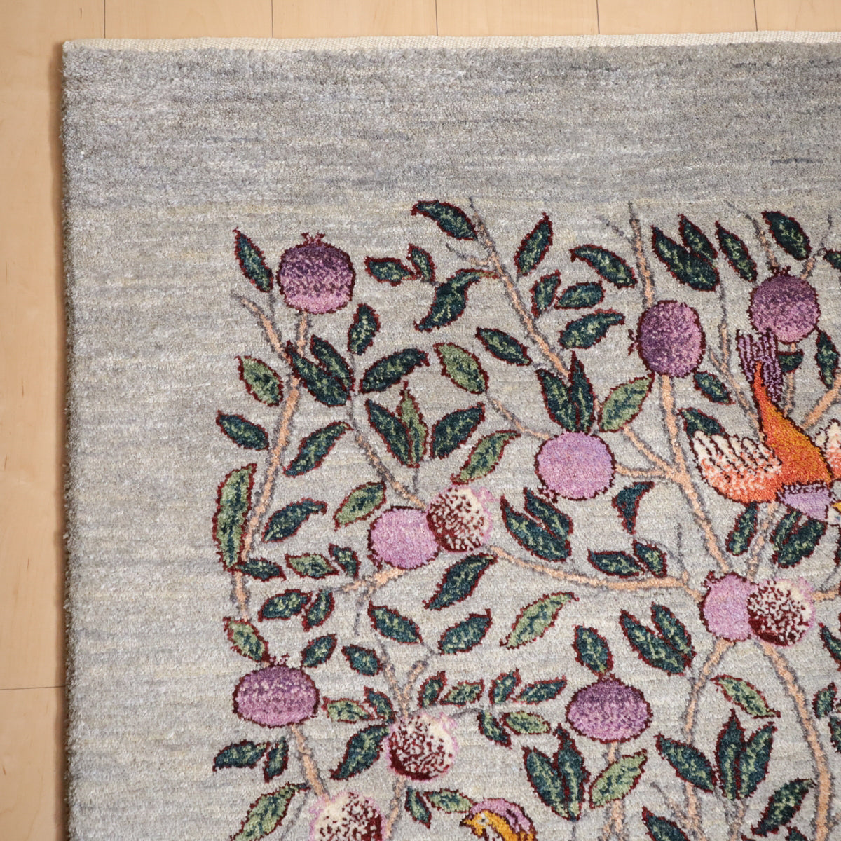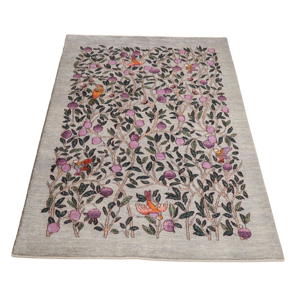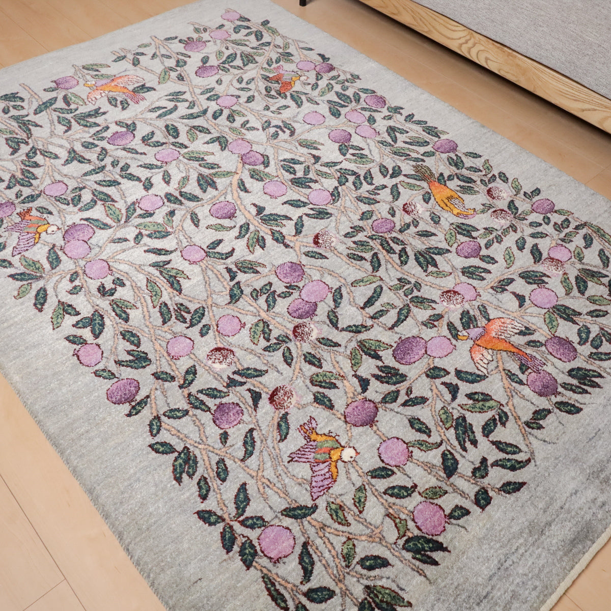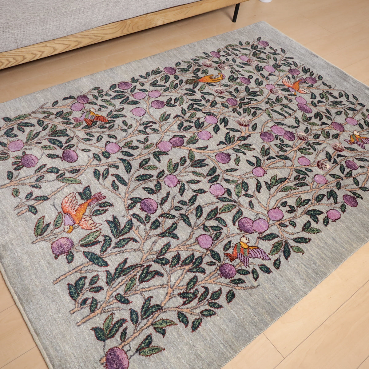 落ち着いたグレーを基調に、一面に大きな実が実る柘榴の木が描かれたギャッベです。所々にカラフルな鳥たちも飛び交い、デザインに賑やかさを加えつつと色彩のアクセントとなっています。お部屋に和やかさと安らぎをもたらしてくれる一枚です。