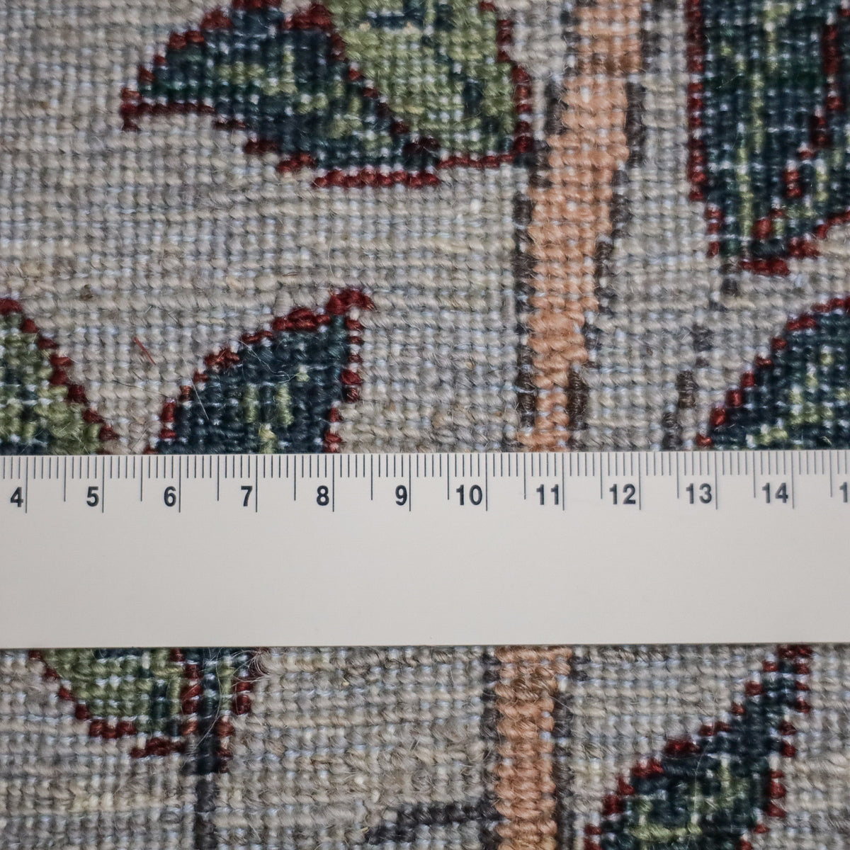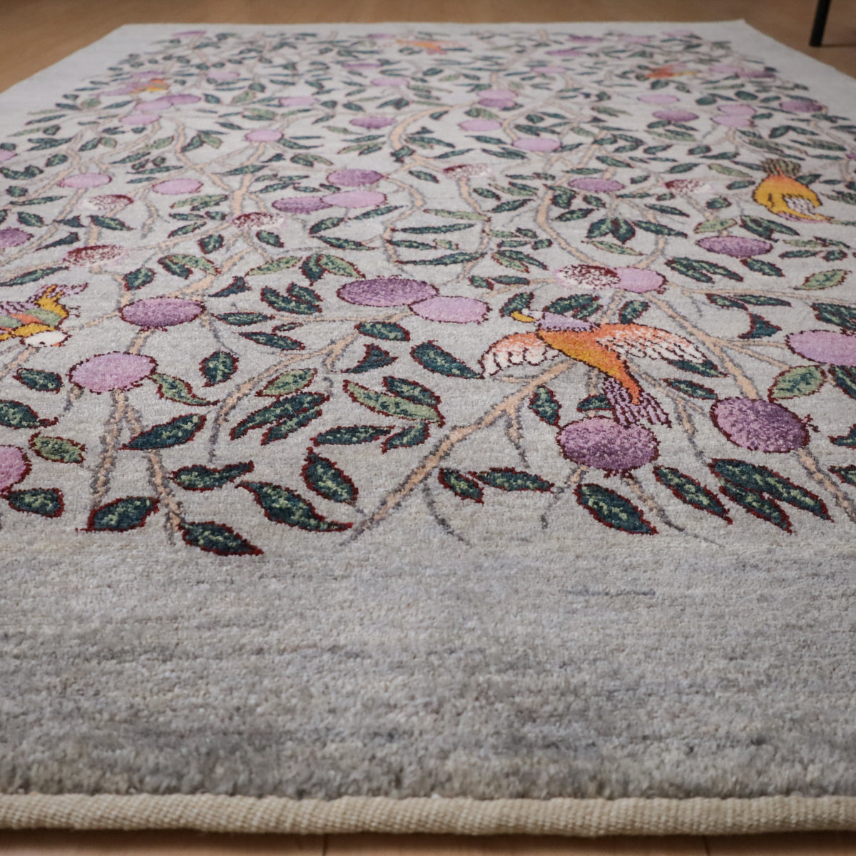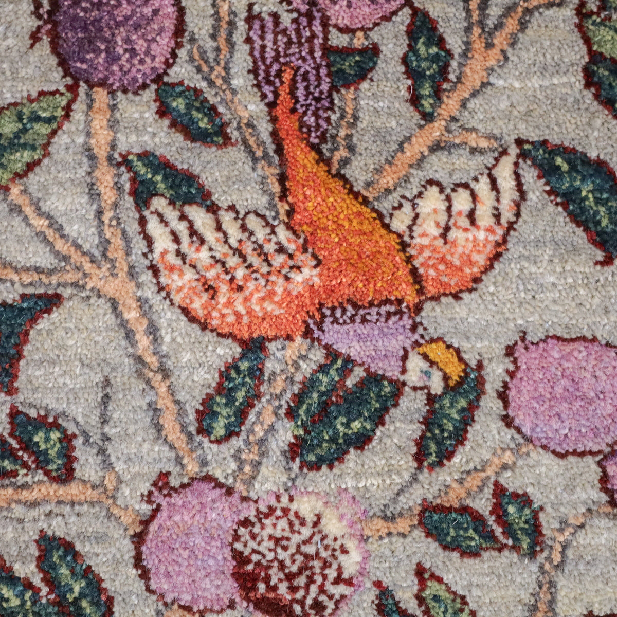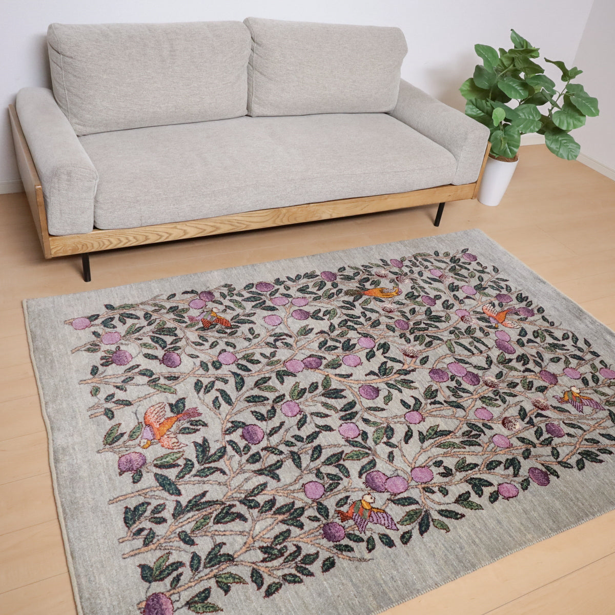 落ち着いたグレーを基調に、一面に大きな実が実る柘榴の木が描かれたギャッベです。所々にカラフルな鳥たちも飛び交い、デザインに賑やかさを加えつつと色彩のアクセントとなっています。お部屋に和やかさと安らぎをもたらしてくれる一枚です。