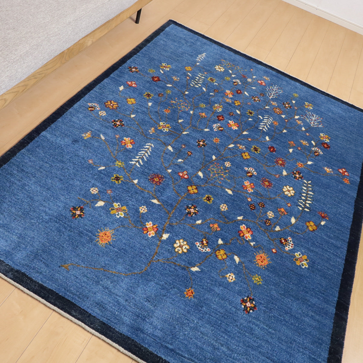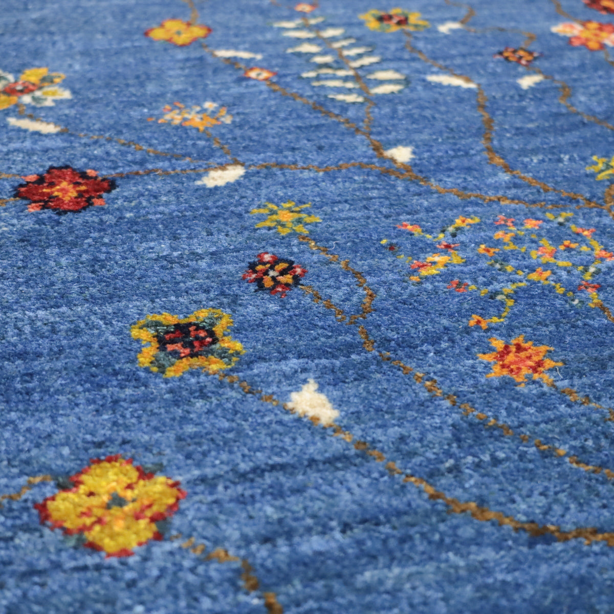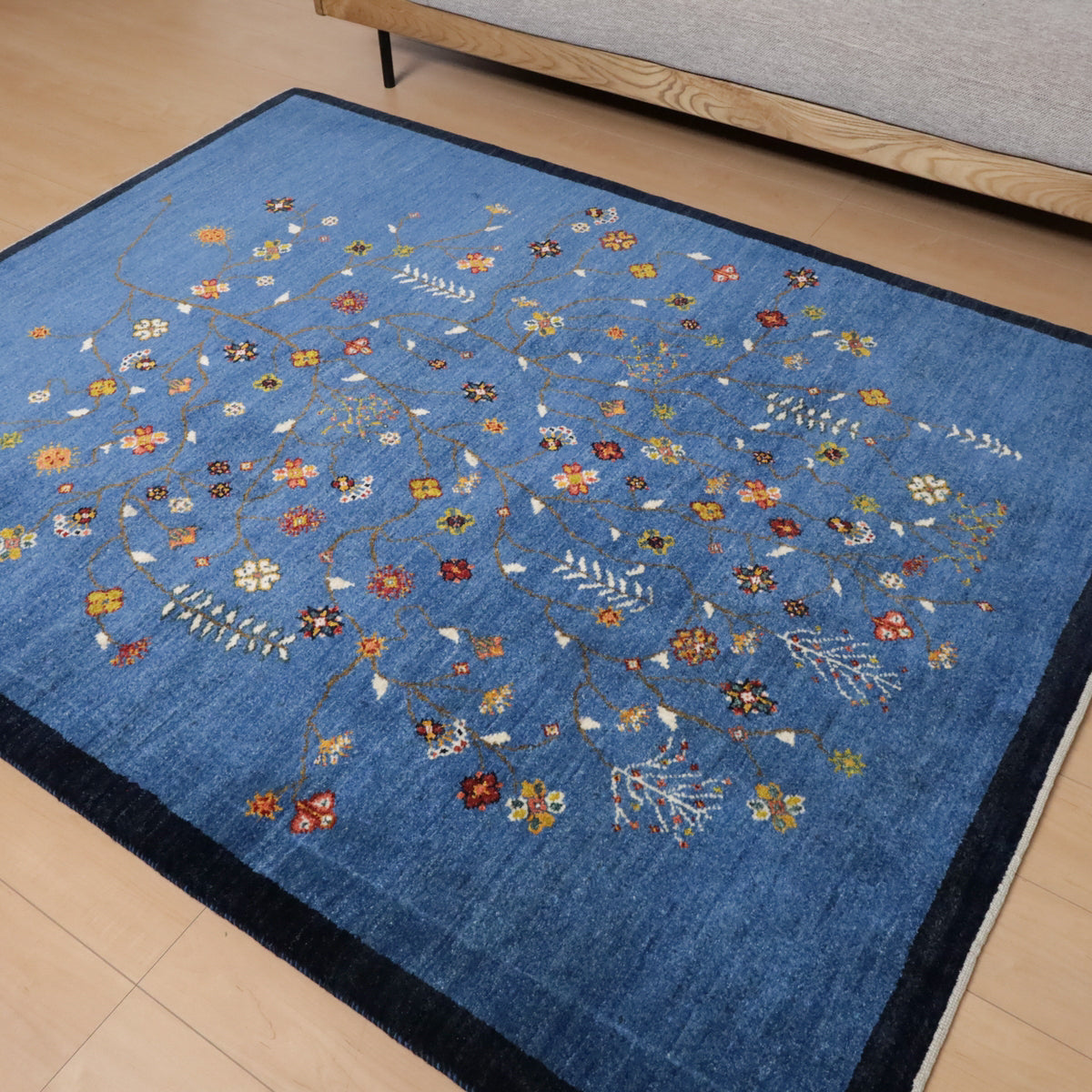 鮮やかな青を基調にしたこのギャッベは、カラフルな花のモチーフが印象的に描かれています。赤、橙、黄色などの花々が散りばめられ、まるで花畑のような美しさを感じさせます。繊細な枝と葉のデザインが全体に広がり、お部屋に華やかさと温かみをもたらします。