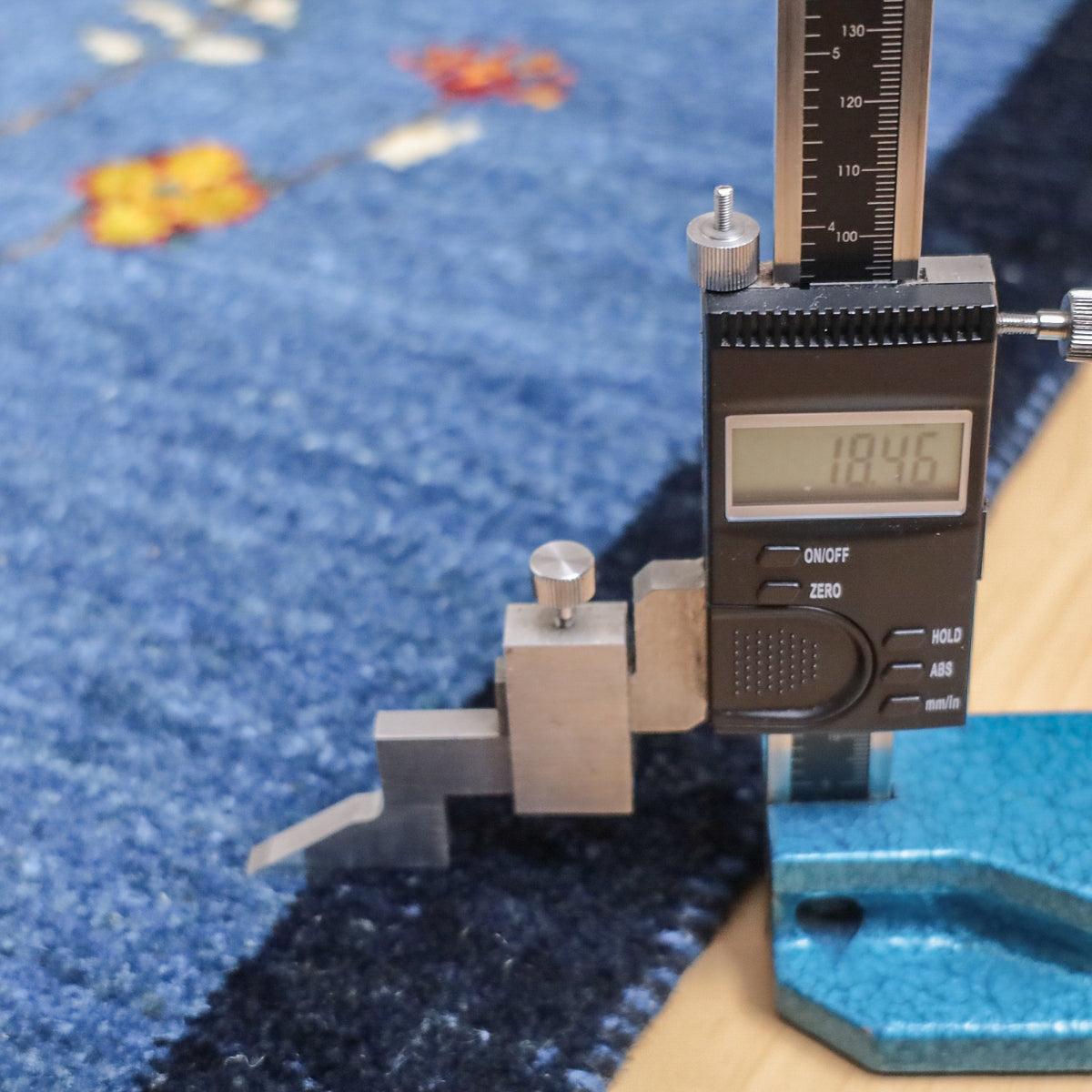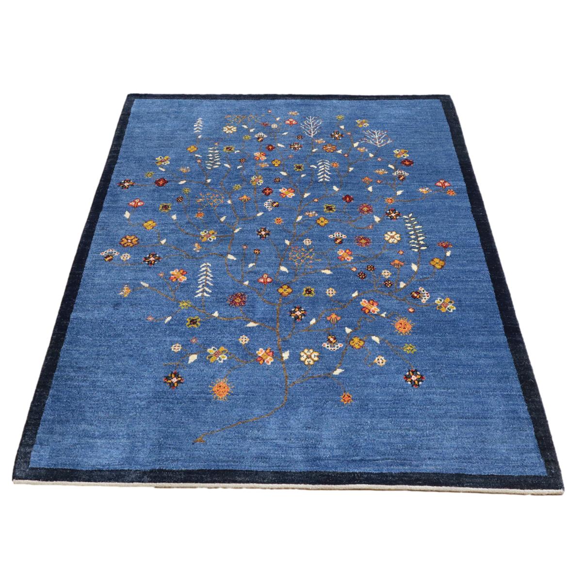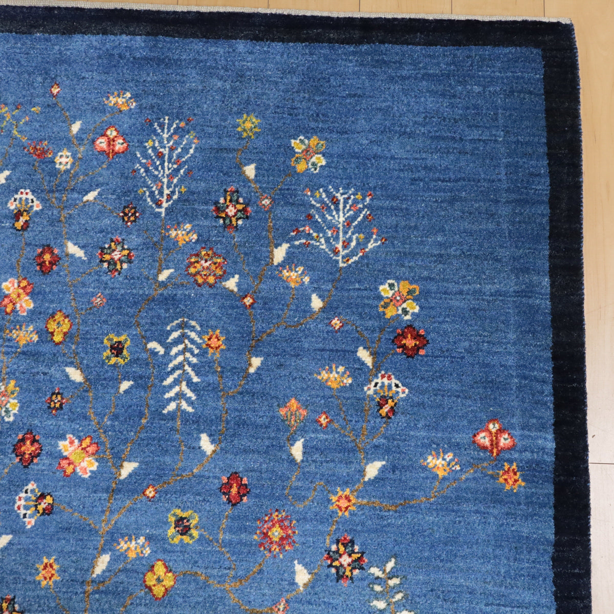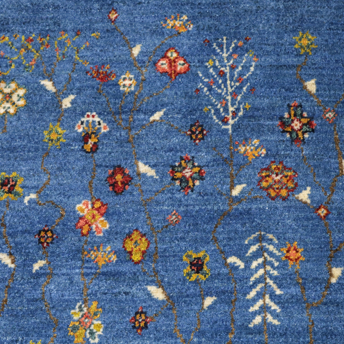 鮮やかな青を基調にしたこのギャッベは、カラフルな花のモチーフが印象的に描かれています。赤、橙、黄色などの花々が散りばめられ、まるで花畑のような美しさを感じさせます。繊細な枝と葉のデザインが全体に広がり、お部屋に華やかさと温かみをもたらします。