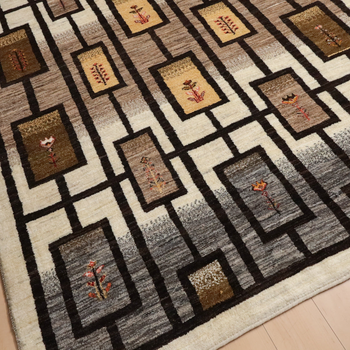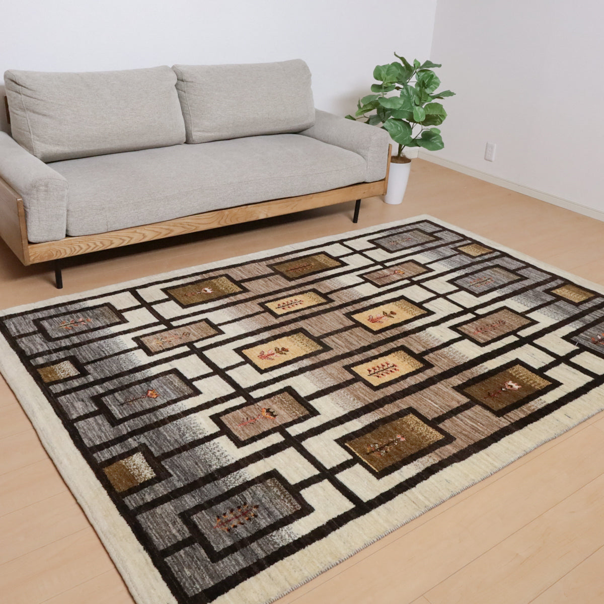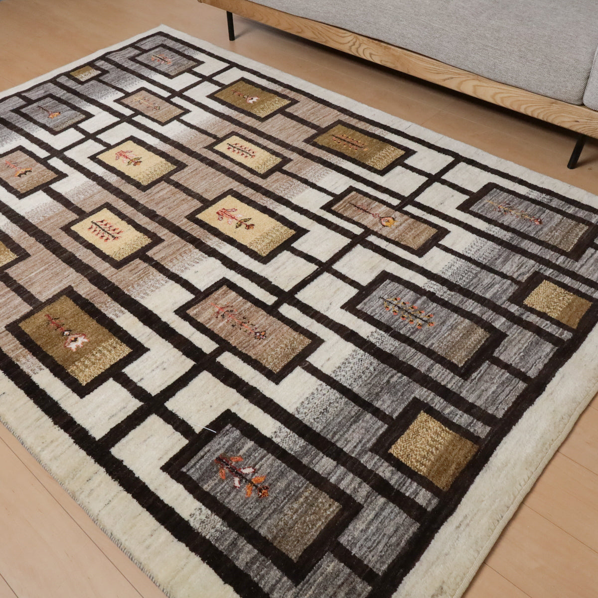 羊の毛色を生かした生成りを基調に、濃い茶色で四角の模様が印象的に描かれています。茶色やグレーの濃淡の中にカラフルな小さなモチーフが点在し、全体に動きとリズムを感じさせます。モダンでありながらも温かみのあるデザインが、お部屋に落ち着いた雰囲気をもたらし、洗練された空間を演出します。