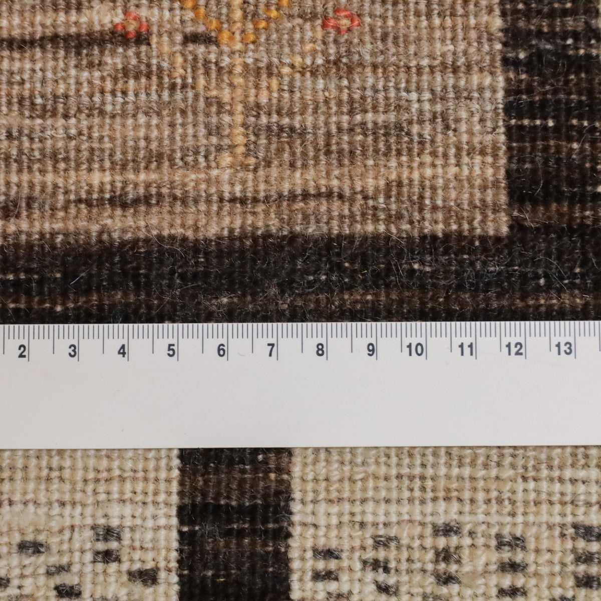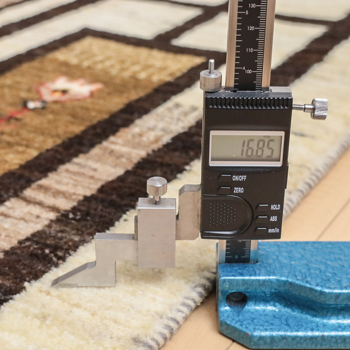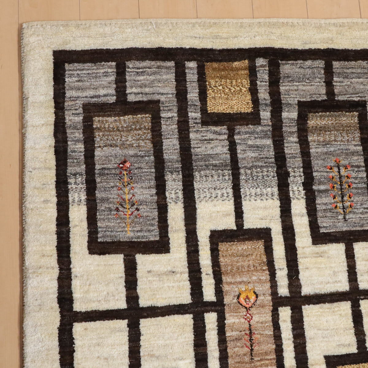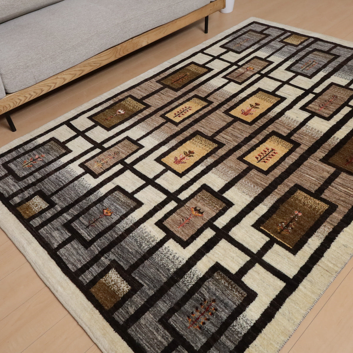 羊の毛色を生かした生成りを基調に、濃い茶色で四角の模様が印象的に描かれています。茶色やグレーの濃淡の中にカラフルな小さなモチーフが点在し、全体に動きとリズムを感じさせます。モダンでありながらも温かみのあるデザインが、お部屋に落ち着いた雰囲気をもたらし、洗練された空間を演出します。