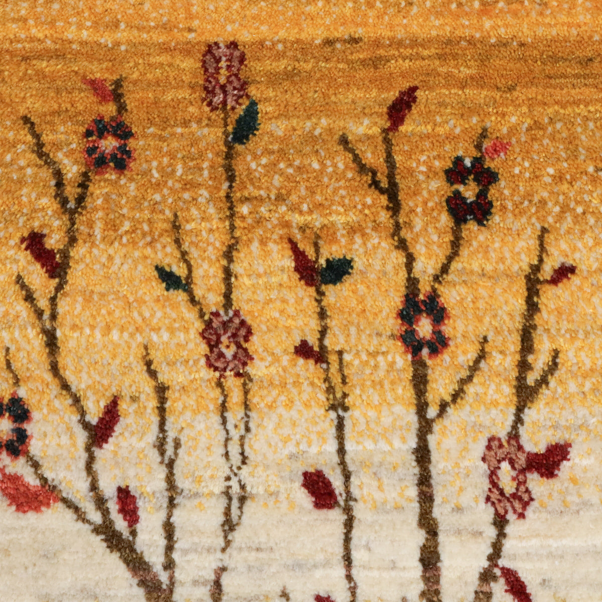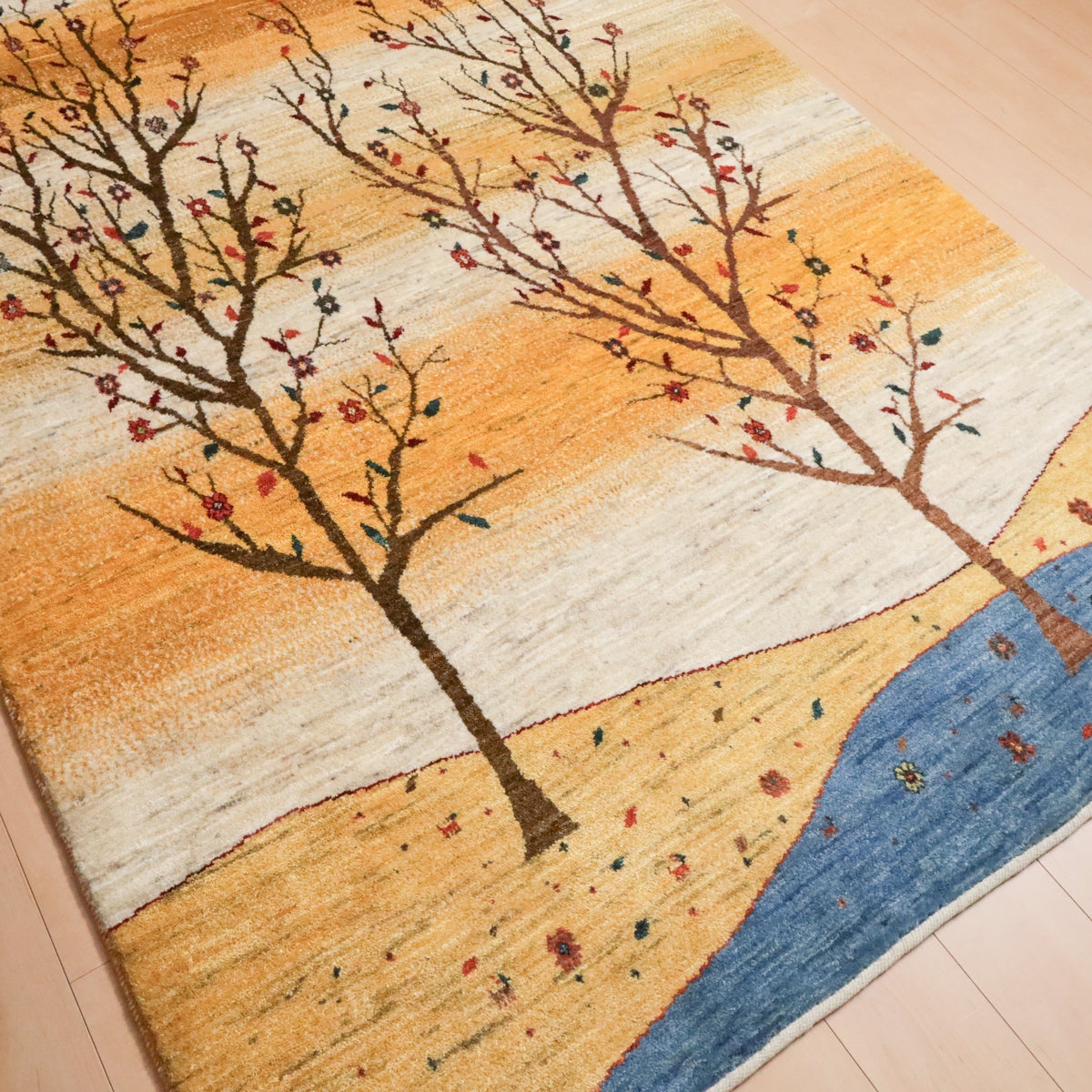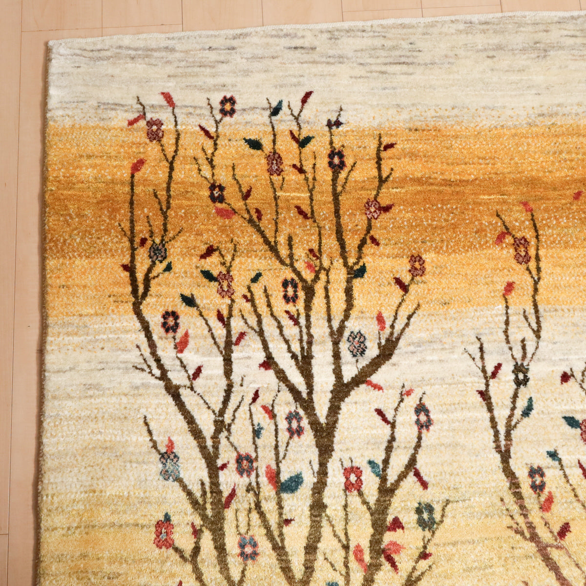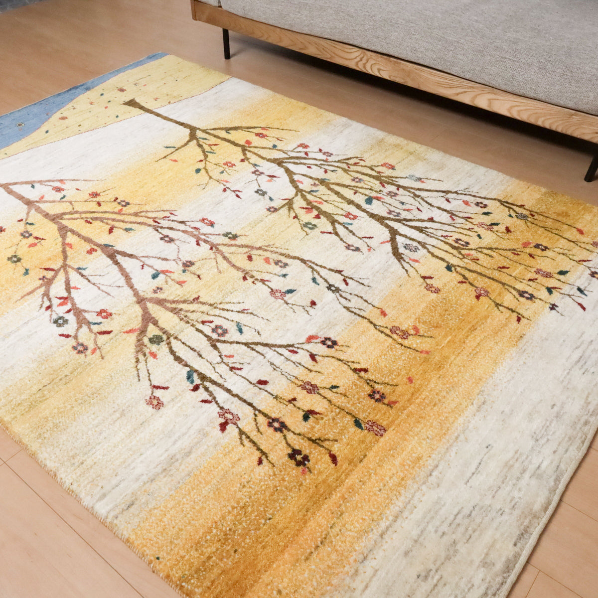 暖みのある黄色と羊の毛色を生かした生成りを基調にしたこのギャッベは、二本の生命の木のモチーフが印象的に描かれています。枝にはカラフルな花々が描かれ、大地の青も美しいアクセントになっています。背景の柔らかなグラデーションが全体に調和と落ち着きを与えています。お部屋に温かみと明るさをもたらしてくれる一枚です。