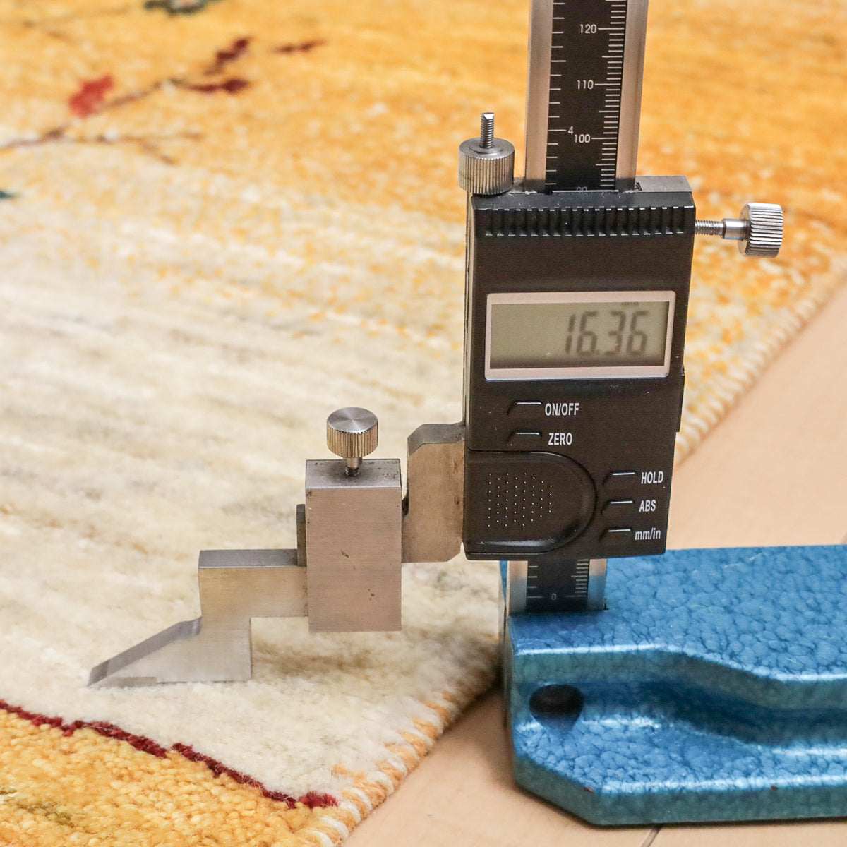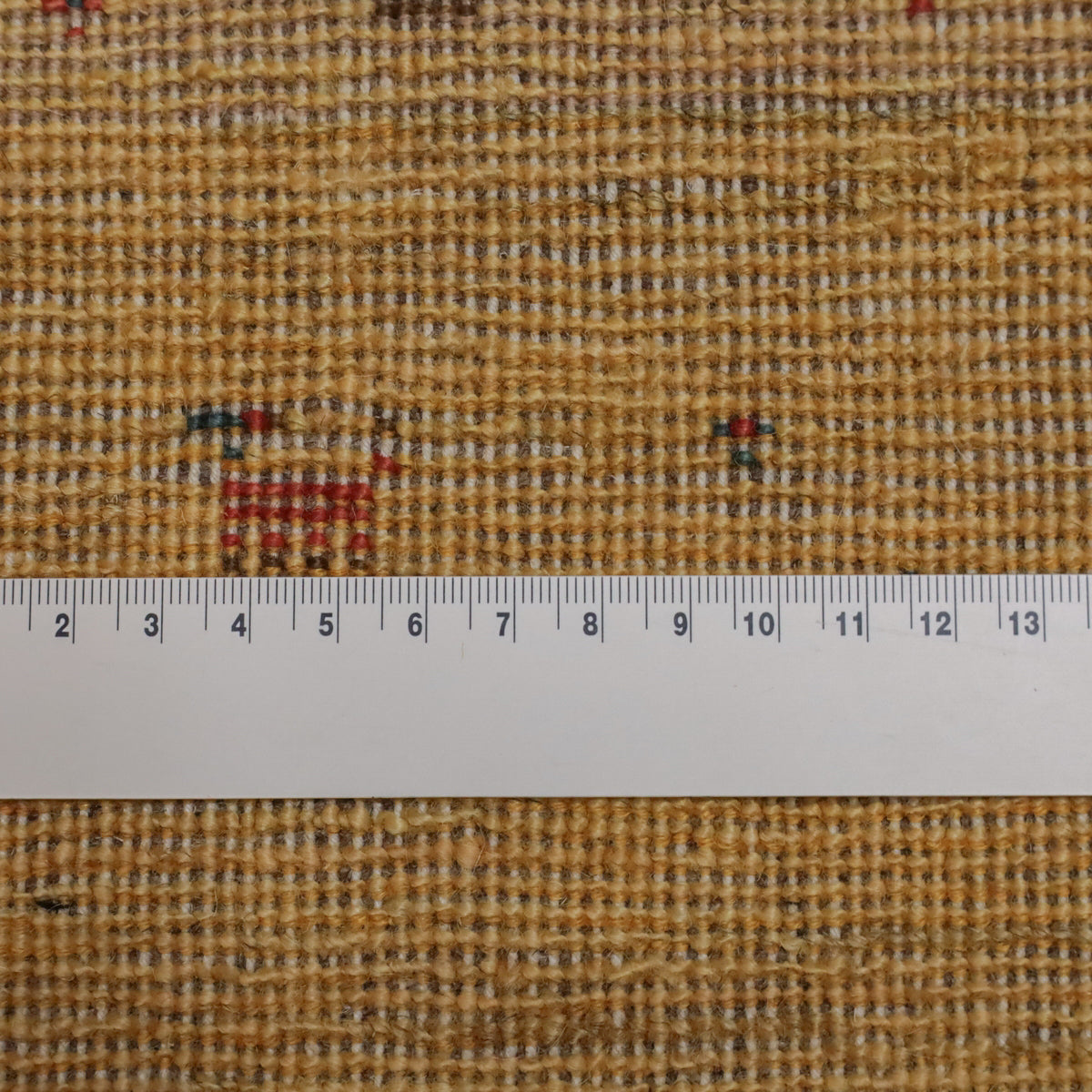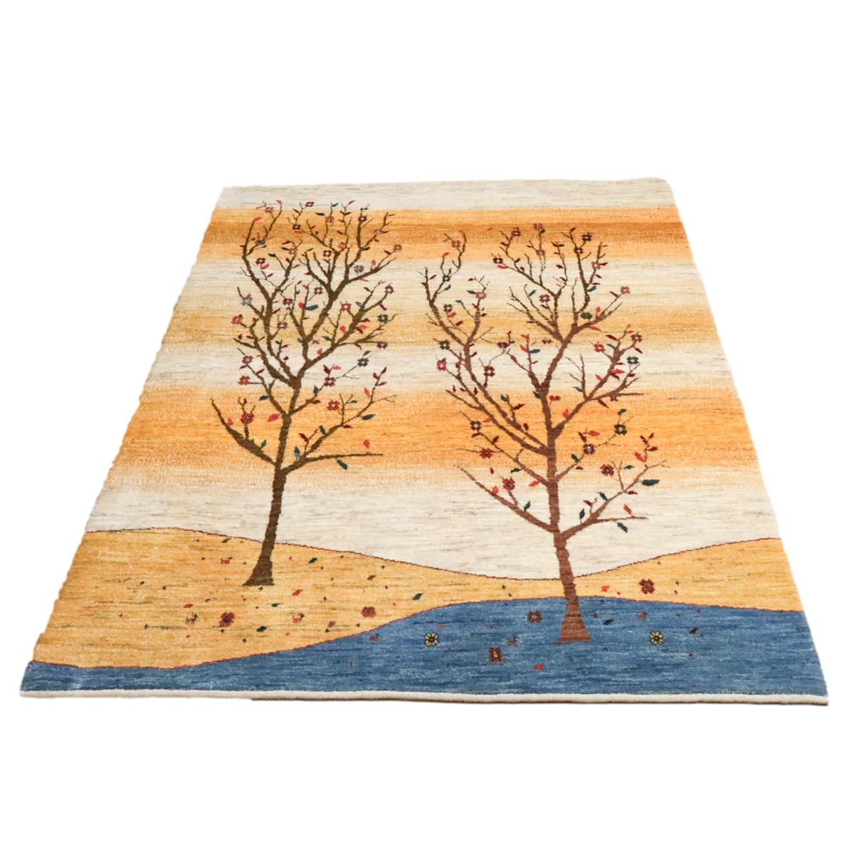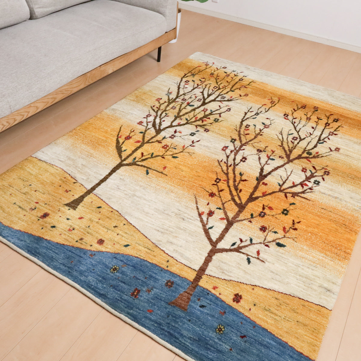 暖みのある黄色と羊の毛色を生かした生成りを基調にしたこのギャッベは、二本の生命の木のモチーフが印象的に描かれています。枝にはカラフルな花々が描かれ、大地の青も美しいアクセントになっています。背景の柔らかなグラデーションが全体に調和と落ち着きを与えています。お部屋に温かみと明るさをもたらしてくれる一枚です。