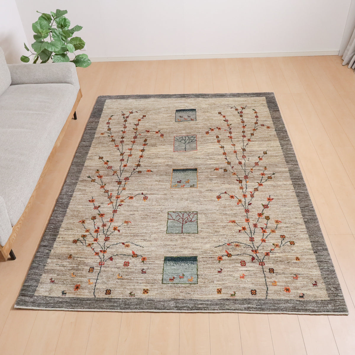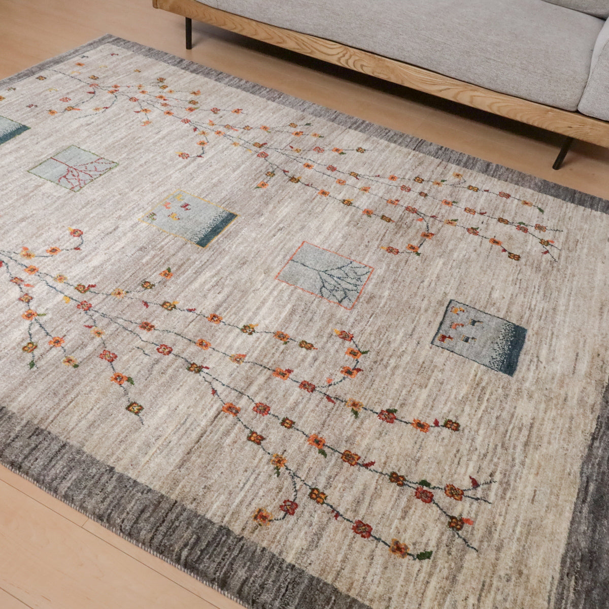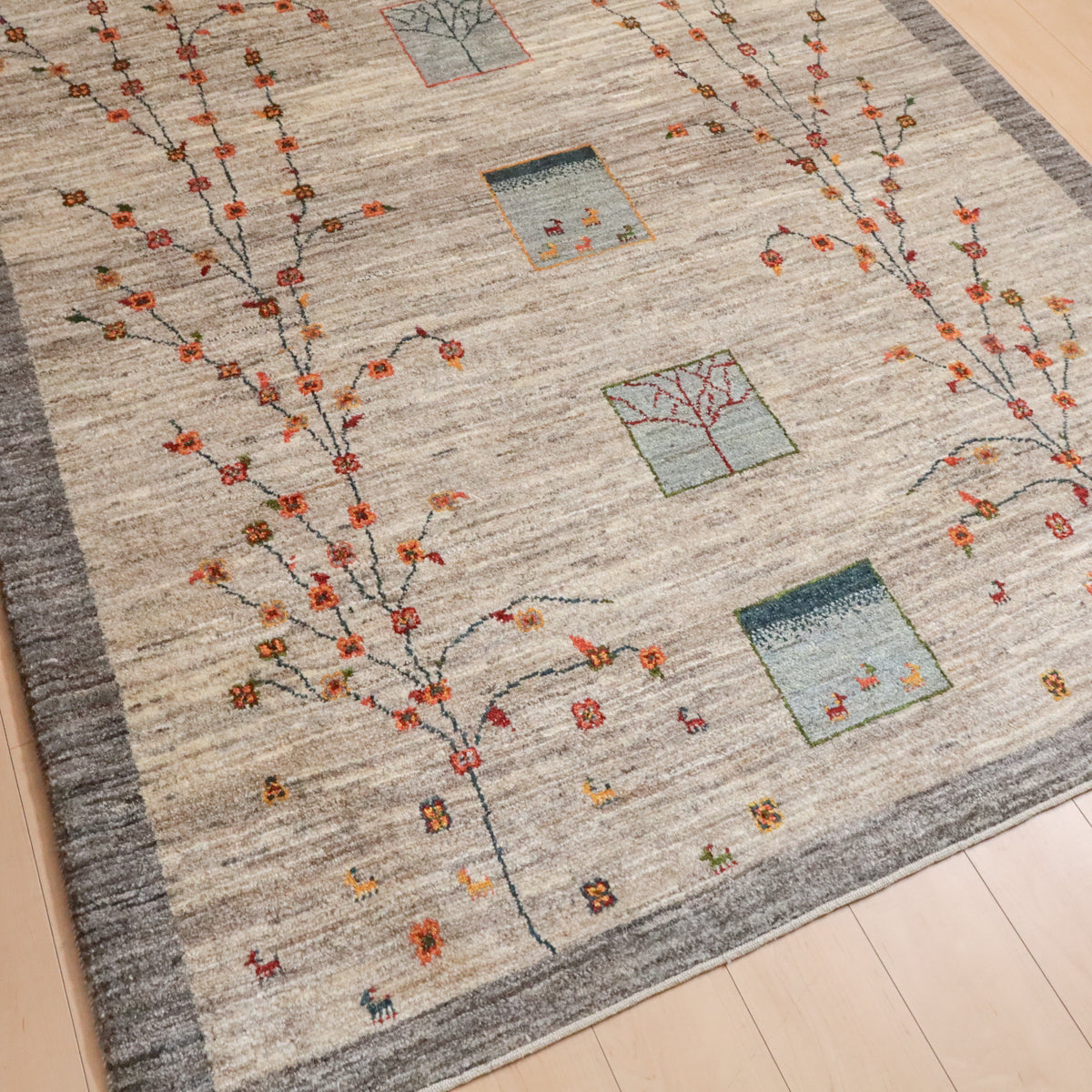 羊の毛色を生かした生成りを基調に、カラフルな花の咲く2本の生命の木のモチーフと四角の模様が印象的に描かれています。四角の中には自然の風景が描かれ、全体に温かみと落ち着きを感じさせます。細かく繊細な枝がデザインに動きを与え、お部屋に華やかでありながらも上品な雰囲気をもたらします。