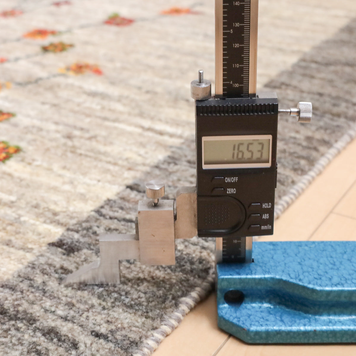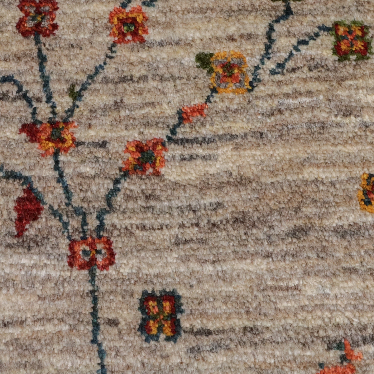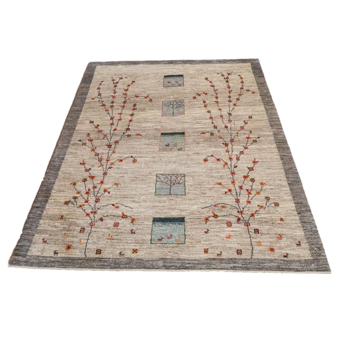 羊の毛色を生かした生成りを基調に、カラフルな花の咲く2本の生命の木のモチーフと四角の模様が印象的に描かれています。四角の中には自然の風景が描かれ、全体に温かみと落ち着きを感じさせます。細かく繊細な枝がデザインに動きを与え、お部屋に華やかでありながらも上品な雰囲気をもたらします。