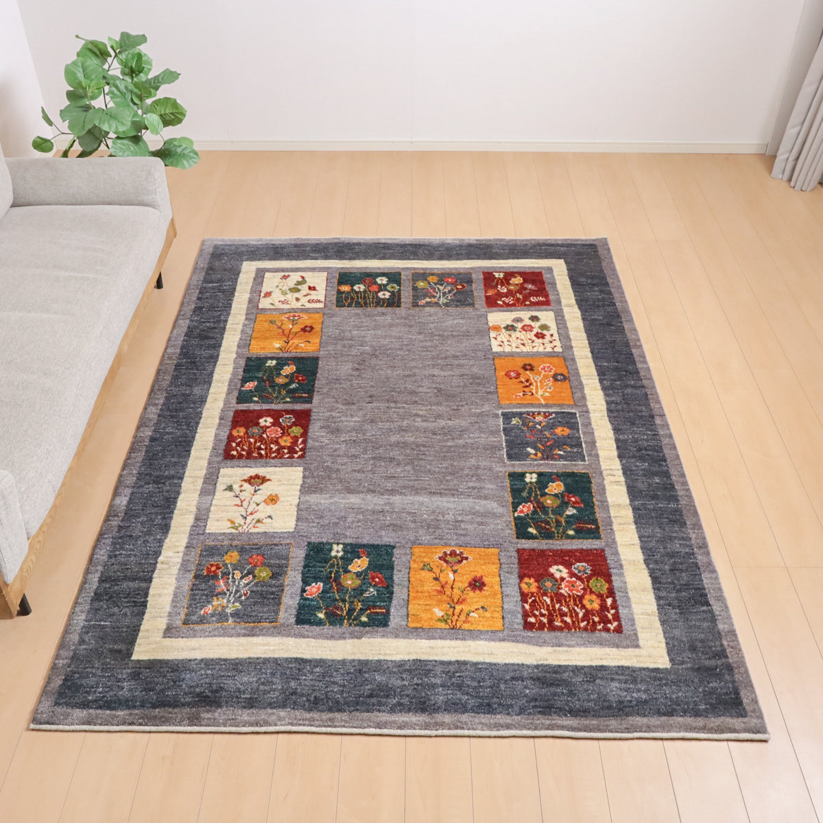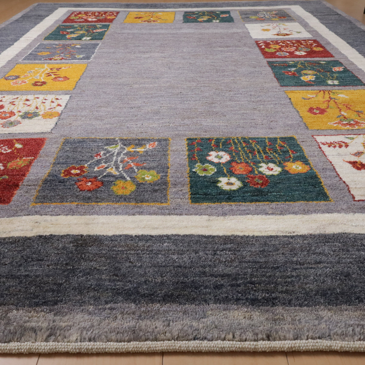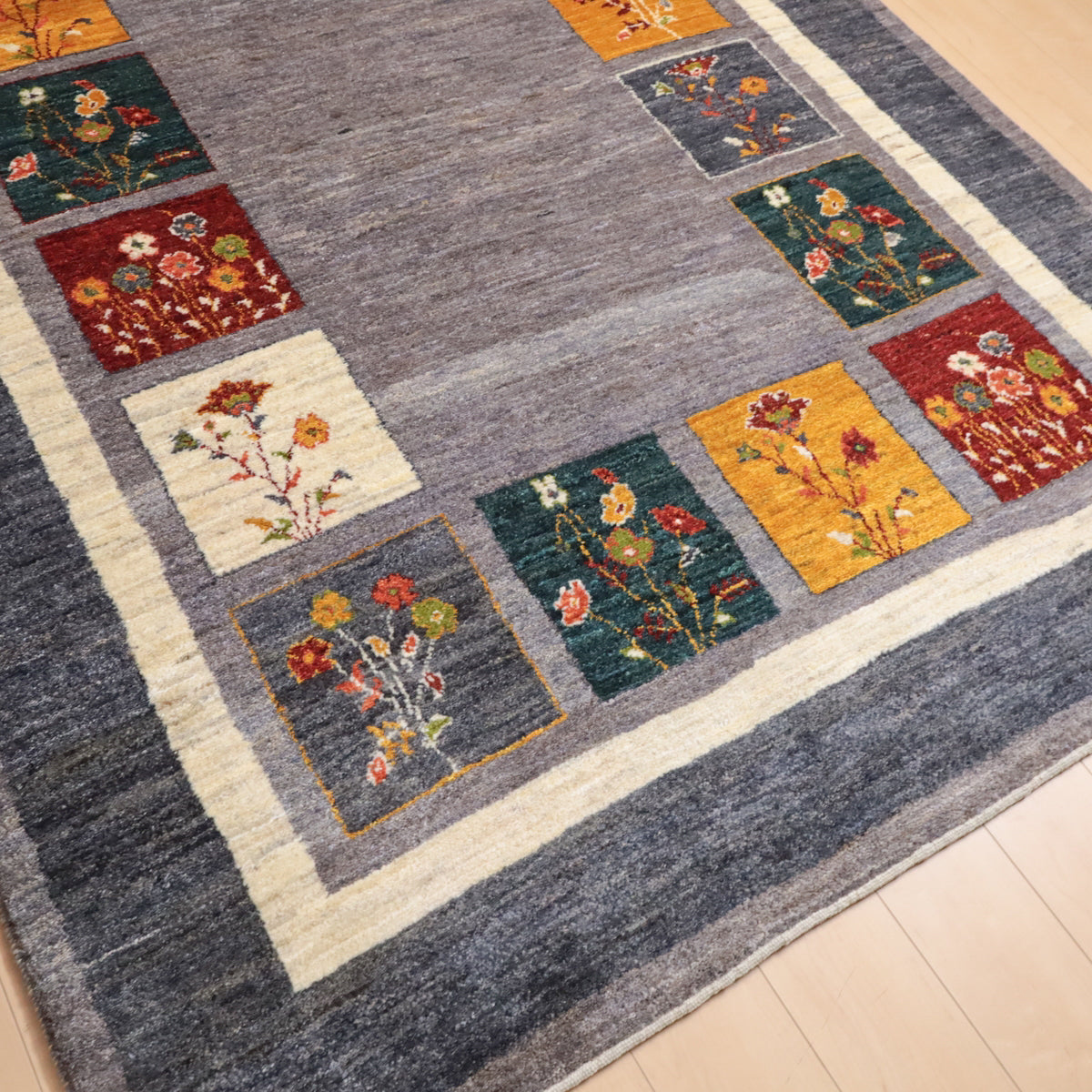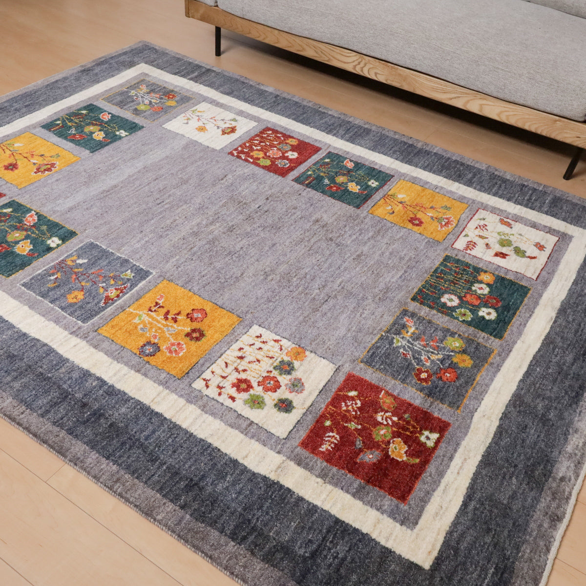 グレーを基調にしたこのギャッベは、カラフルな四角の模様が印象的。四角の中にはカラフルな花のモチーフが描かれ、デザインに美しいアクセントを加えています。羊の毛色を生かした生成りのフレームが全体を引き締め、お部屋に温かみと華やかさをもたらします。上品でありながらも親しみやすい一枚です。