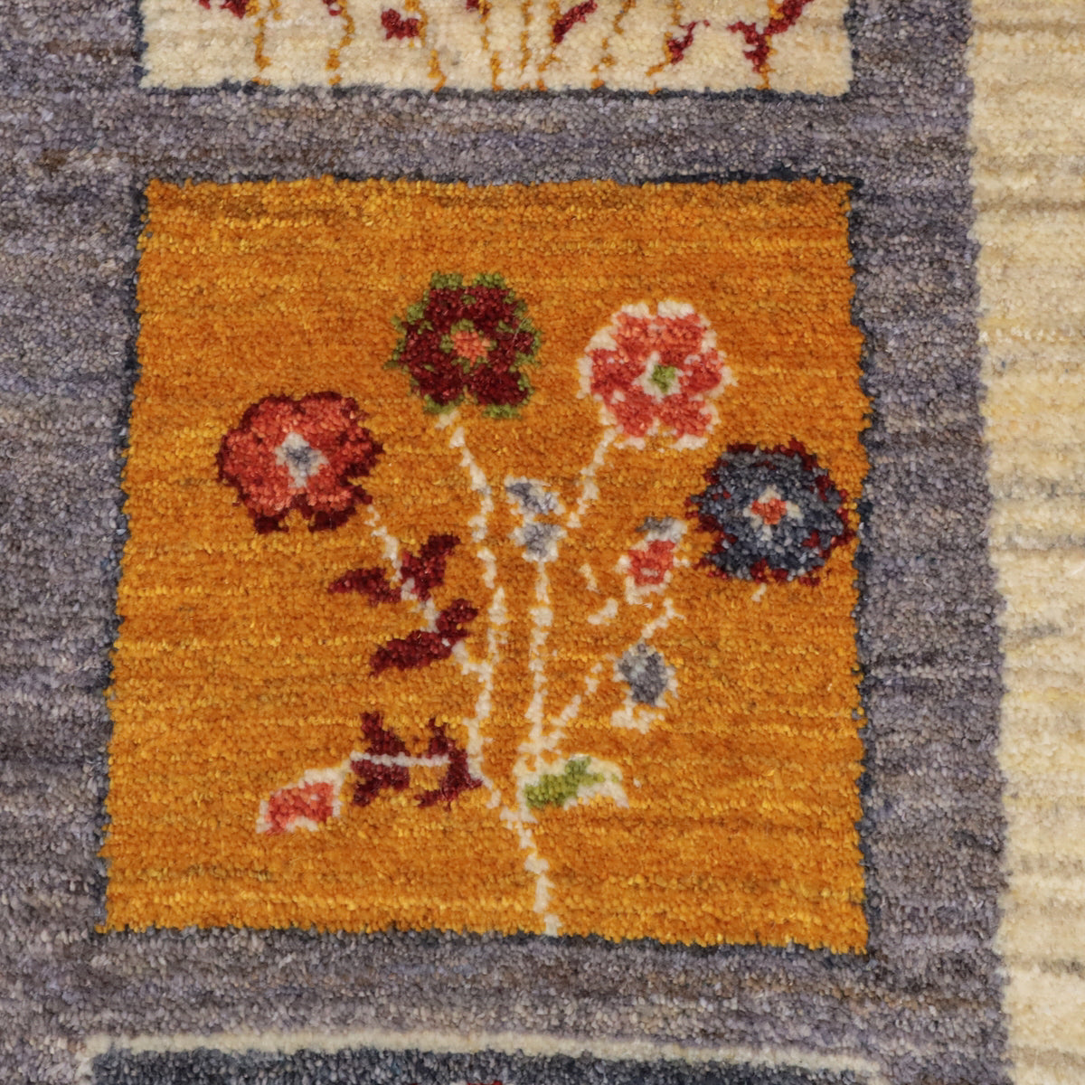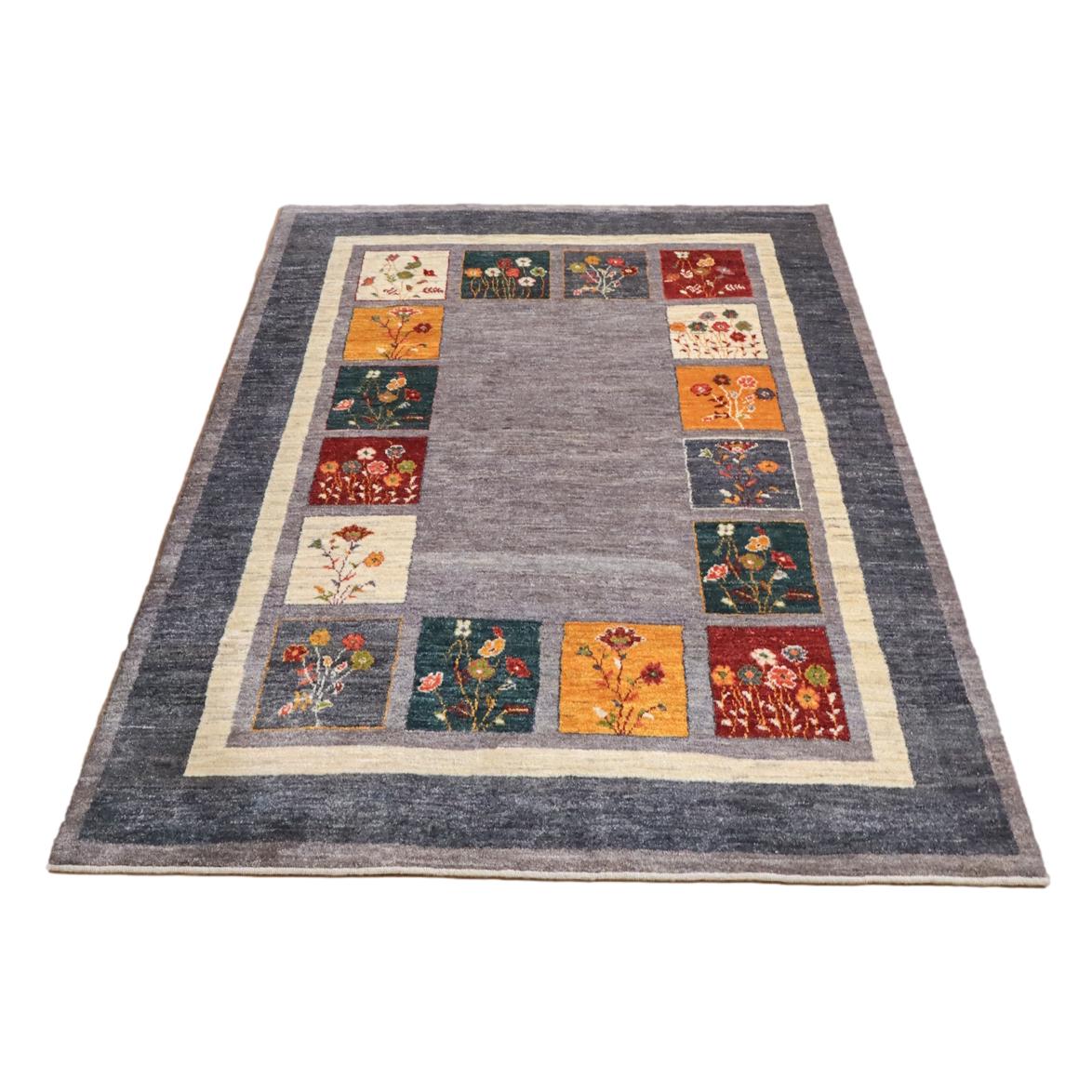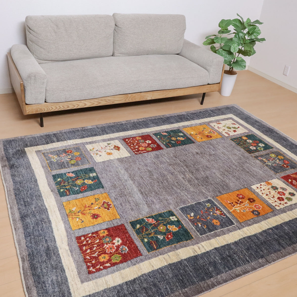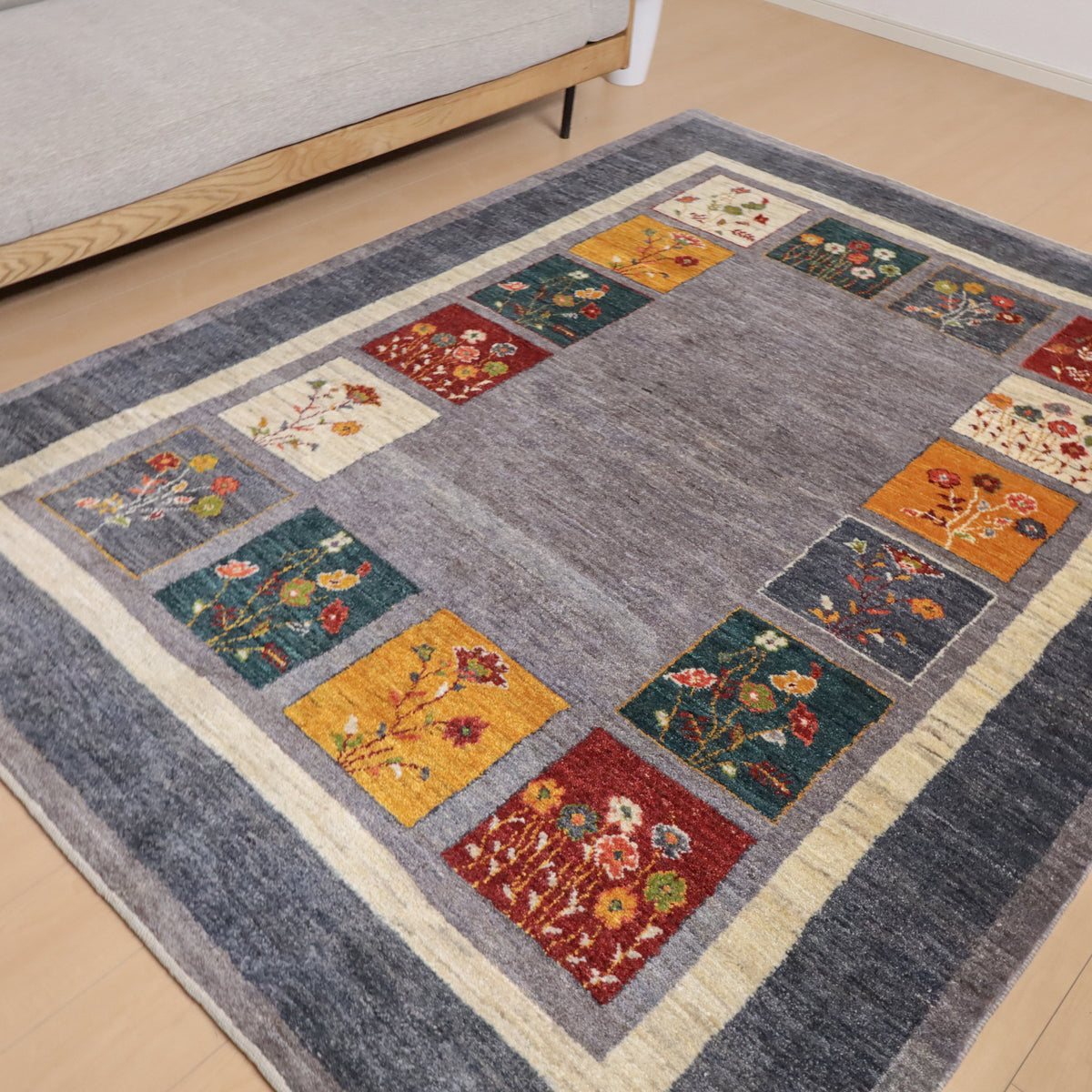 グレーを基調にしたこのギャッベは、カラフルな四角の模様が印象的。四角の中にはカラフルな花のモチーフが描かれ、デザインに美しいアクセントを加えています。羊の毛色を生かした生成りのフレームが全体を引き締め、お部屋に温かみと華やかさをもたらします。上品でありながらも親しみやすい一枚です。