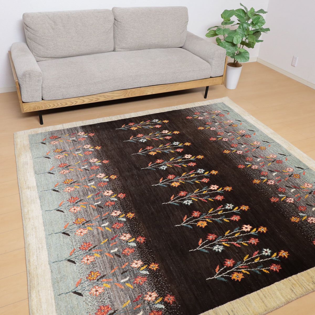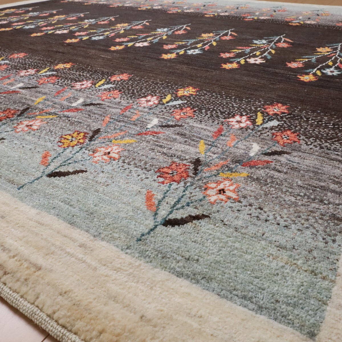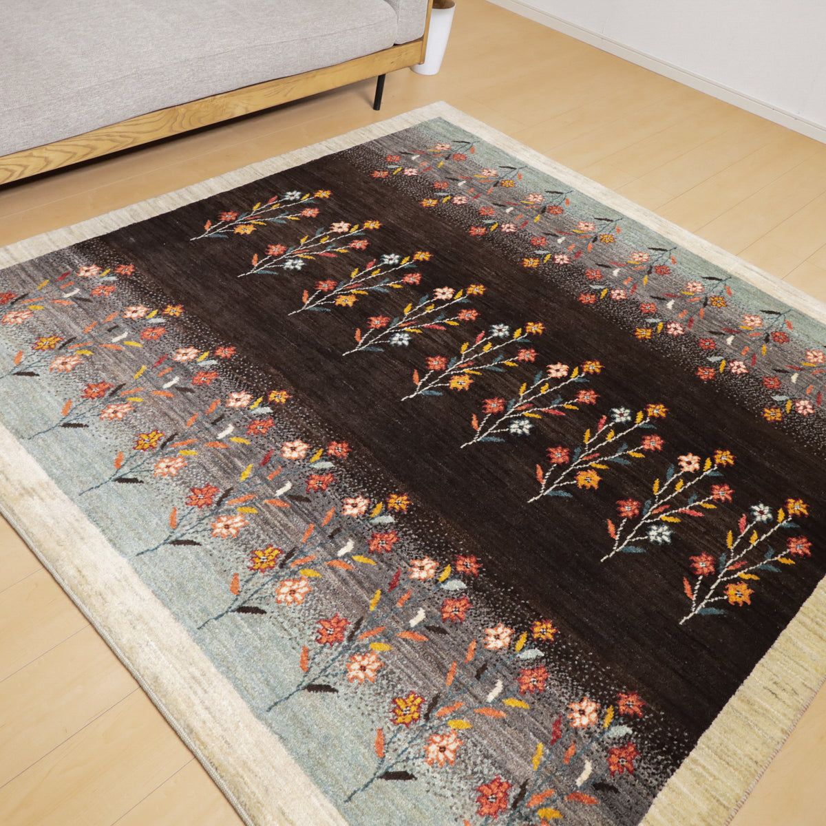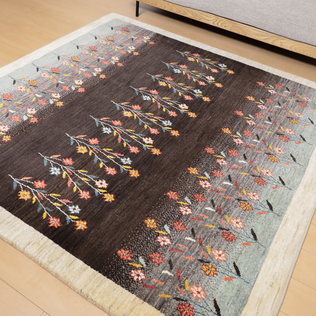 深い茶色とグレーを基調にしたこのギャッベは、カラフルな花のモチーフが印象的。赤や珊瑚色、黄色の花々が整然と並び、自然の美しさを感じさせます。羊の毛色を生かした生成りのフレームが全体を引き締め、デザインに調和をもたらしています。上品で落ち着いた雰囲気を演出してくれる一枚です。