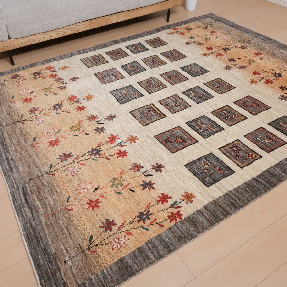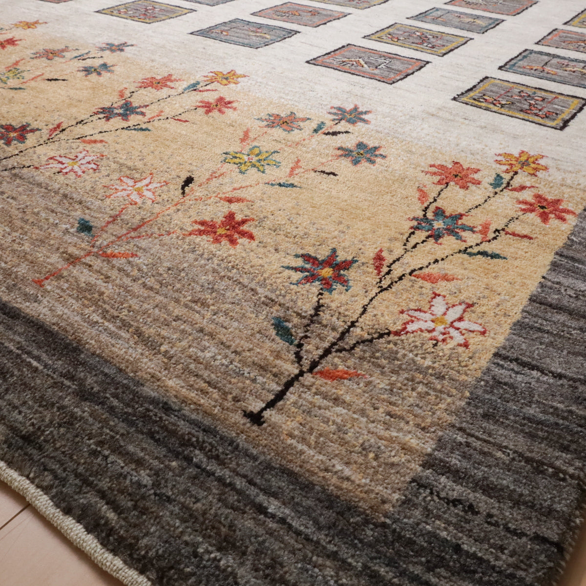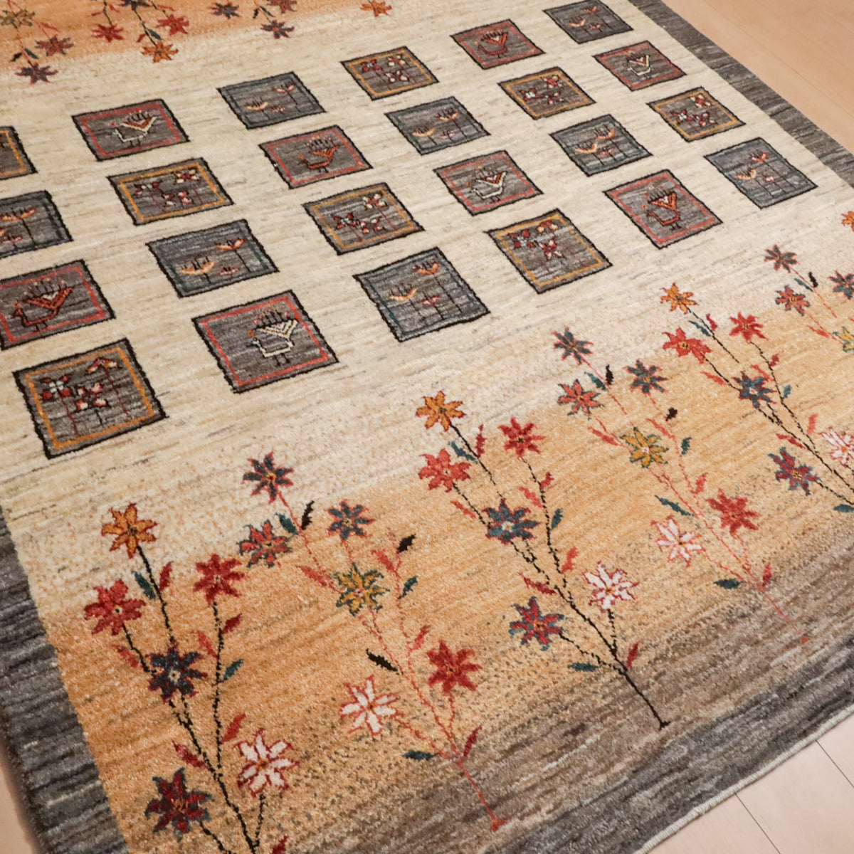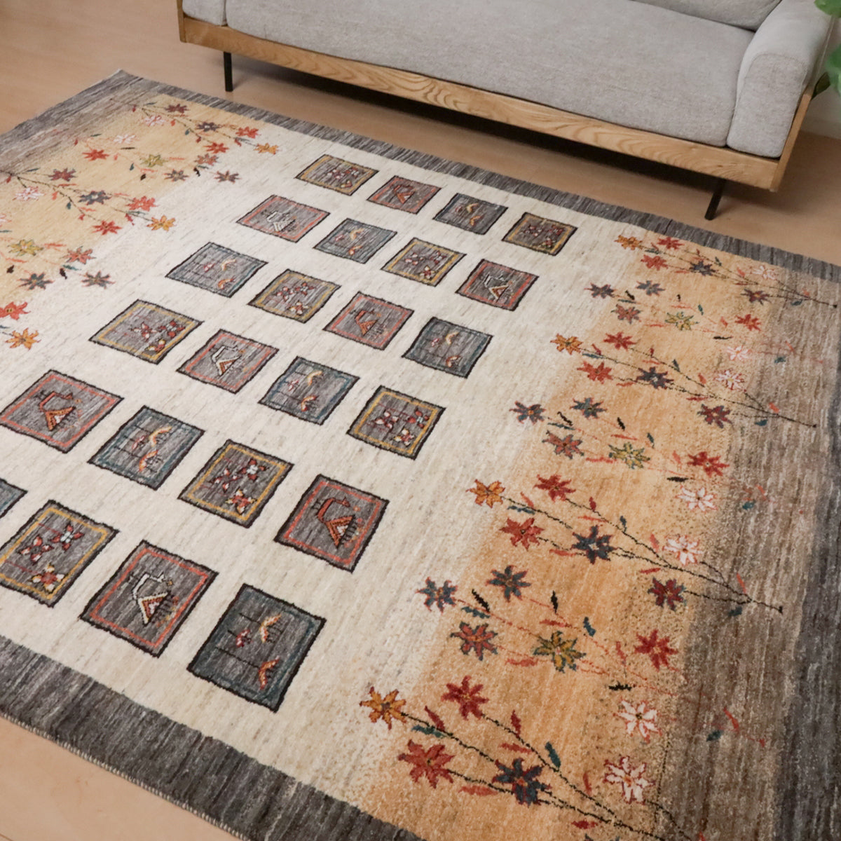 羊の毛色を生かした生成りを基調に、カラフルな花のモチーフが描かれたこのギャッベ。橙や赤、黄色の色彩が美しく調和し、華やかでありつつも温かみのあるデザインです。四角の模様の中に描かれた様々なモチーフがアクセントとなっています。お部屋に上品な彩りと和やかさをもたらしてくれる一枚です。