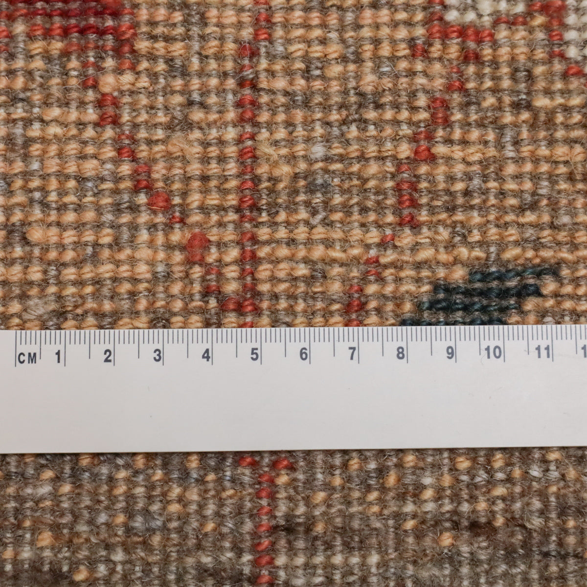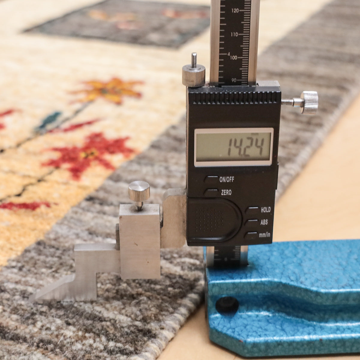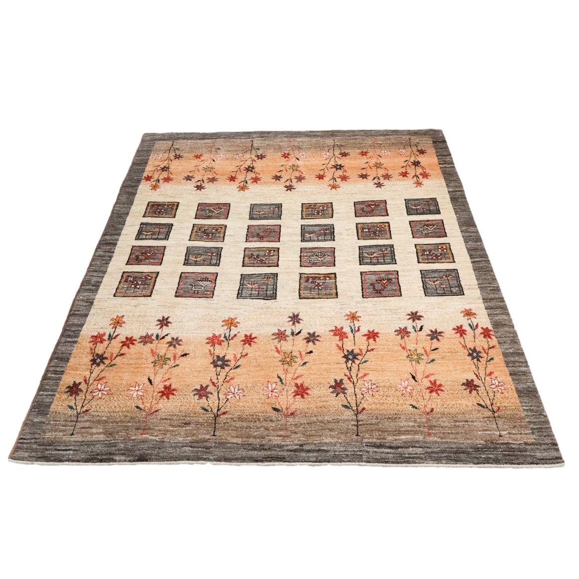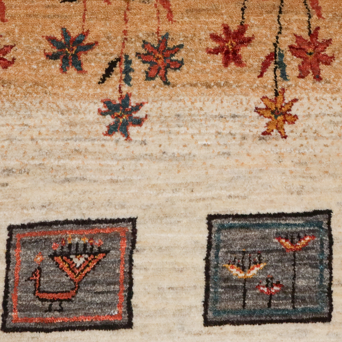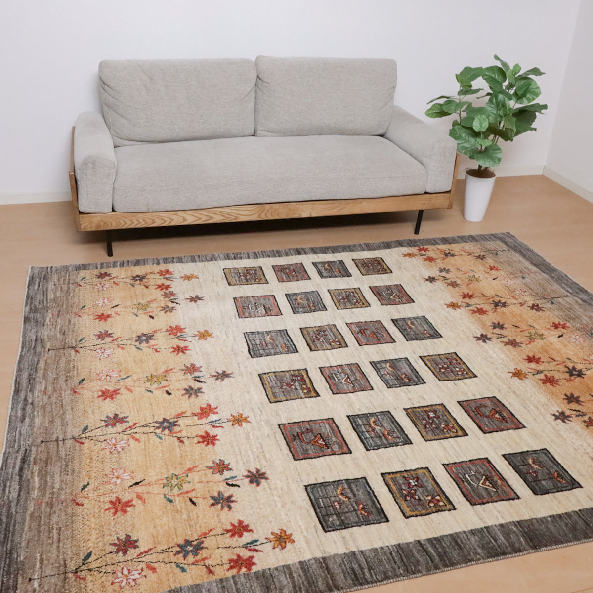 羊の毛色を生かした生成りを基調に、カラフルな花のモチーフが描かれたこのギャッベ。橙や赤、黄色の色彩が美しく調和し、華やかでありつつも温かみのあるデザインです。四角の模様の中に描かれた様々なモチーフがアクセントとなっています。お部屋に上品な彩りと和やかさをもたらしてくれる一枚です。