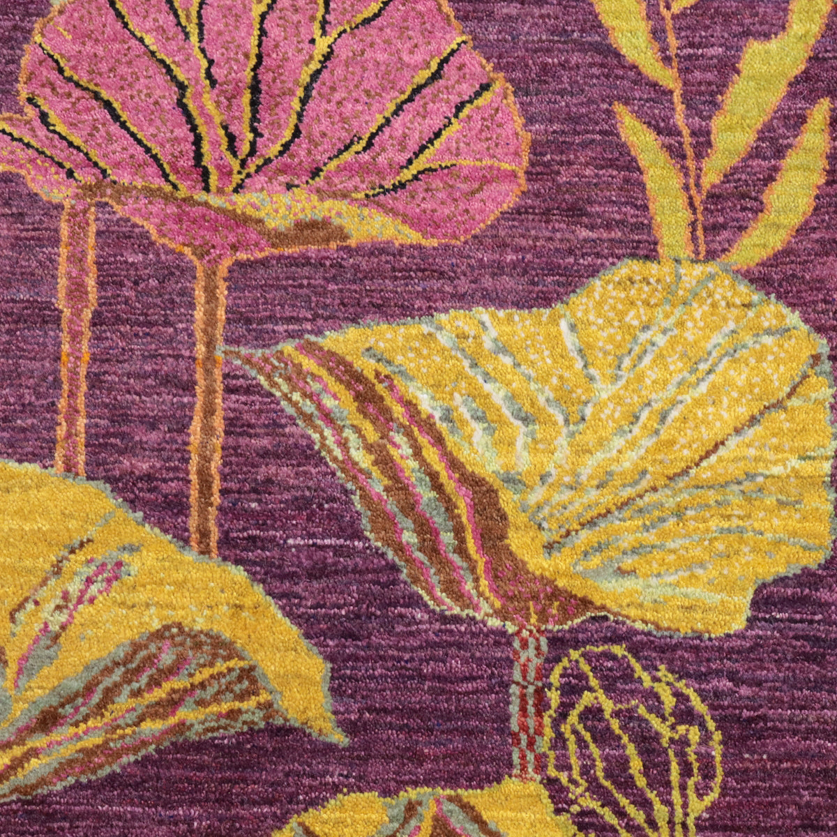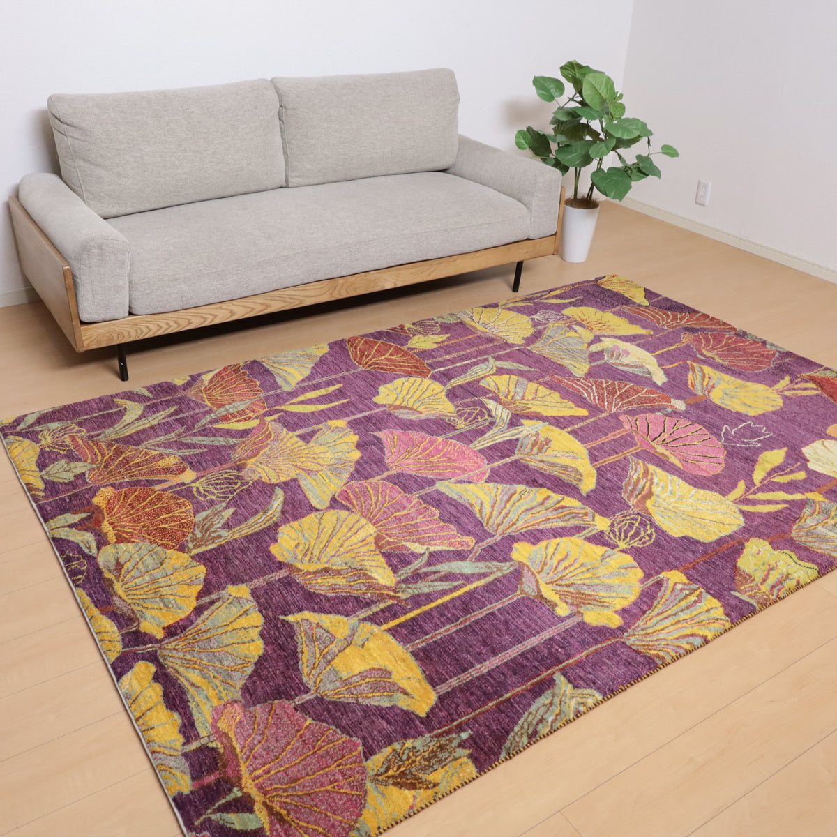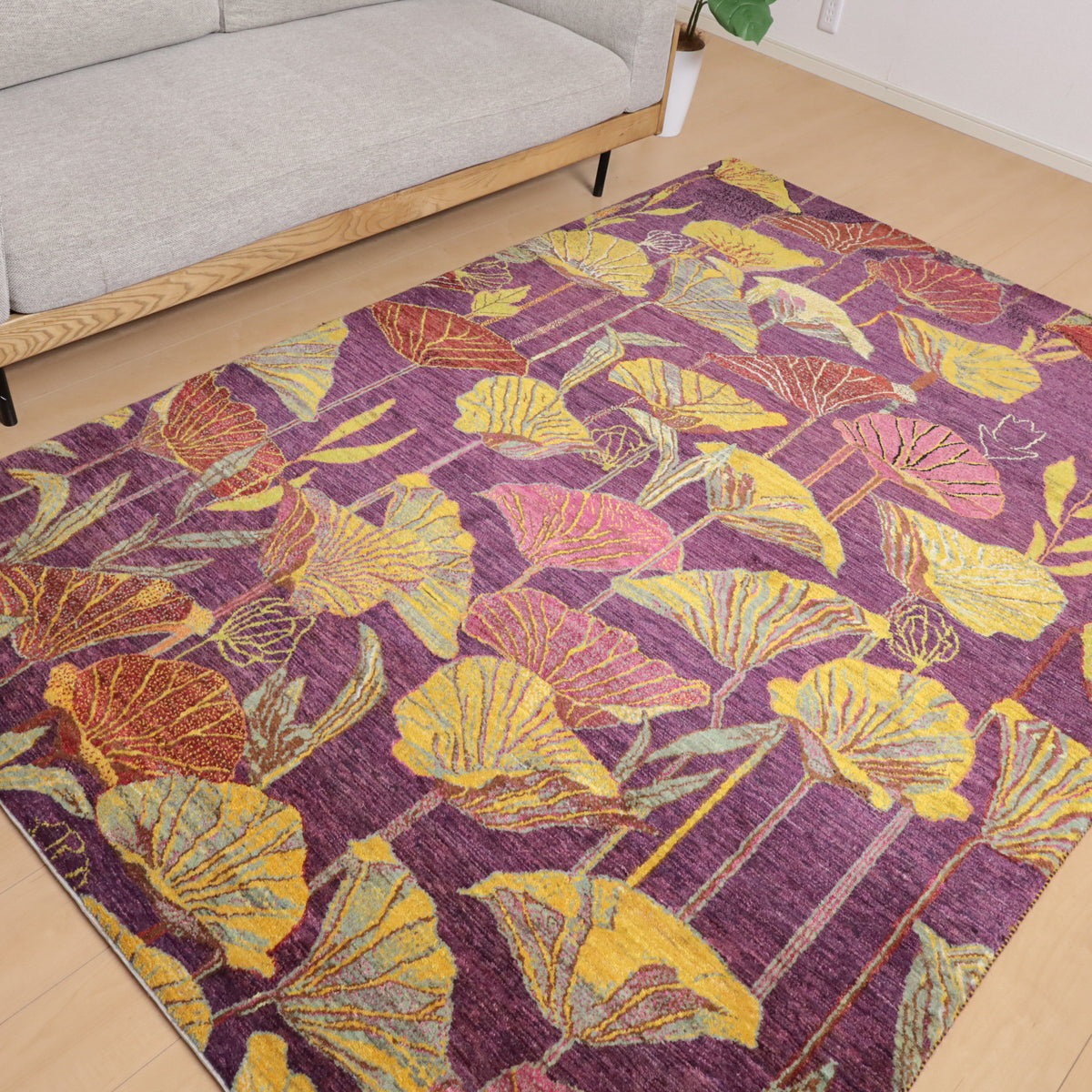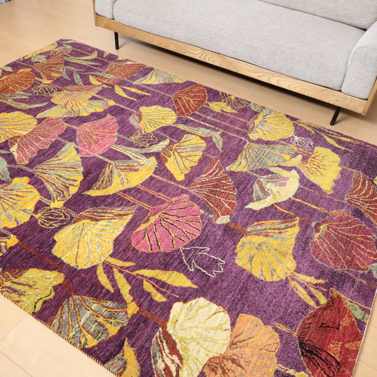 鮮やかな紫を基調に、カラフルな葉のモチーフが一面に描かれたギャッベです。赤、黄色、緑など多彩で大胆な色彩が巧みに配された、モダンなデザイン。葉のモチーフは非常に立体的な表現で、デザインの美しさと織り手の技術の高さを感じさせます。お部屋に華やかさと個性的な雰囲気をもたらす一枚です。