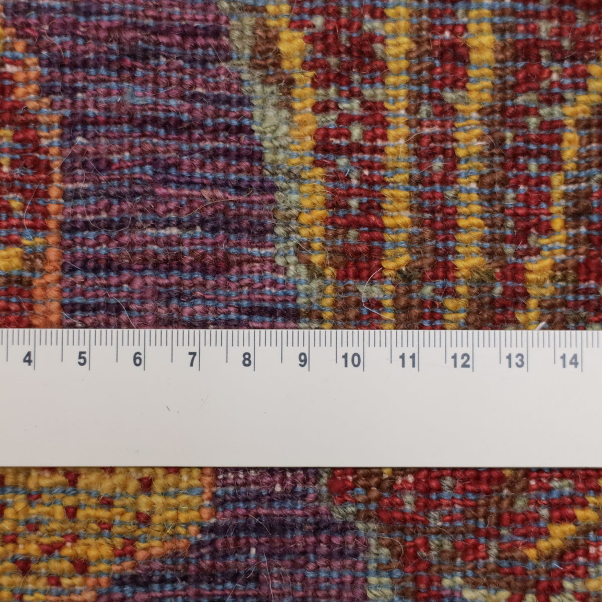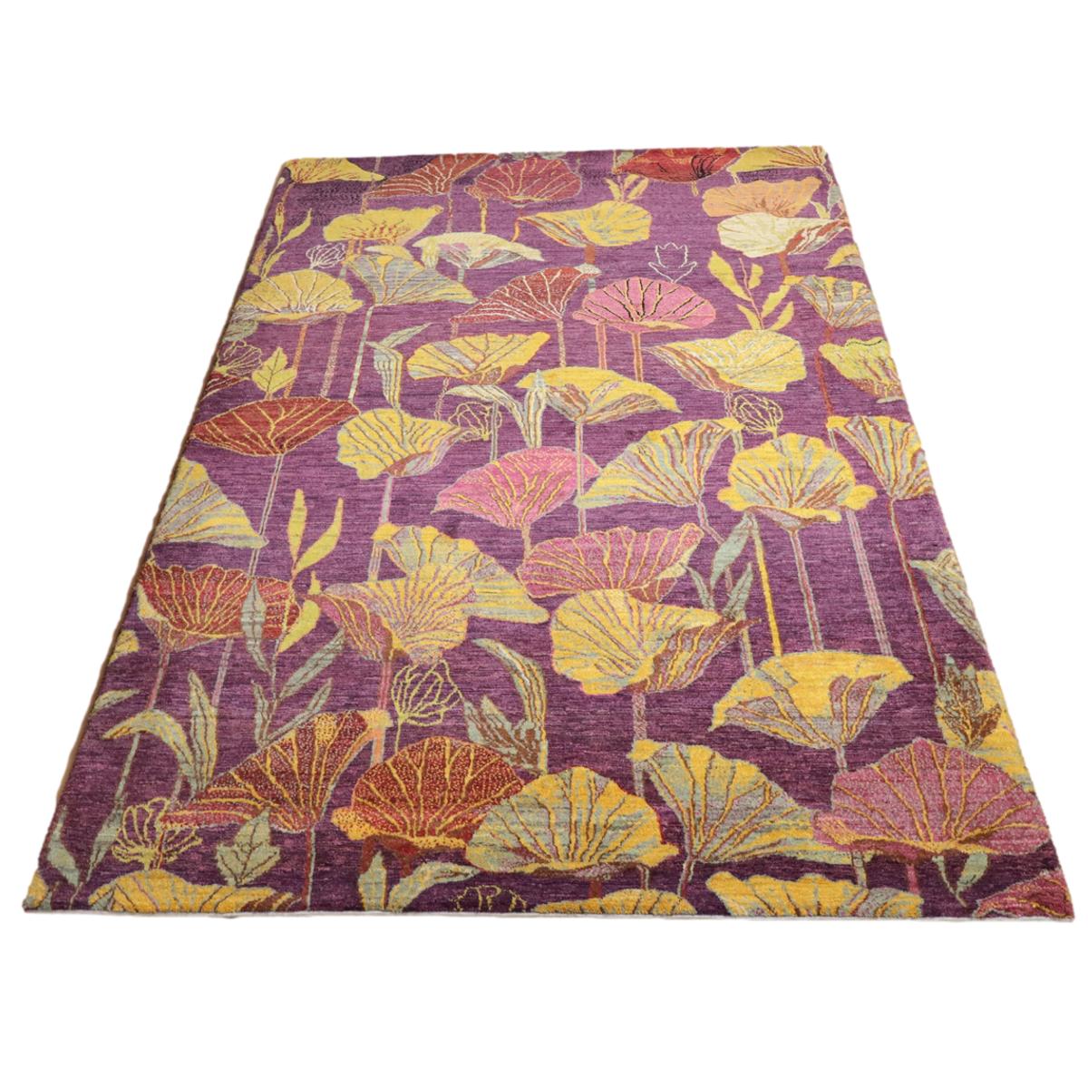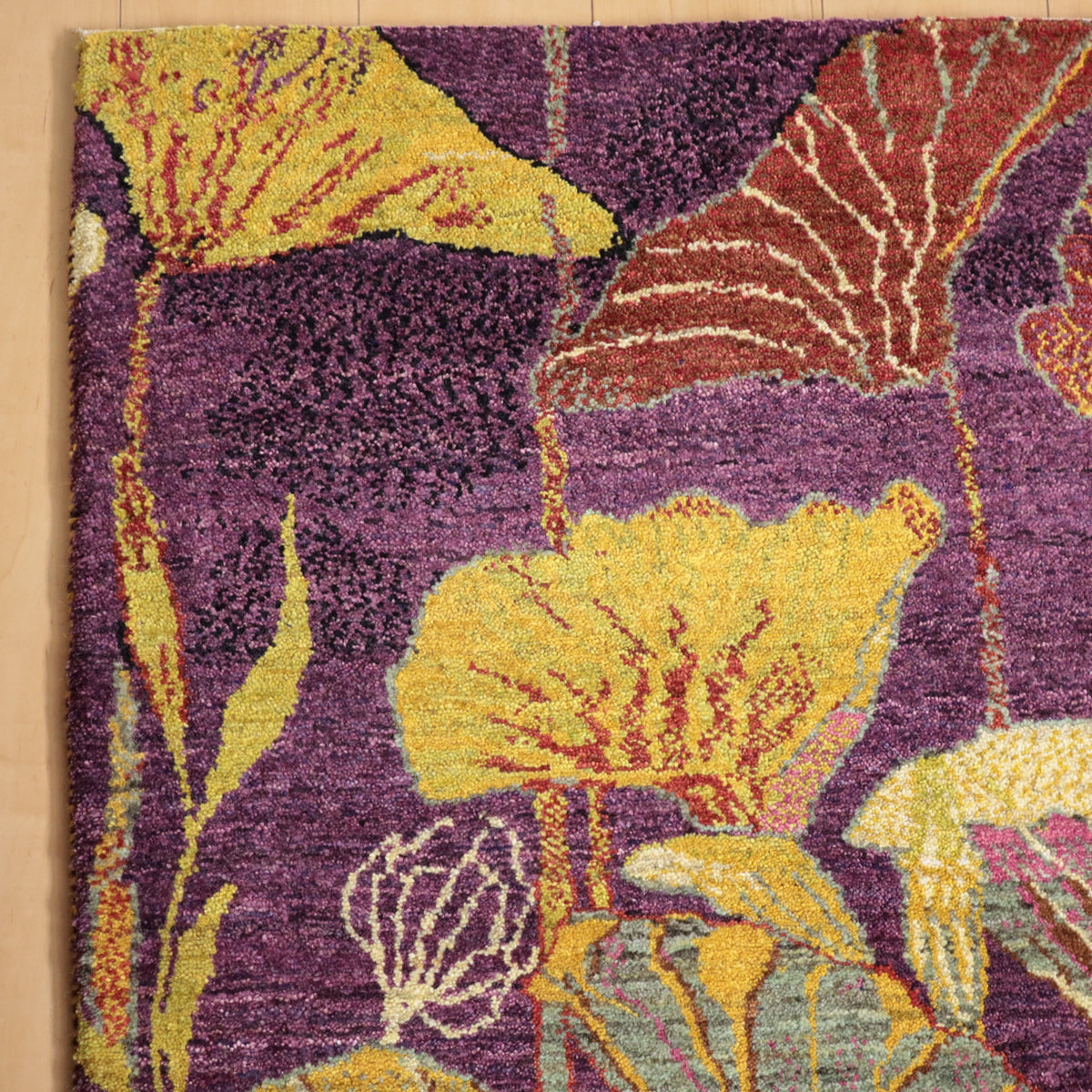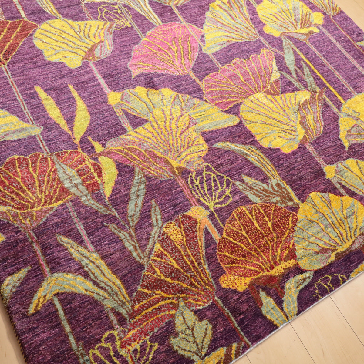 鮮やかな紫を基調に、カラフルな葉のモチーフが一面に描かれたギャッベです。赤、黄色、緑など多彩で大胆な色彩が巧みに配された、モダンなデザイン。葉のモチーフは非常に立体的な表現で、デザインの美しさと織り手の技術の高さを感じさせます。お部屋に華やかさと個性的な雰囲気をもたらす一枚です。