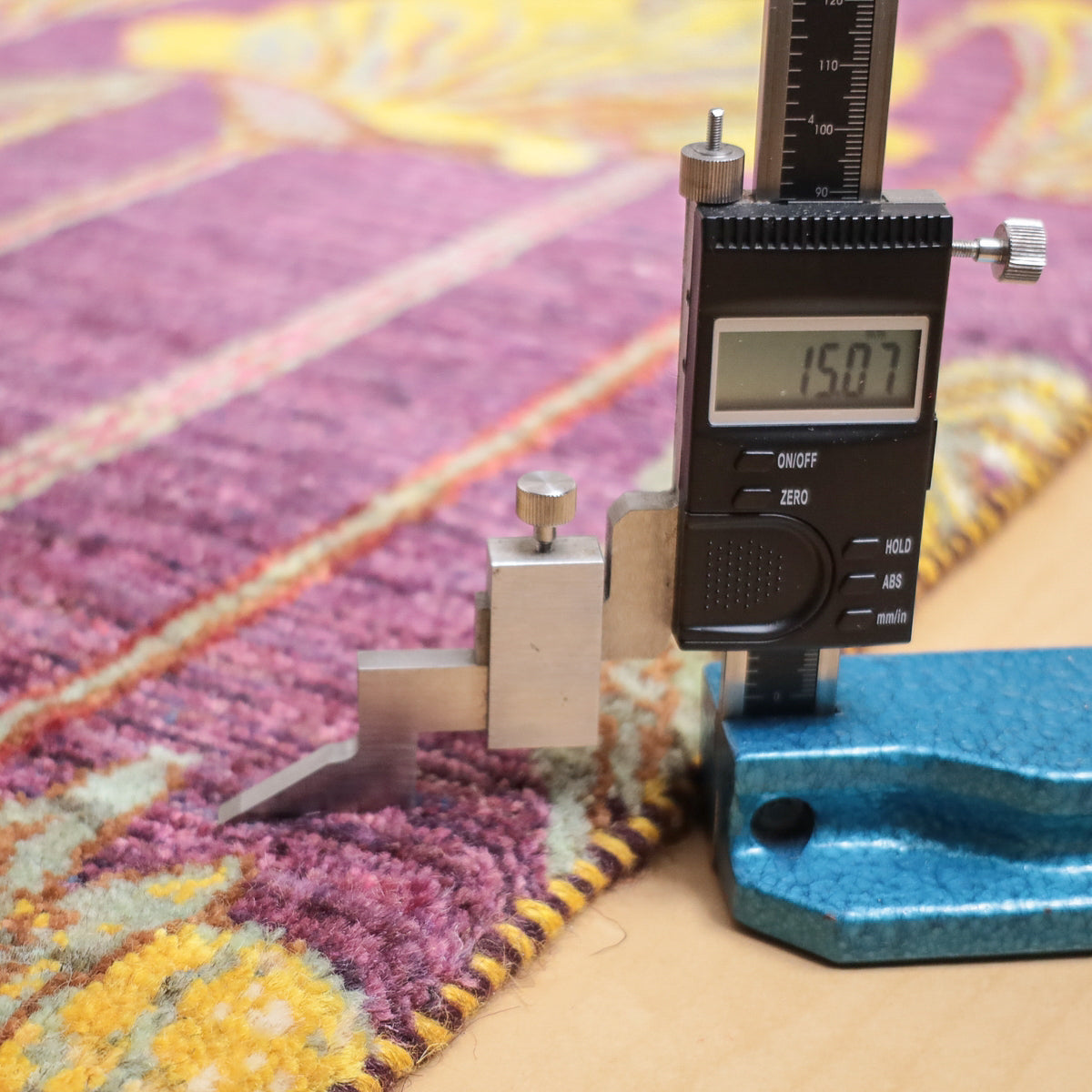 織りは、10cmあたり、およそ40から45目という普通のギャッベの数倍にもなる大変細かなルリバフ。細かく繊細なデザインで手触りはふわりと柔らか。やんわりと沈み込む踏み心地です。腕の良い選りすぐられた織り子だけが手掛ける極上の手仕事です。