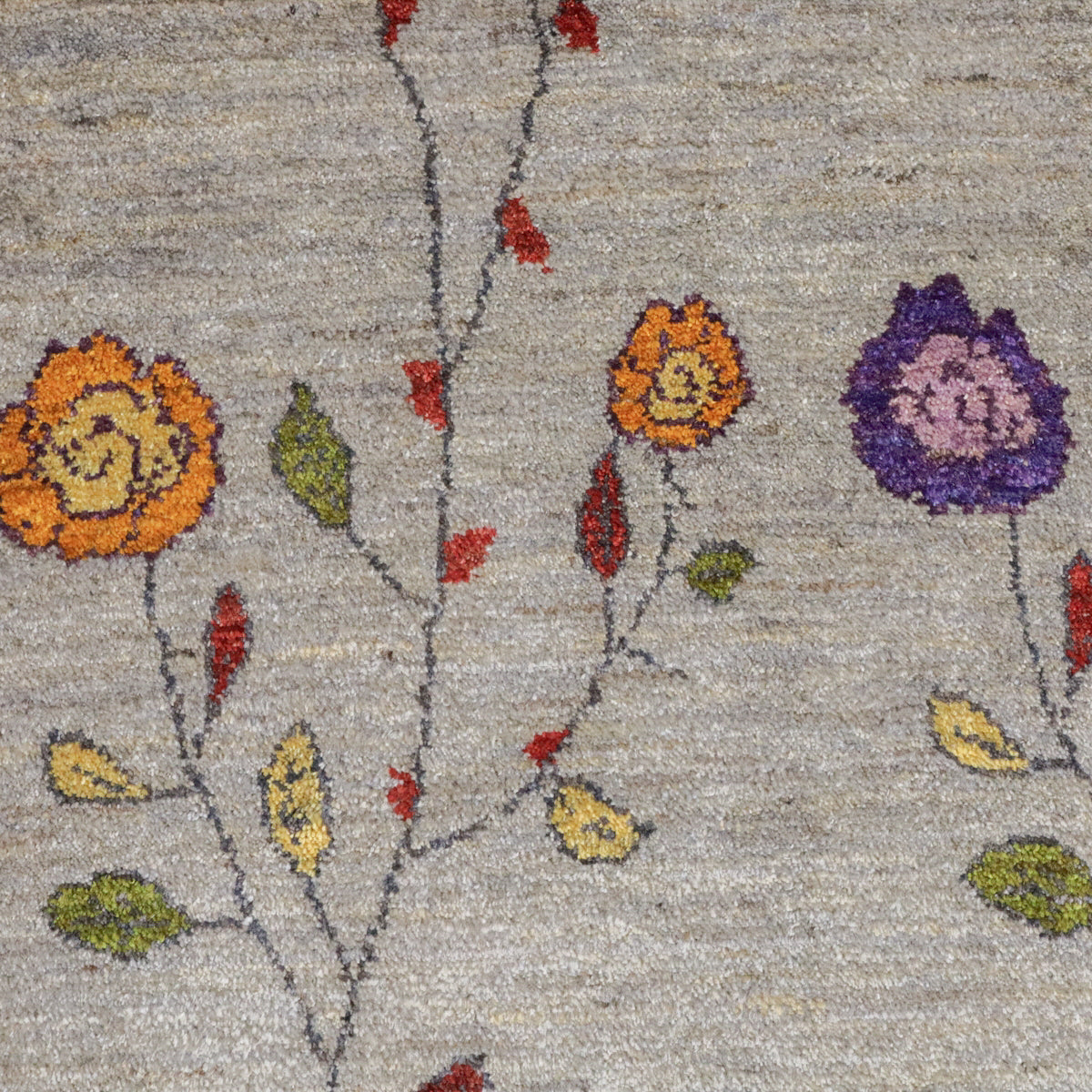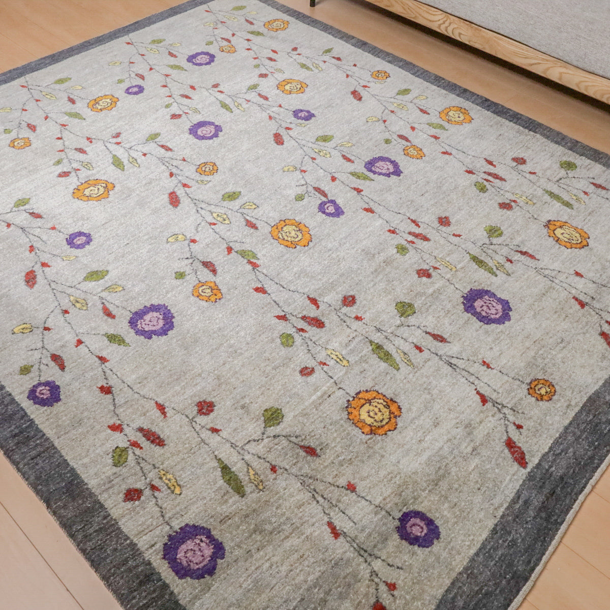 落ち着いたグレーを基調にしたデザインです。紫や橙などのカラフルな花のモチーフが印象的に描かれ、繊細な枝と葉がデザインを引き立てています。お部屋に華やかな彩りをもたらし、上品な印象を与える一枚です。