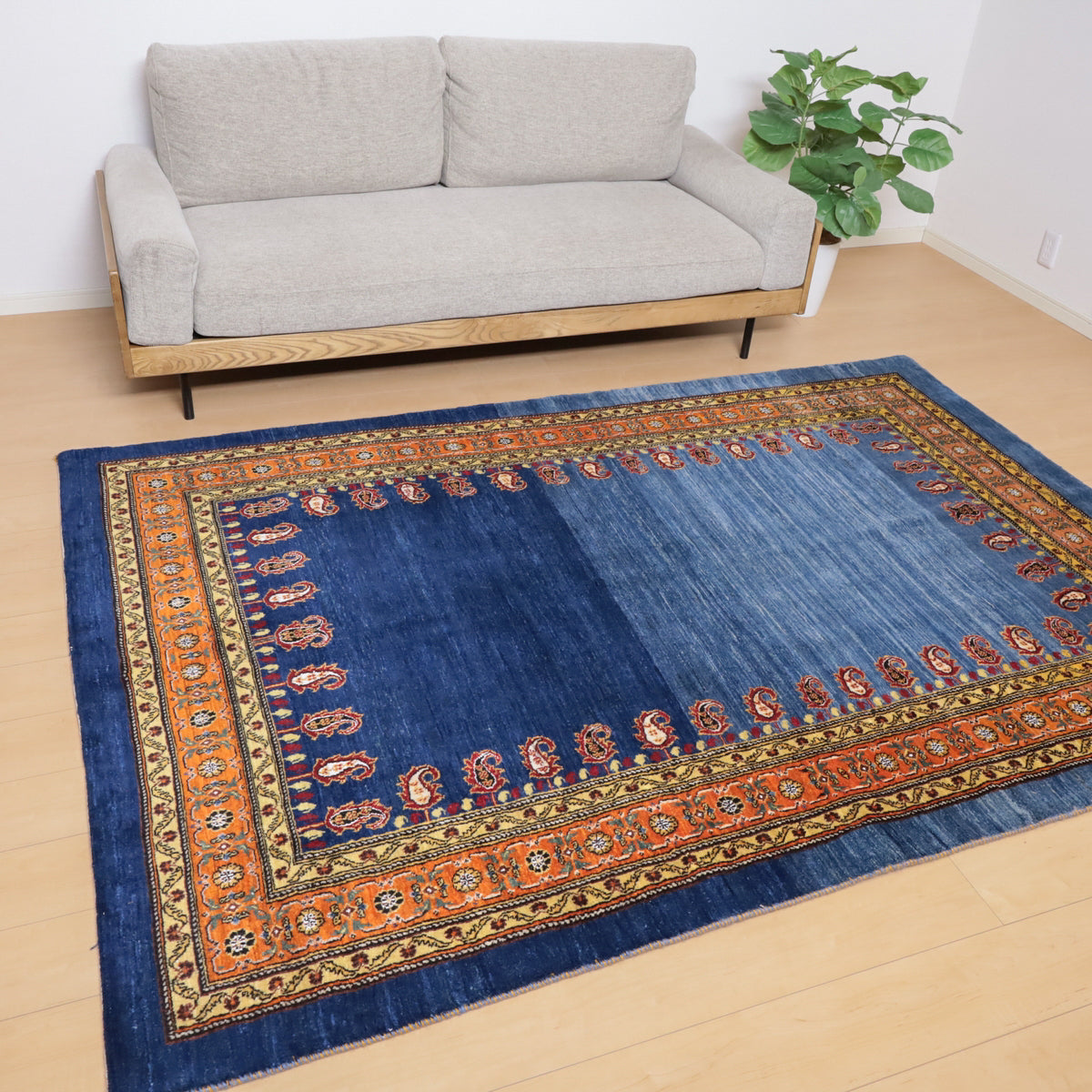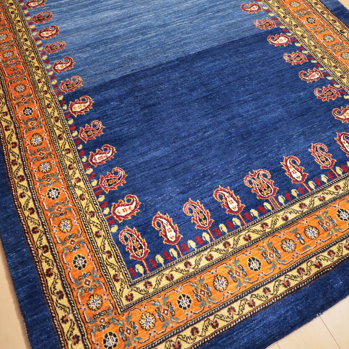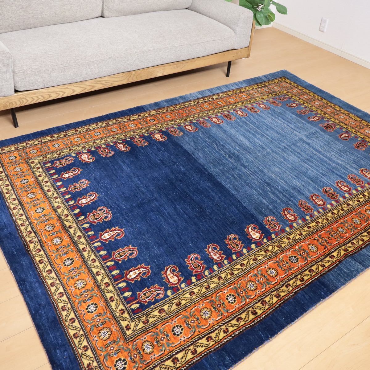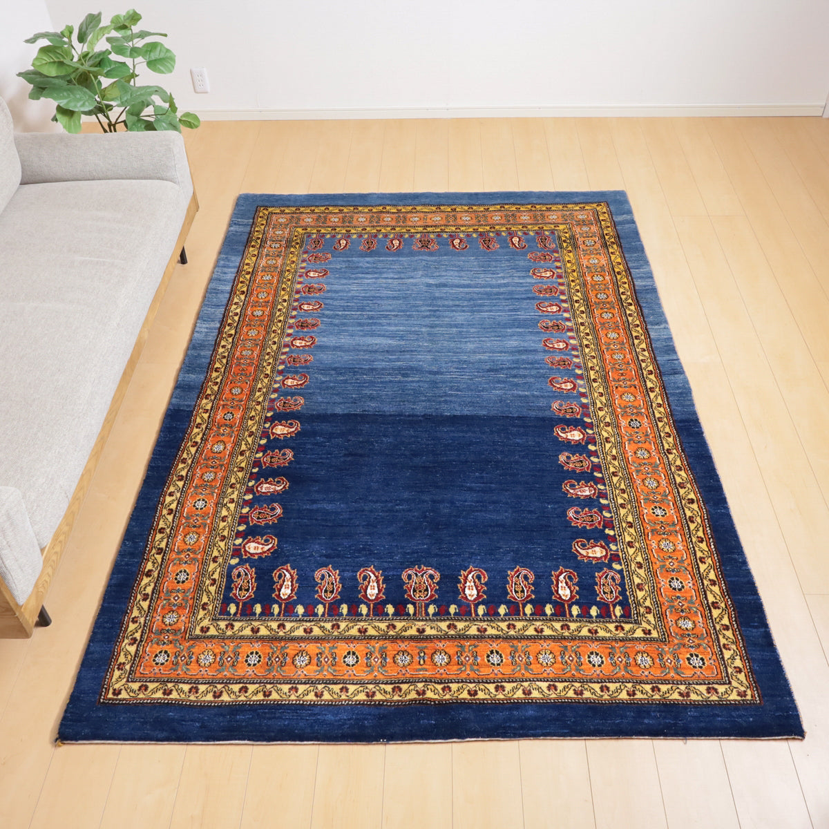 深い青の濃淡を基調にした、高級感が漂うギャッベです。赤や橙を基調にした美しいボテ(ペイズリー)柄や蔦などの伝統的なモチーフが四辺を囲むように描かれており、洗練された華やかさを感じさせます。細かな手織りの技術が生み出す、整然とした伝統柄デザインの美しさを感じられる一枚です。