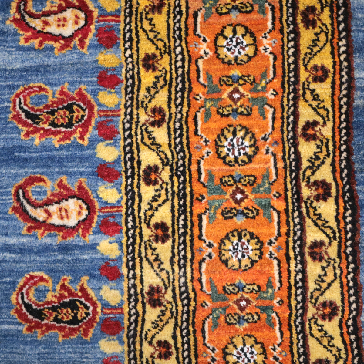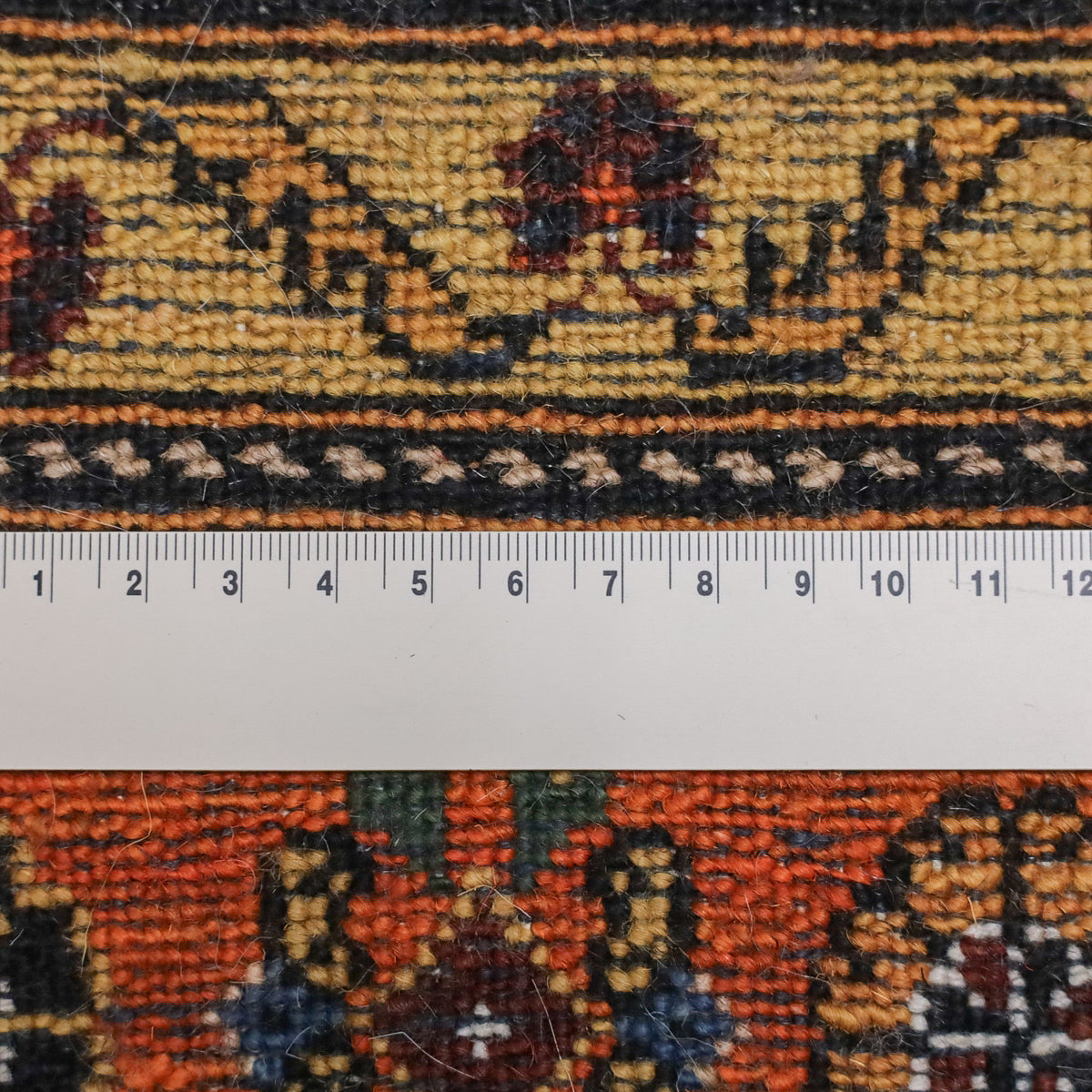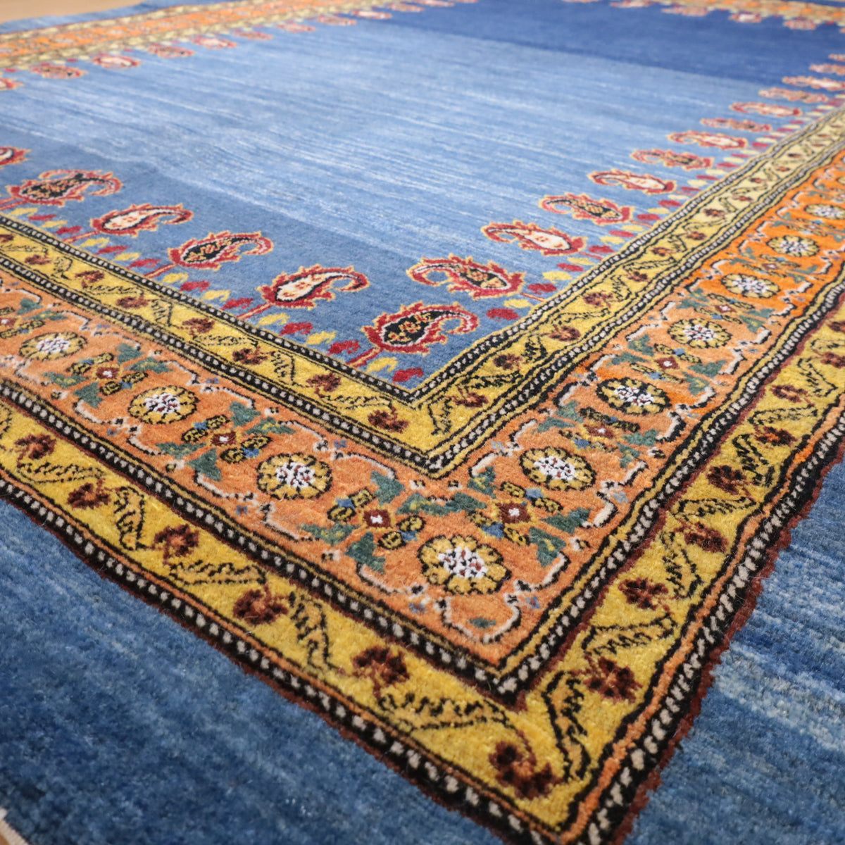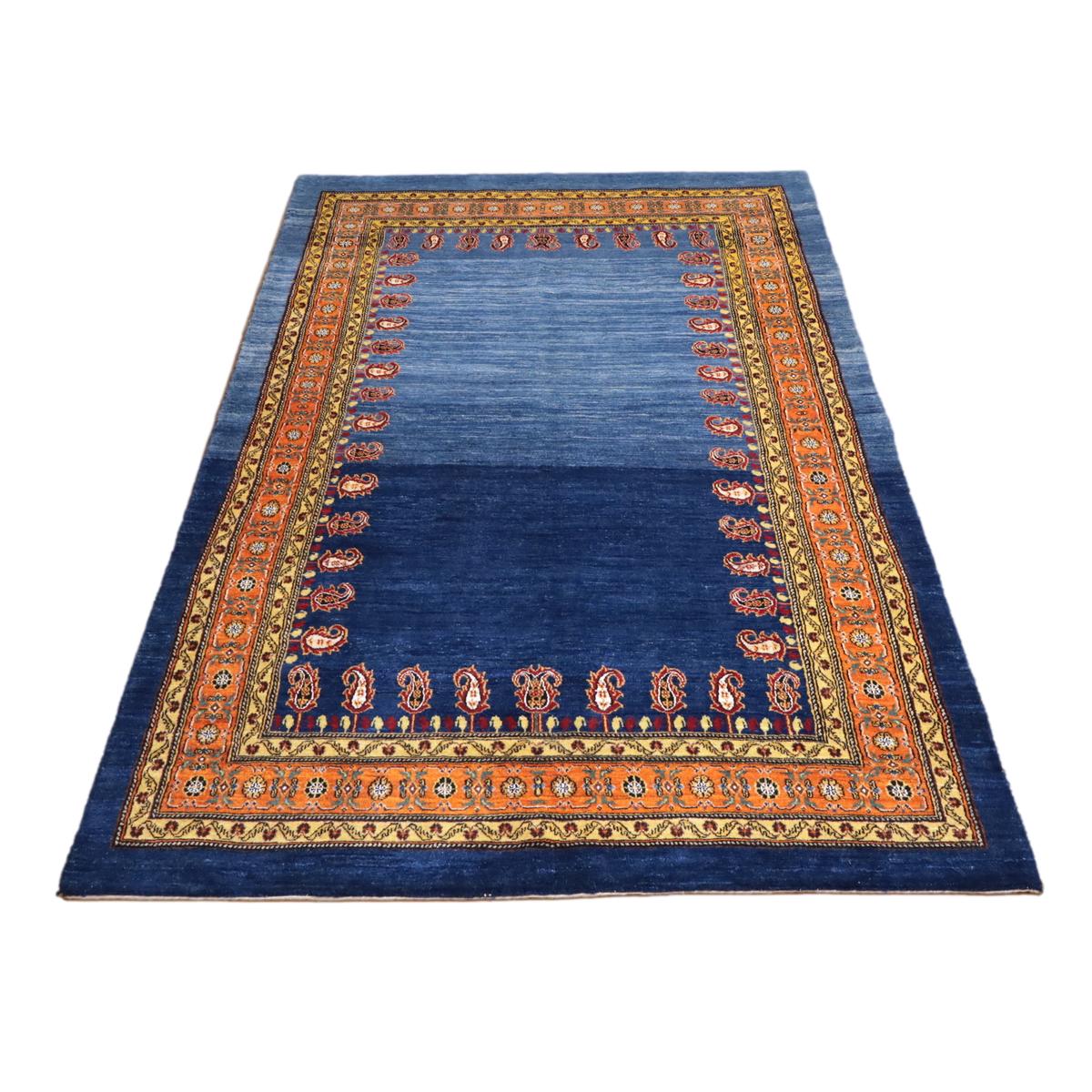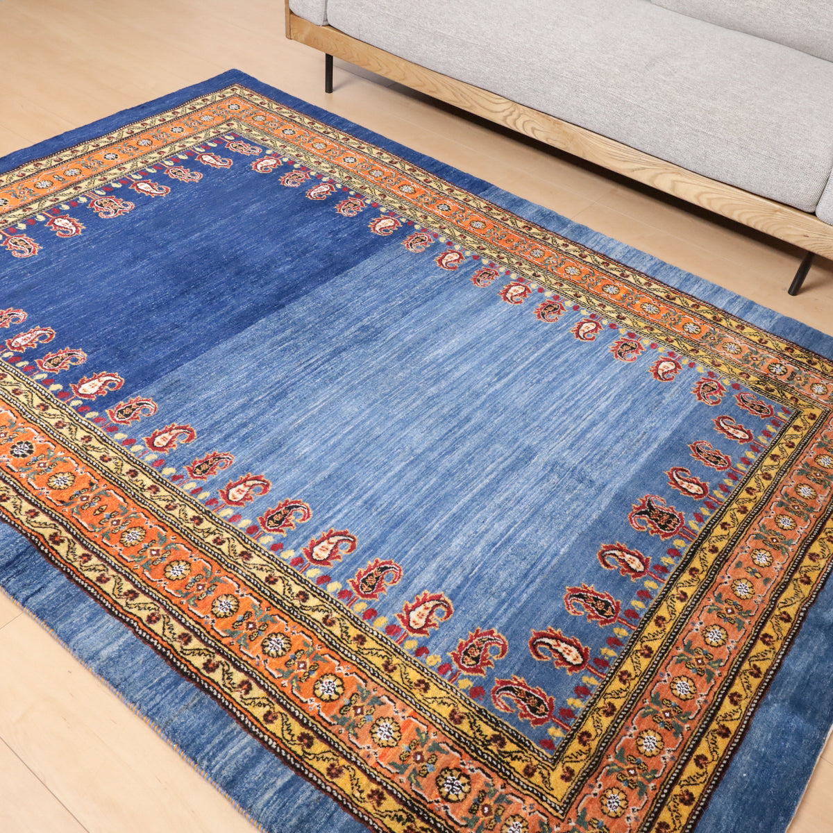 深い青の濃淡を基調にした、高級感が漂うギャッベです。赤や橙を基調にした美しいボテ(ペイズリー)柄や蔦などの伝統的なモチーフが四辺を囲むように描かれており、洗練された華やかさを感じさせます。細かな手織りの技術が生み出す、整然とした伝統柄デザインの美しさを感じられる一枚です。