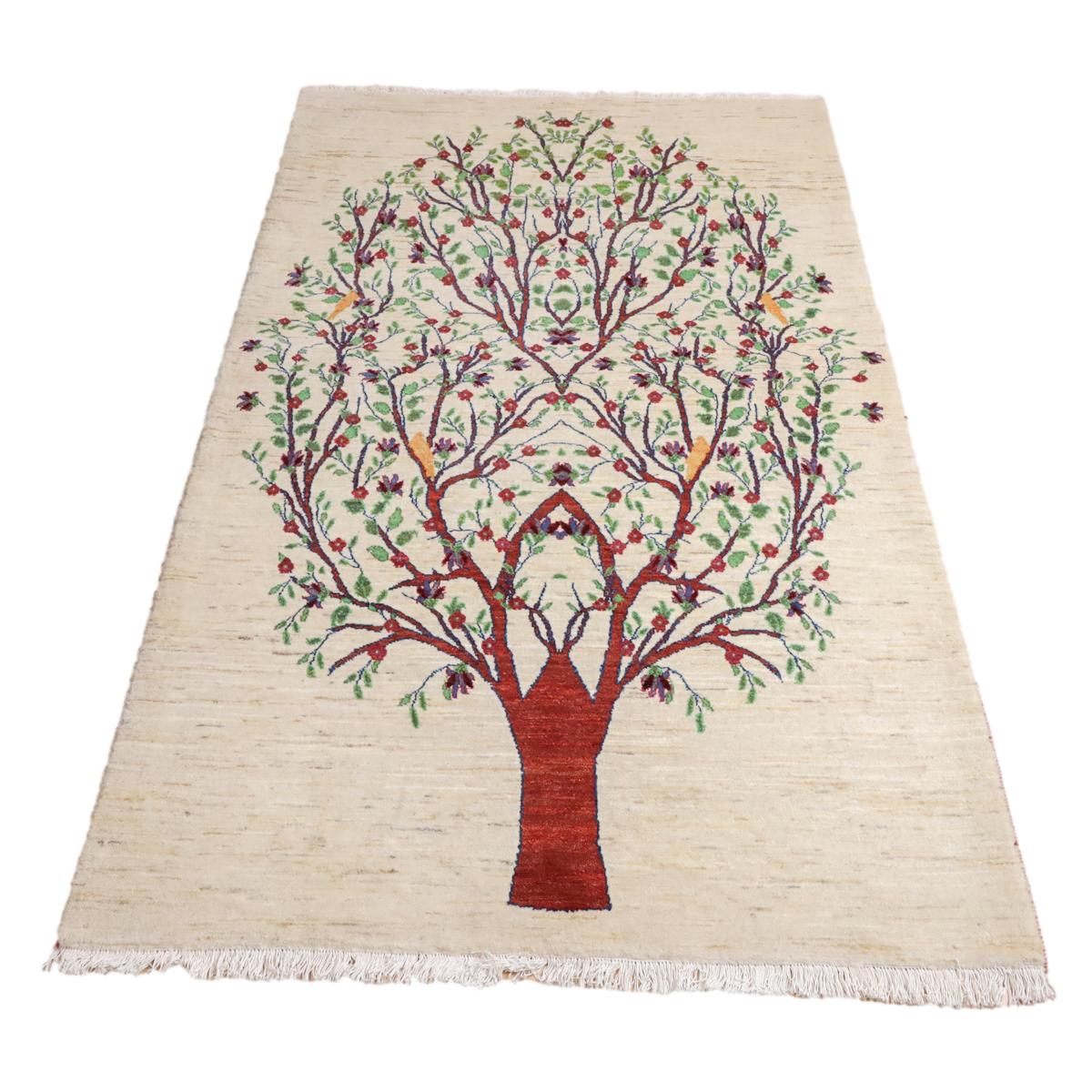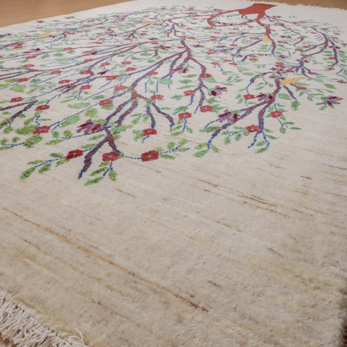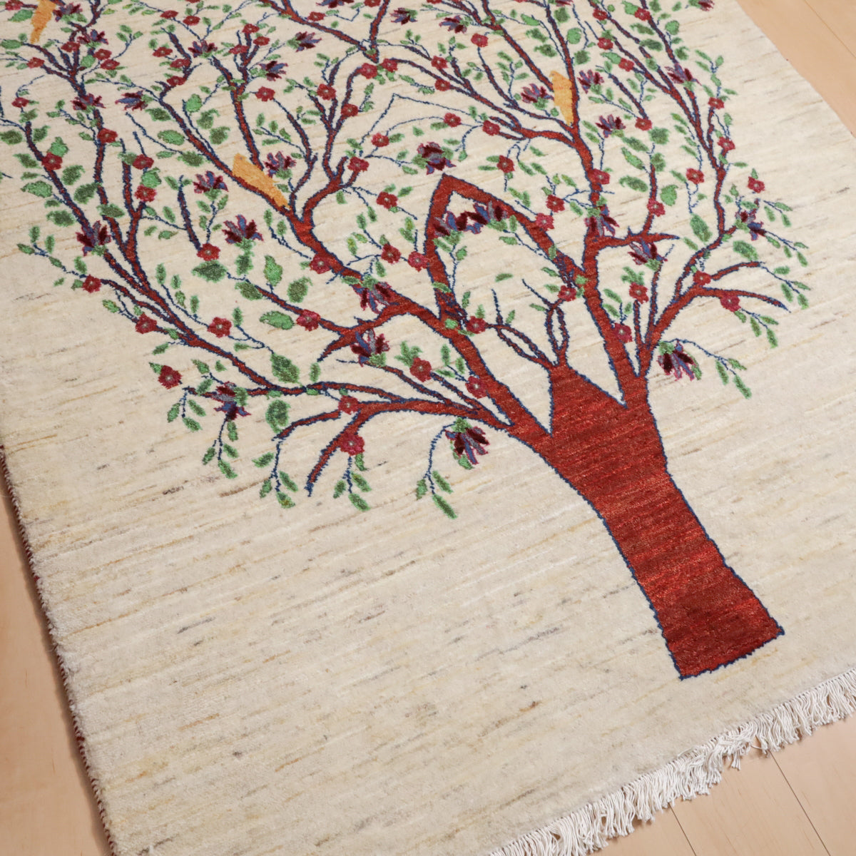 羊の毛色を生かした生成りを基調に、画面いっぱいに赤茶色の幹を持つ大きな生命の木のモチーフが描かれたギャッベ。緑の葉と赤い花々が枝いっぱいに広がり、生命力と豊かさを感じさせます。所々に黄色い鳥たちがとまって、優しく楽し気な色彩のアクセントになっています。お部屋に自然の美しさと温かみをもたらす一枚です。