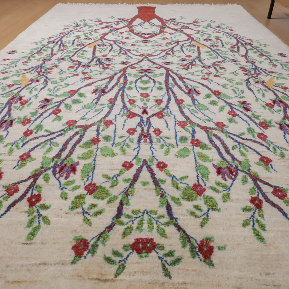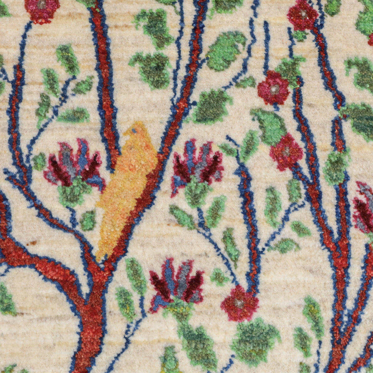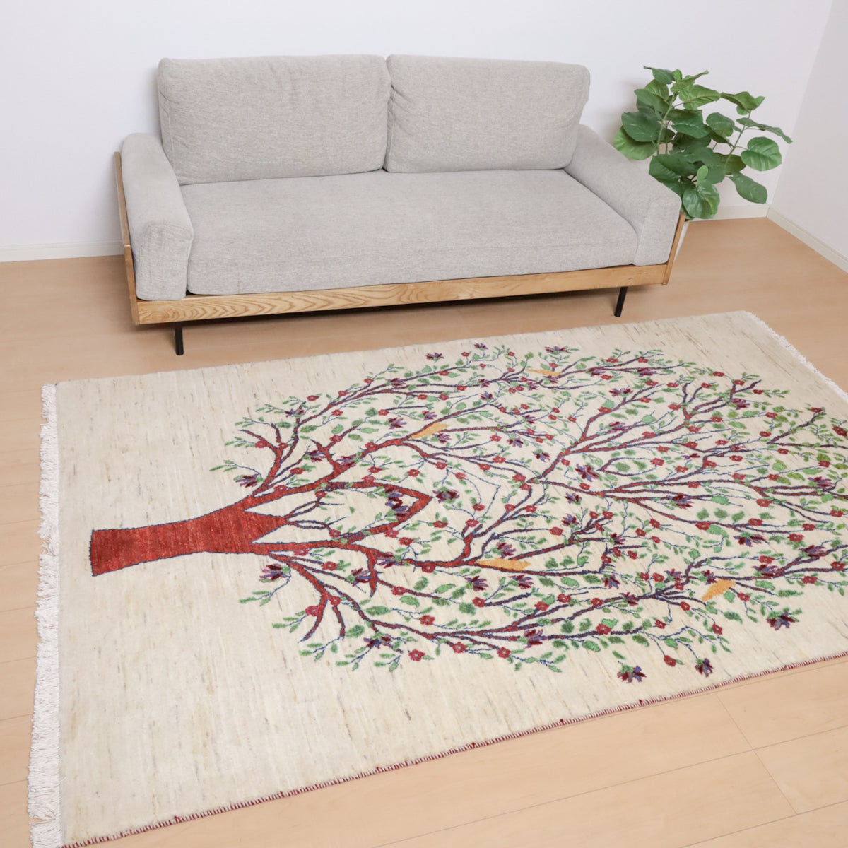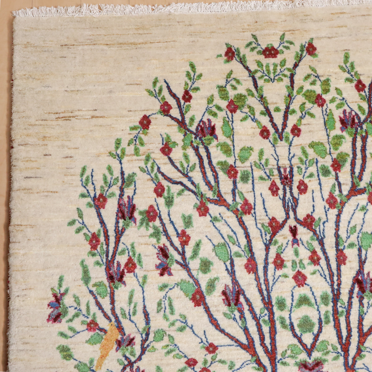羊の毛色を生かした生成りを基調に、画面いっぱいに赤茶色の幹を持つ大きな生命の木のモチーフが描かれたギャッベ。緑の葉と赤い花々が枝いっぱいに広がり、生命力と豊かさを感じさせます。所々に黄色い鳥たちがとまって、優しく楽し気な色彩のアクセントになっています。お部屋に自然の美しさと温かみをもたらす一枚です。