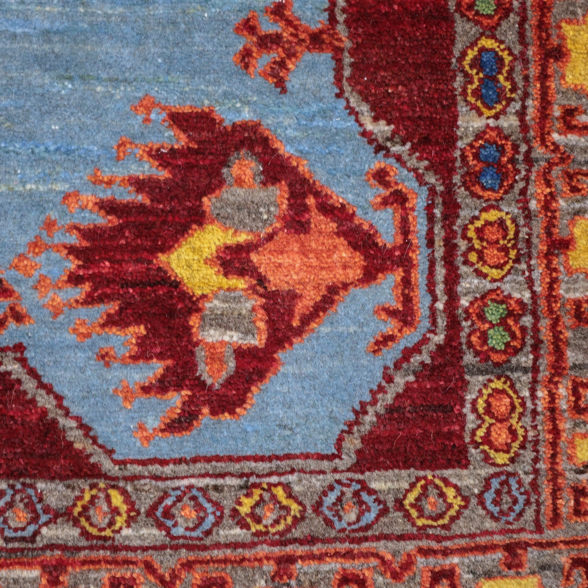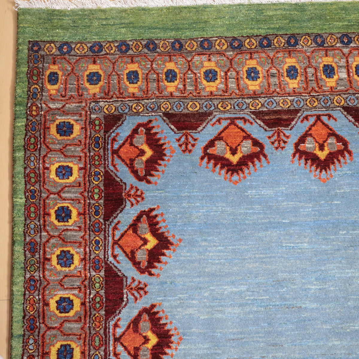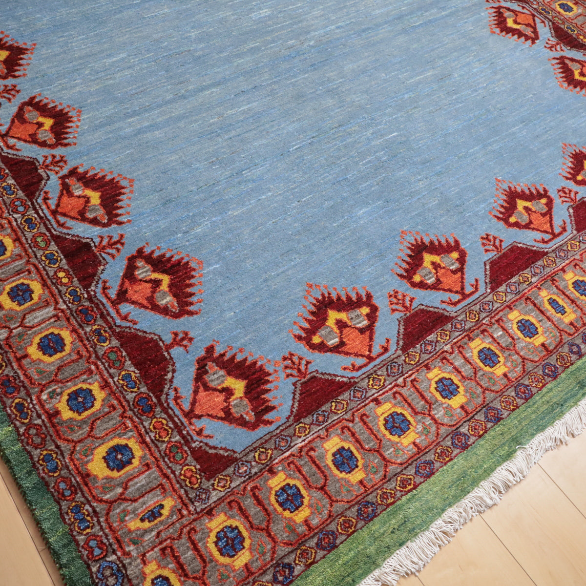 優しい色合いの青を緑のフレームが取り囲み、その内側には深い赤や珊瑚色を基調とした伝統モチーフがふんだんに描かれています。細かな手織りの技術が冴えわたり、整然とした伝統柄の美を表現しています。落ち着きがありつつも個性的な配色で、お部屋にモダンな印象を与えてくれる一枚です。