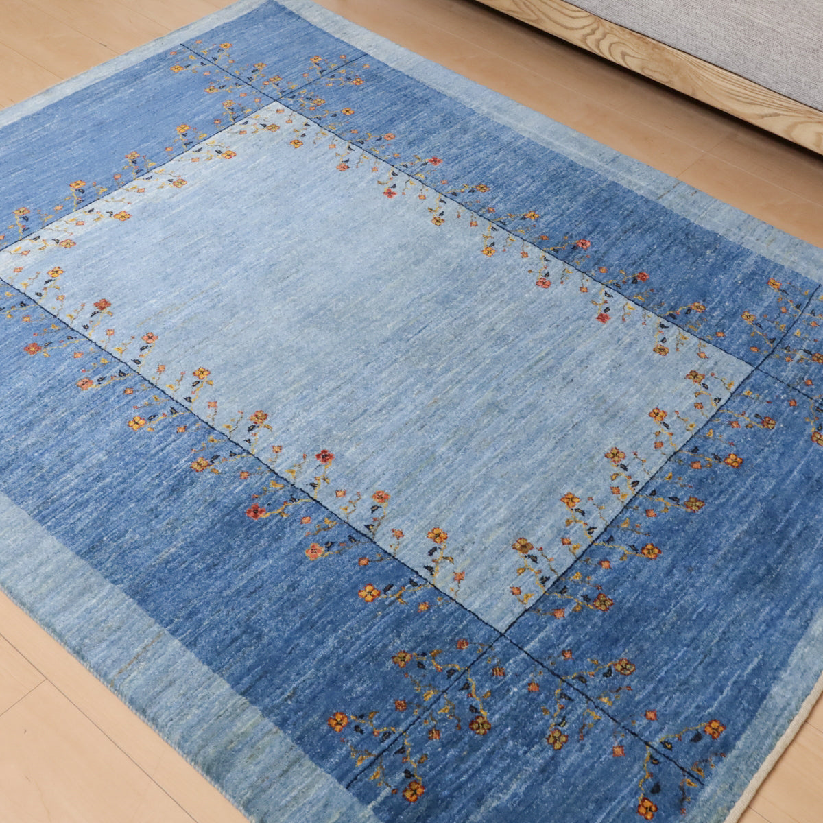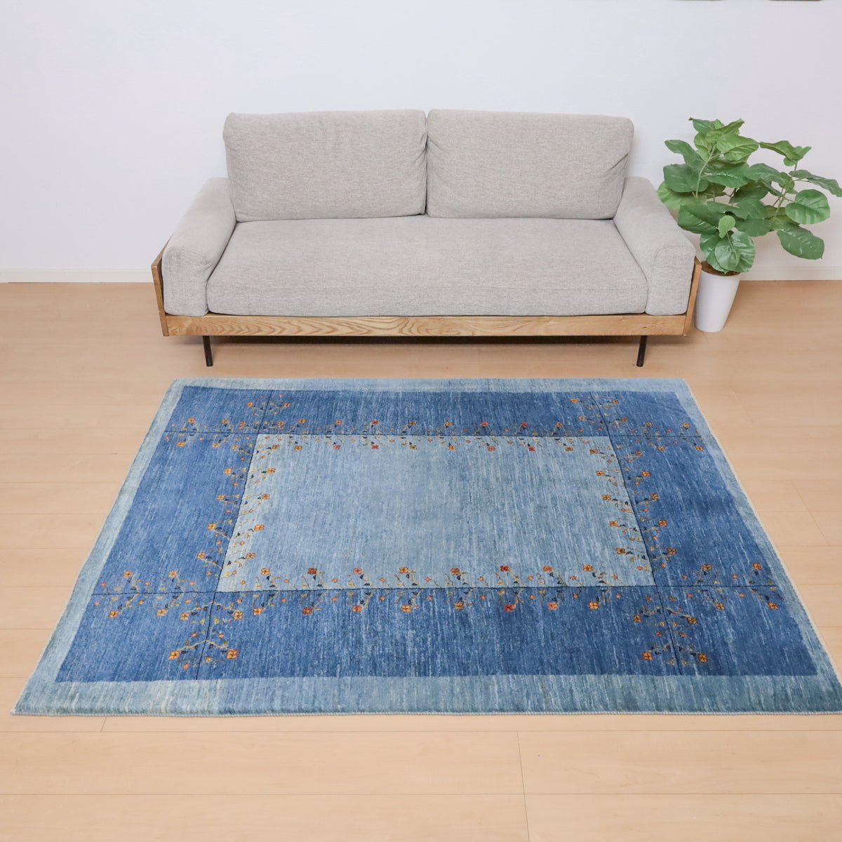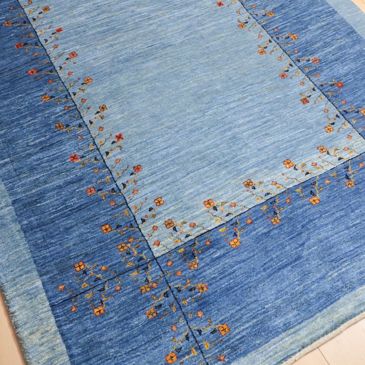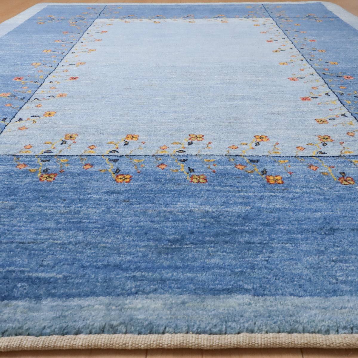 二色の青を基調にしたギャッベ。窓のように四角く区切られた線の上には、珊瑚色と黄色の小花のモチーフが描かれ、さりげない美しさがシンプルなデザインを引き立てています。お部屋に爽やかで落ち着いた雰囲気を作り出す一枚です。