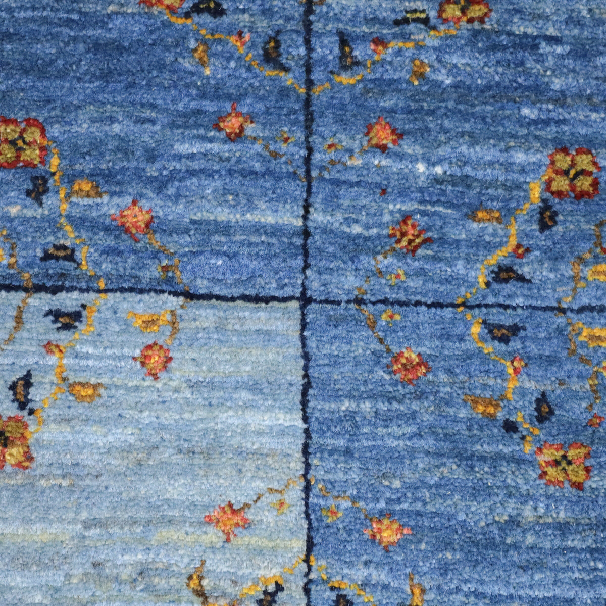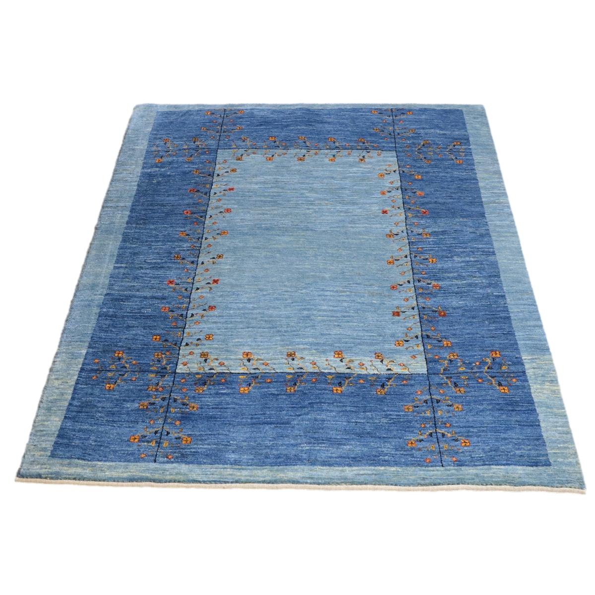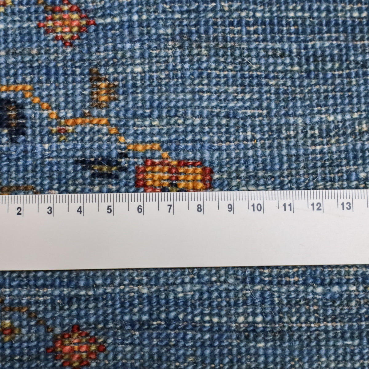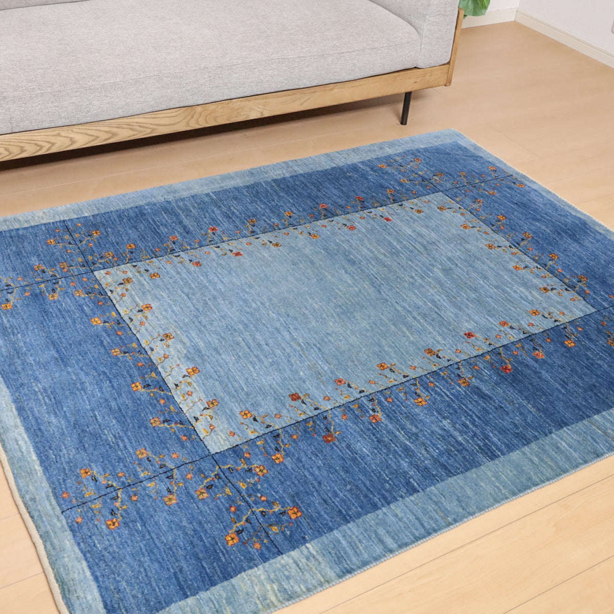 二色の青を基調にしたギャッベ。窓のように四角く区切られた線の上には、珊瑚色と黄色の小花のモチーフが描かれ、さりげない美しさがシンプルなデザインを引き立てています。お部屋に爽やかで落ち着いた雰囲気を作り出す一枚です。