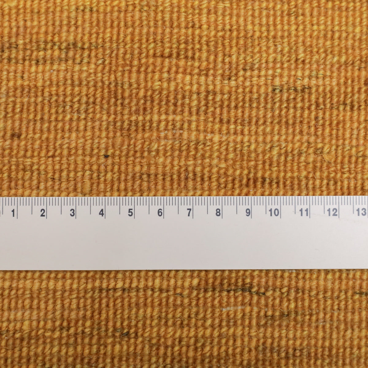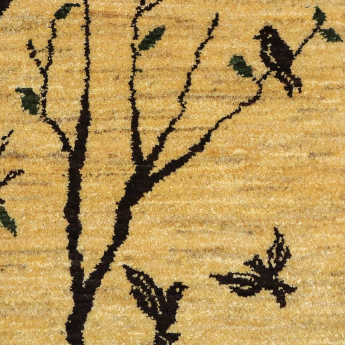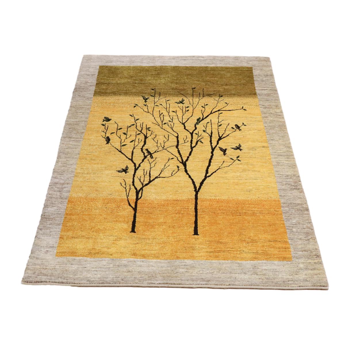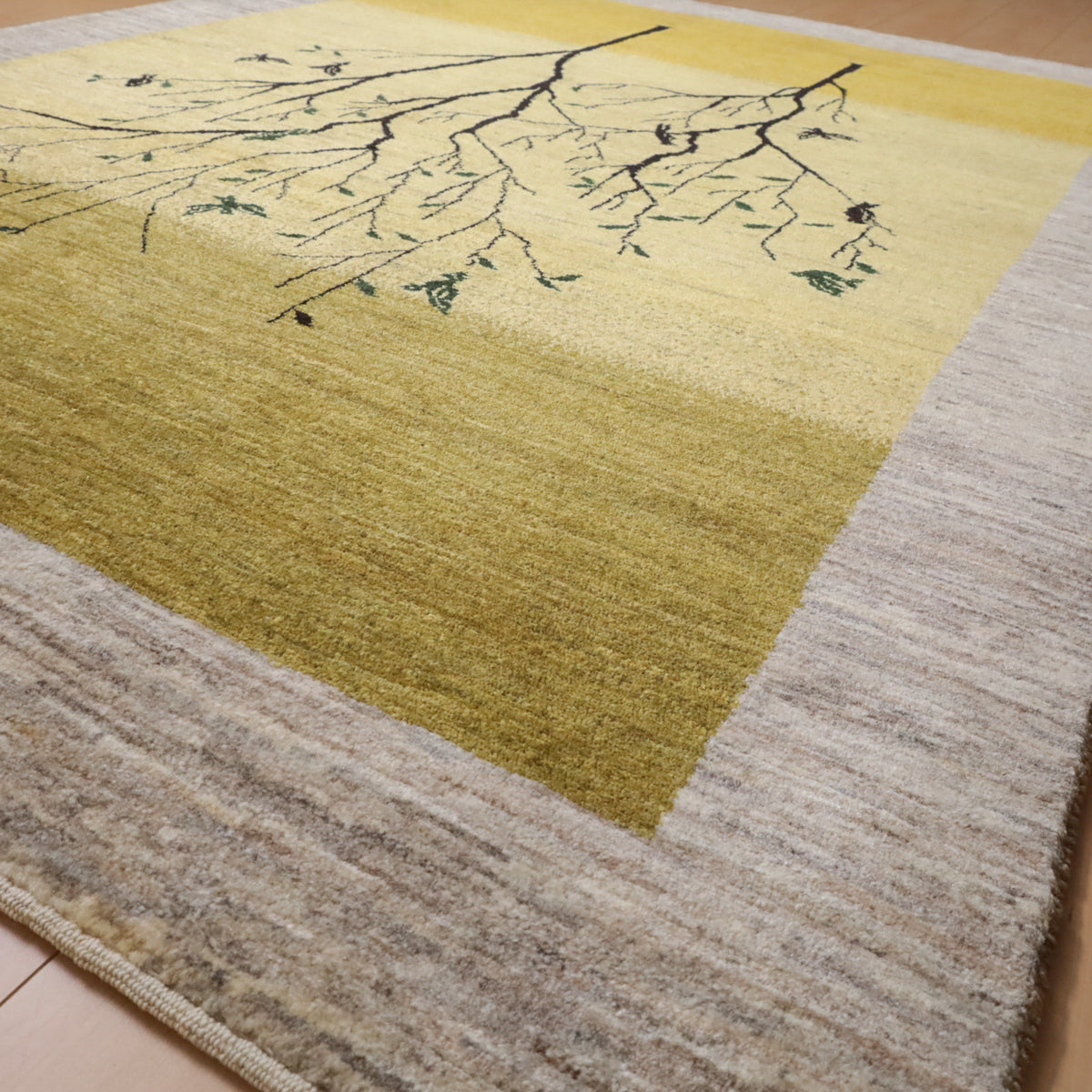 黄色のグラデーションを基調にしたギャッベ。中央には黒い木のシルエットが描かれ、その枝には鳥が飛び交う、詩的で印象的なデザインです。羊の毛色を生かした生成りのフレームが窓のように全体を包み込み、落ち着かせています。絵画のように美しく、洗練された魅力を持った一枚です。