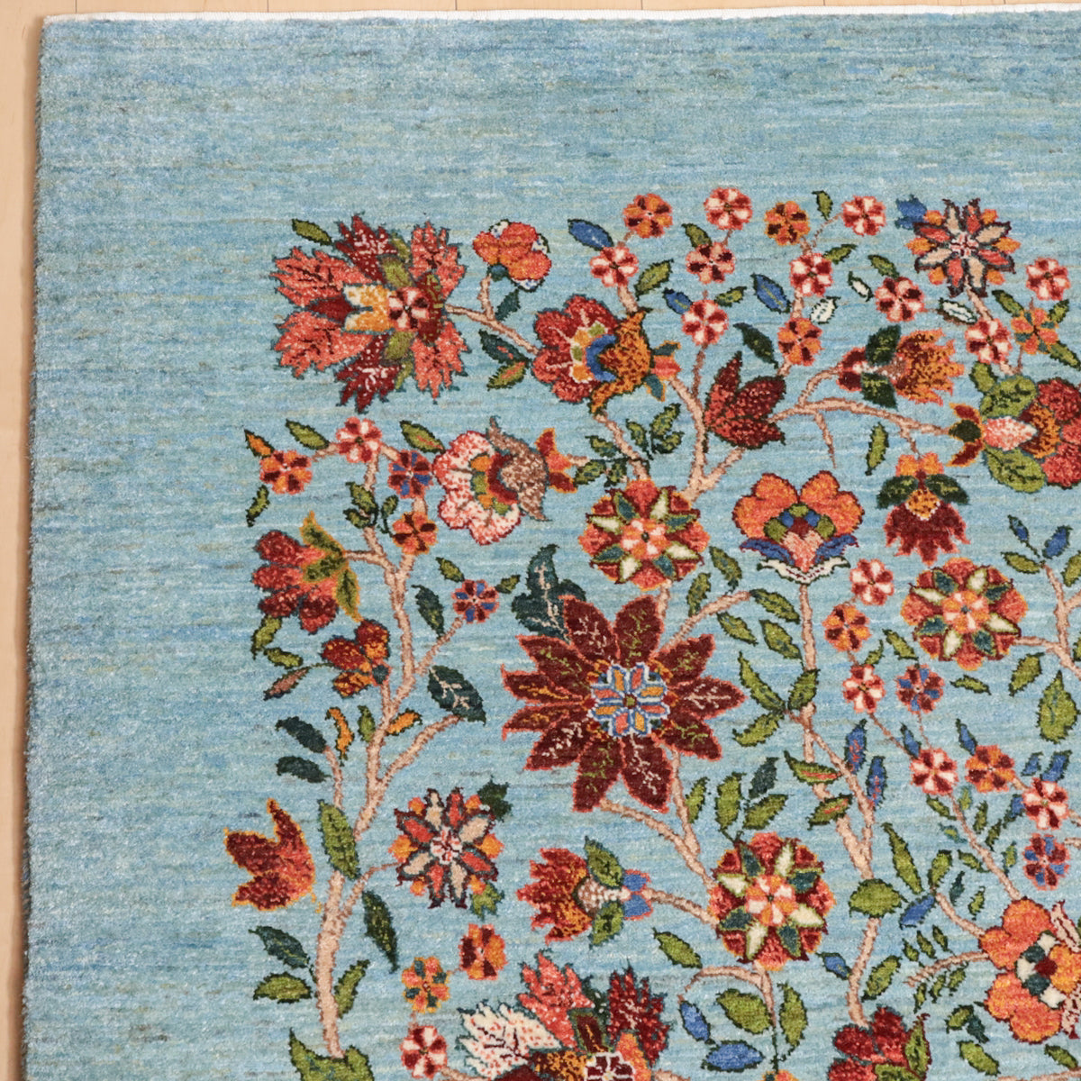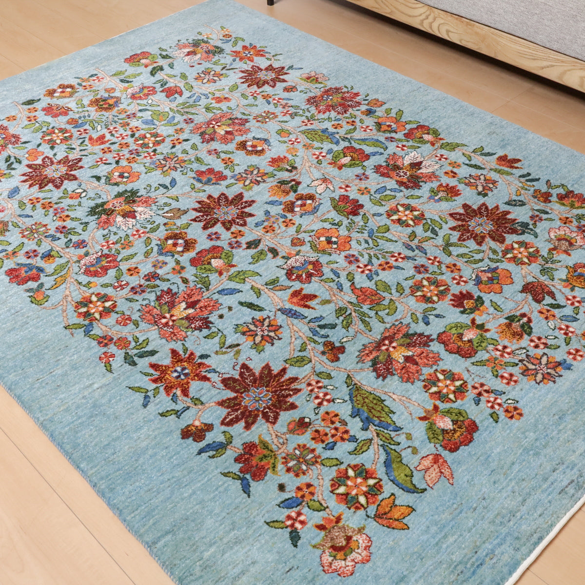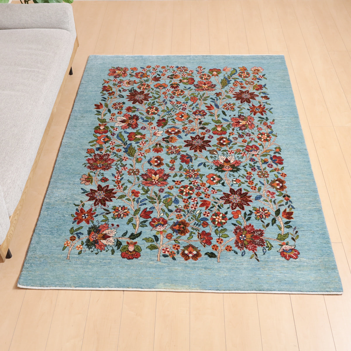 ほんのり緑色を帯びたような、優しい水色を基調にしたギャッベ。全面に深い赤や珊瑚色のカラフルな花々が繊細なタッチで描かれ、華やかで高貴な印象を与えます。高いデザイン性と手織りの技術が冴えわたる、上品で洗練された空間を作り出す一枚です。