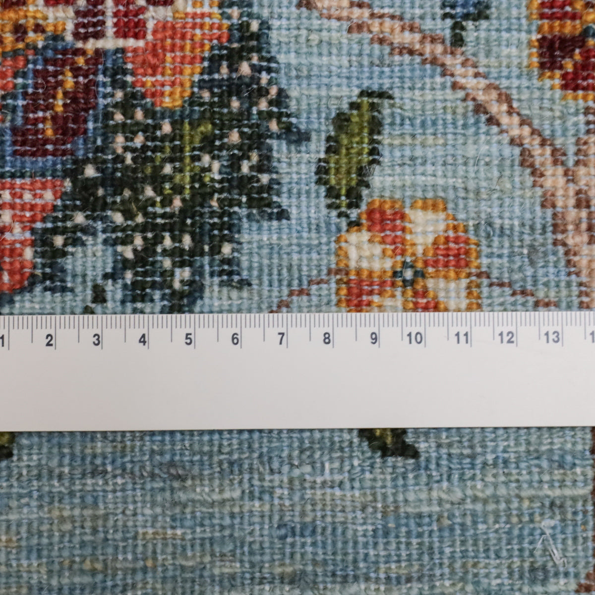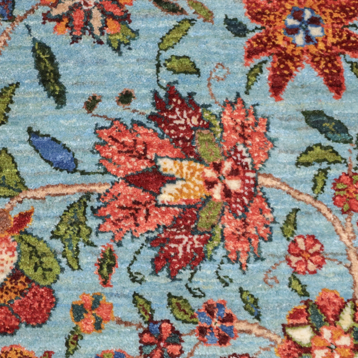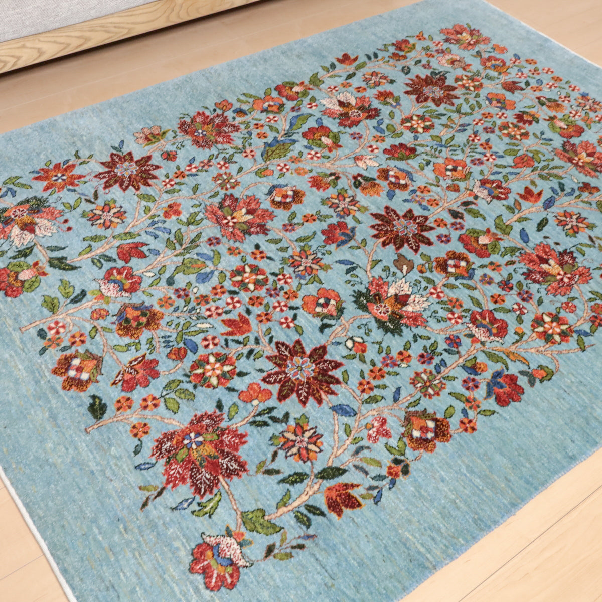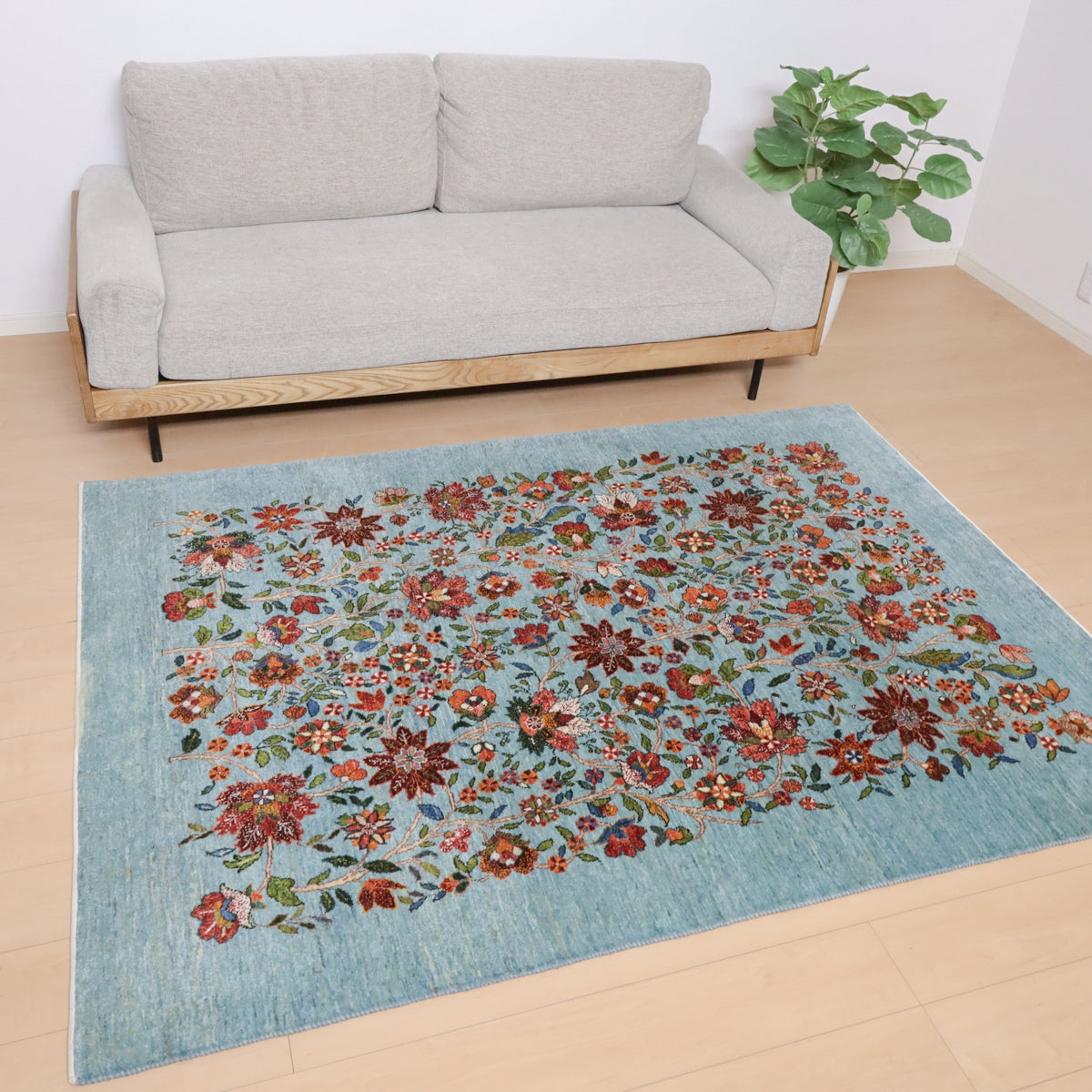 ほんのり緑色を帯びたような、優しい水色を基調にしたギャッベ。全面に深い赤や珊瑚色のカラフルな花々が繊細なタッチで描かれ、華やかで高貴な印象を与えます。高いデザイン性と手織りの技術が冴えわたる、上品で洗練された空間を作り出す一枚です。