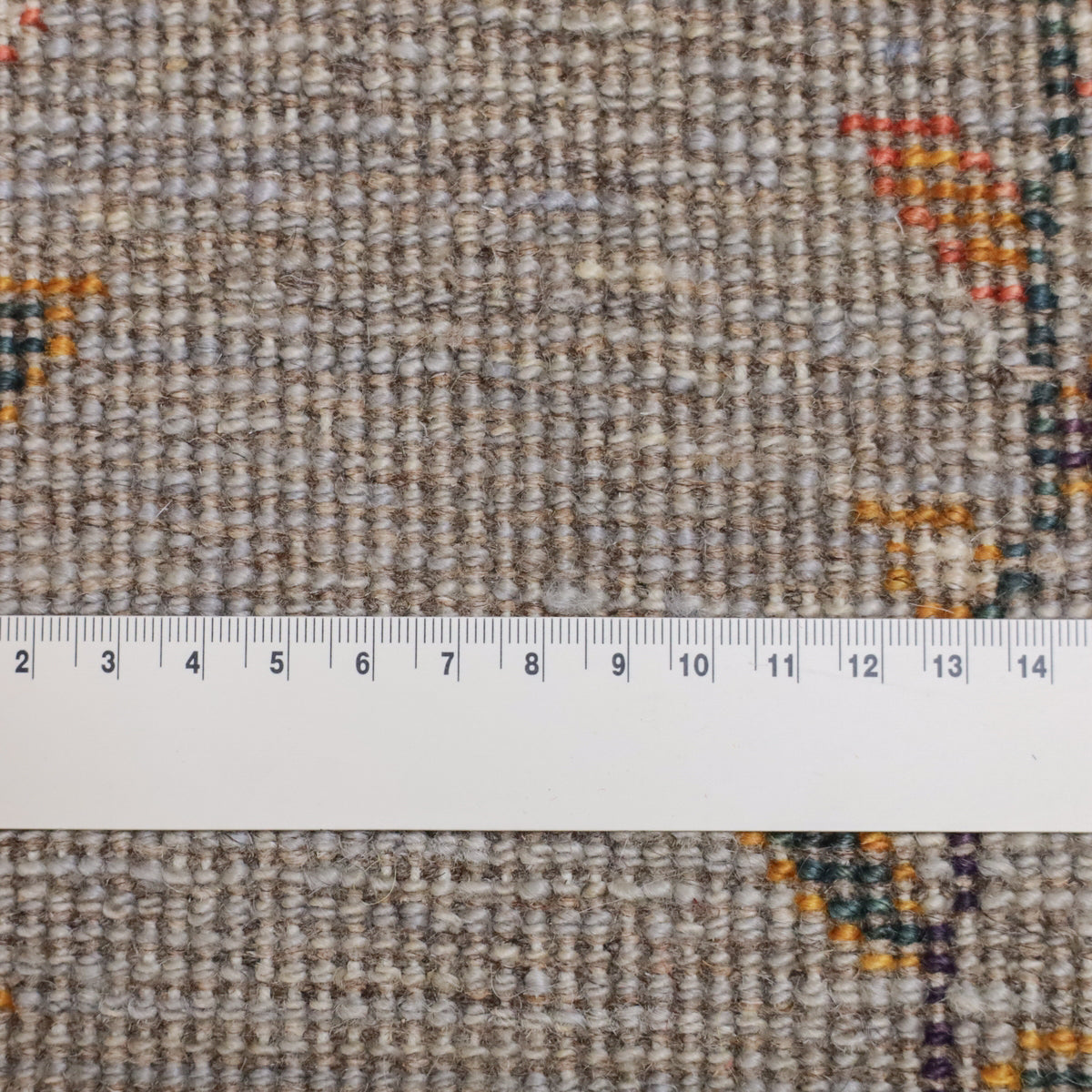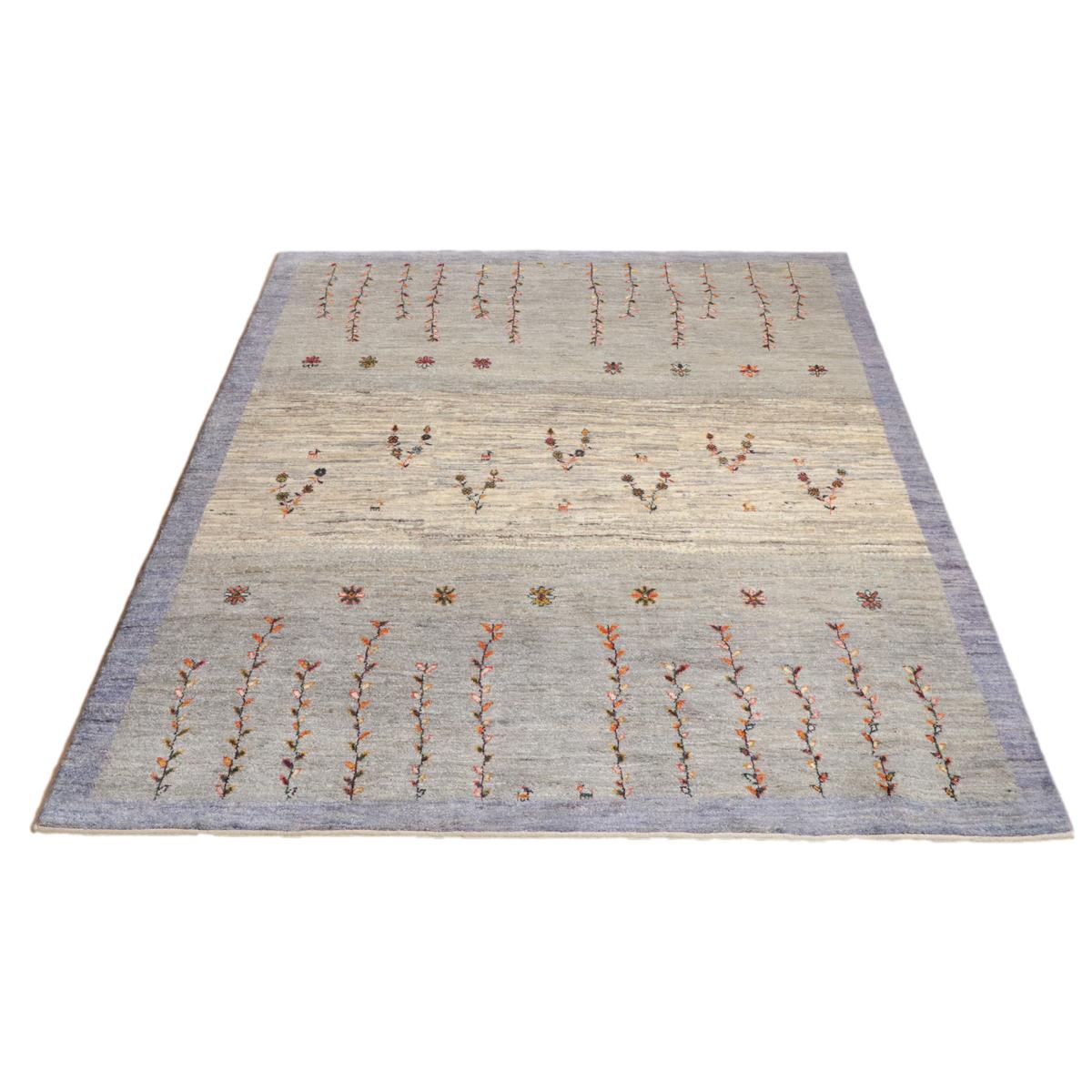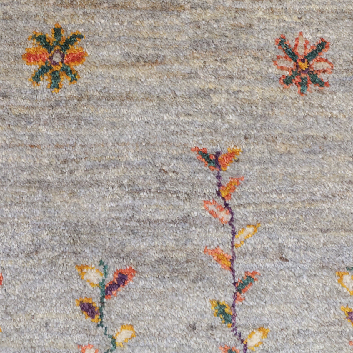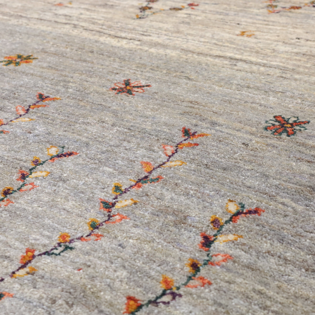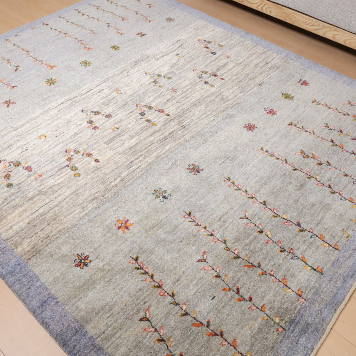 落ち着いたグレーのアブラシ(グラデーション)を基調に、花や葉のモチーフが散りばめられたギャッベ。青みの強いグレー、黄みがかったグレーなど、様々なグレーが巧みに配された秀逸なデザインです。可愛らしいタッチで描かれた花々や蔓には、珊瑚色や深みのある紫や緑が用いられています。優しく和やかな空間を演出してくれる一枚です。