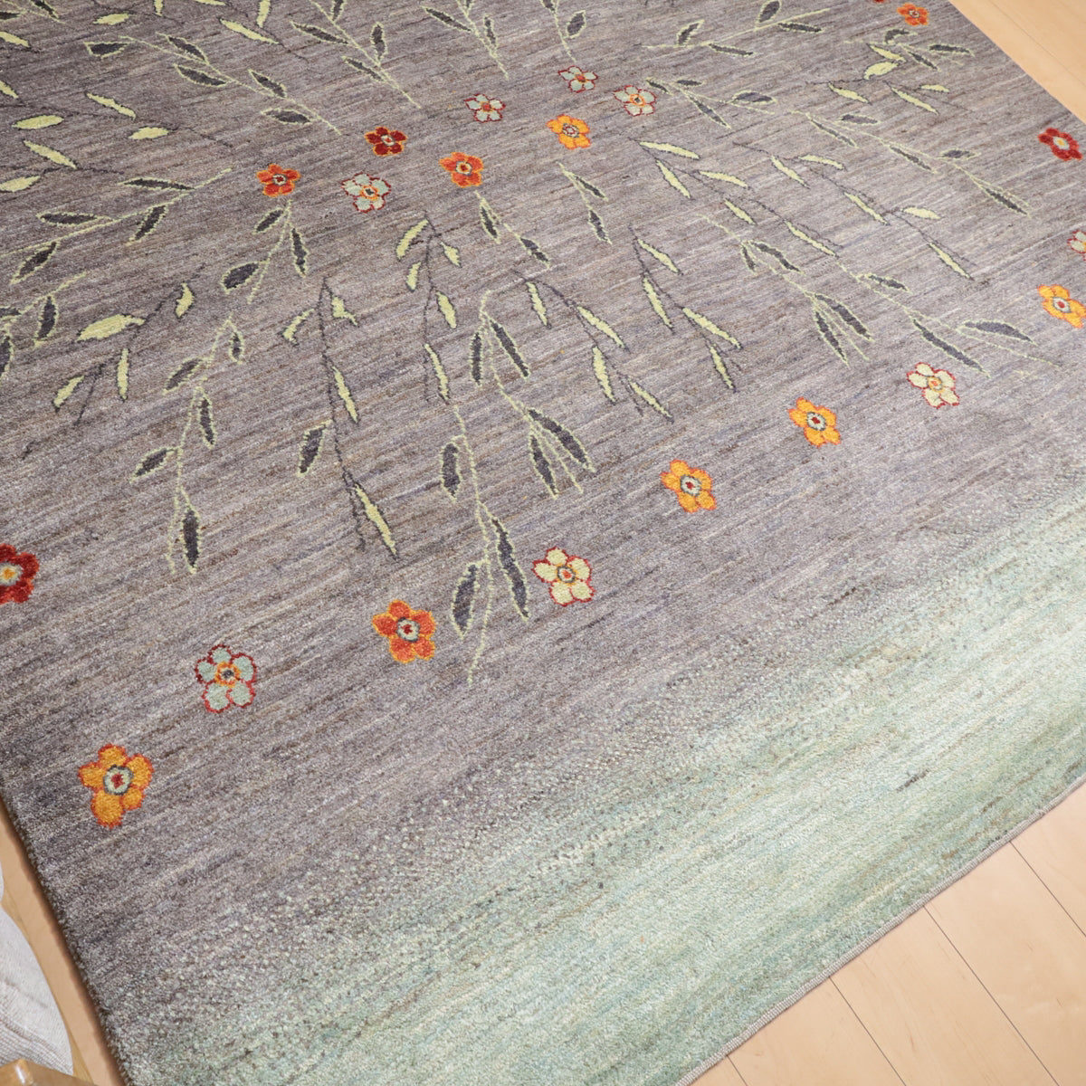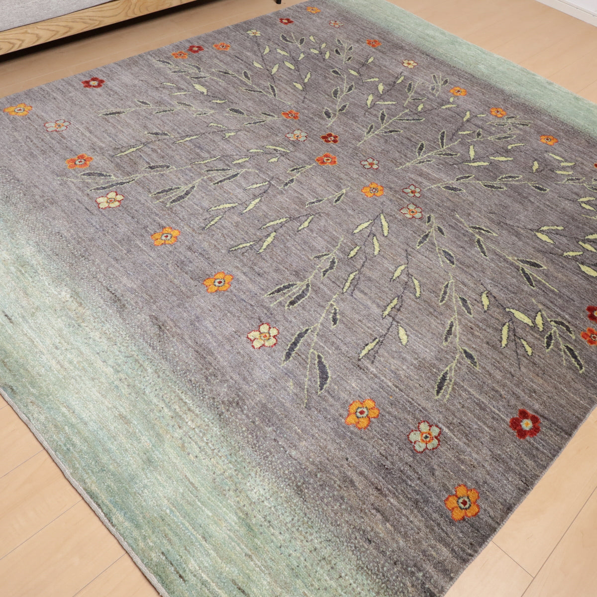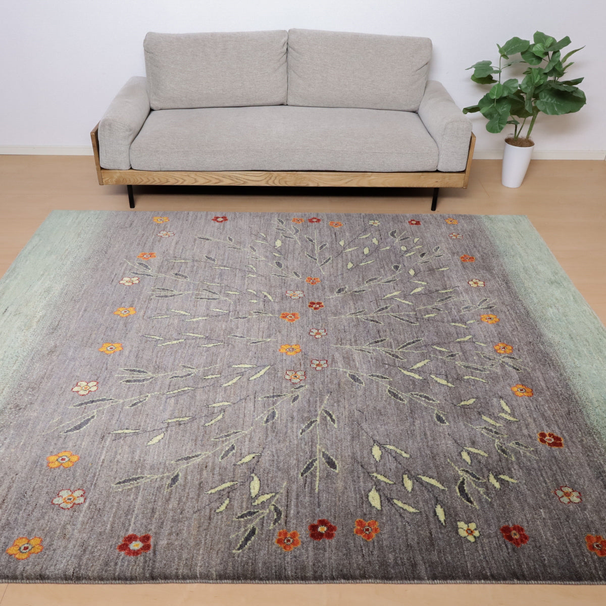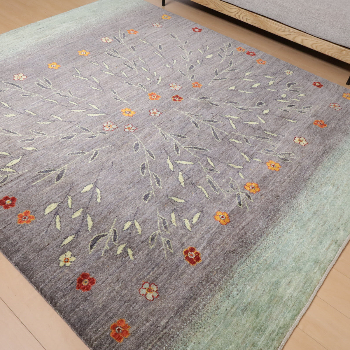 落ち着いたグレーのグラデーションを基調に、カラフルな花のモチーフが印象的に描かれたギャッベです。赤や珊瑚色の花々と茎のモチーフが中心から放射状に広がり、ダイナミックでありながらも調和のとれたデザインです。お部屋に温かみと華やかさをプラスしてくれる一枚です。