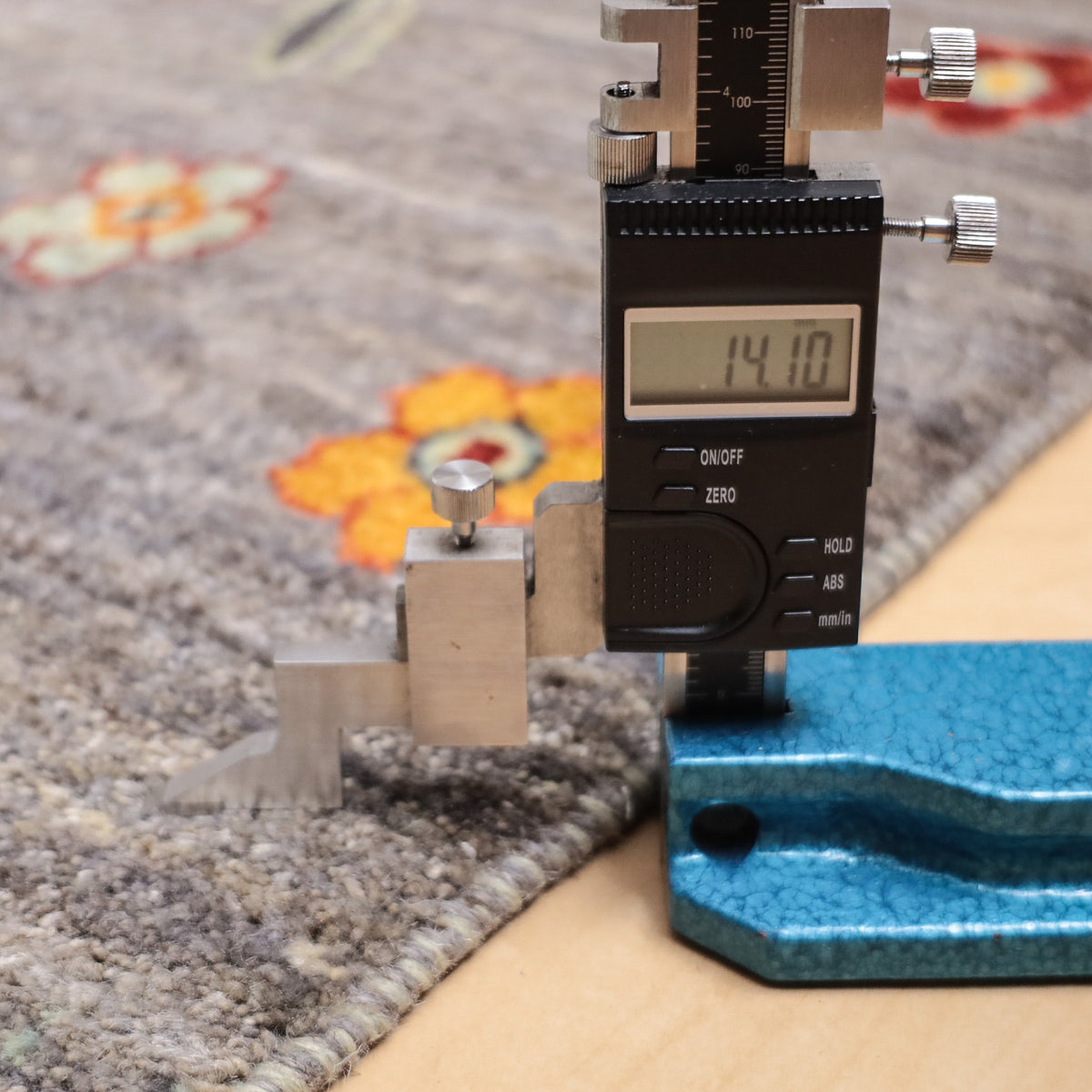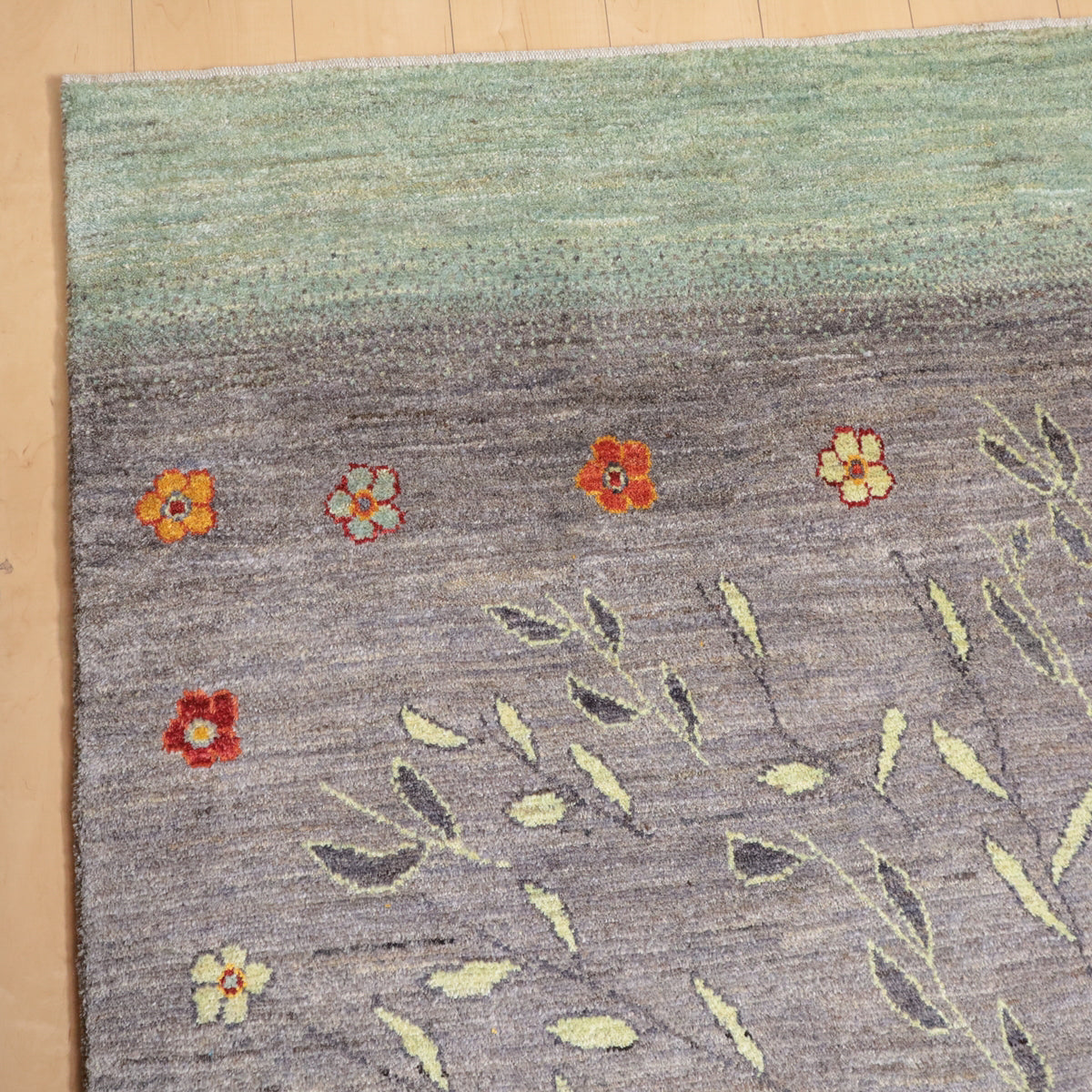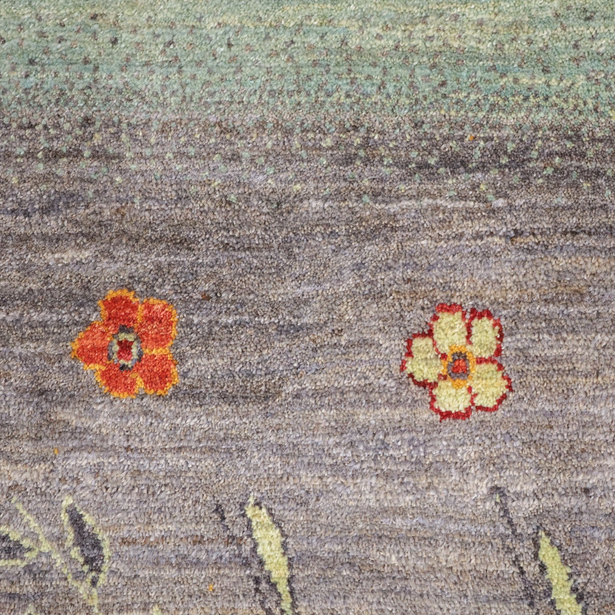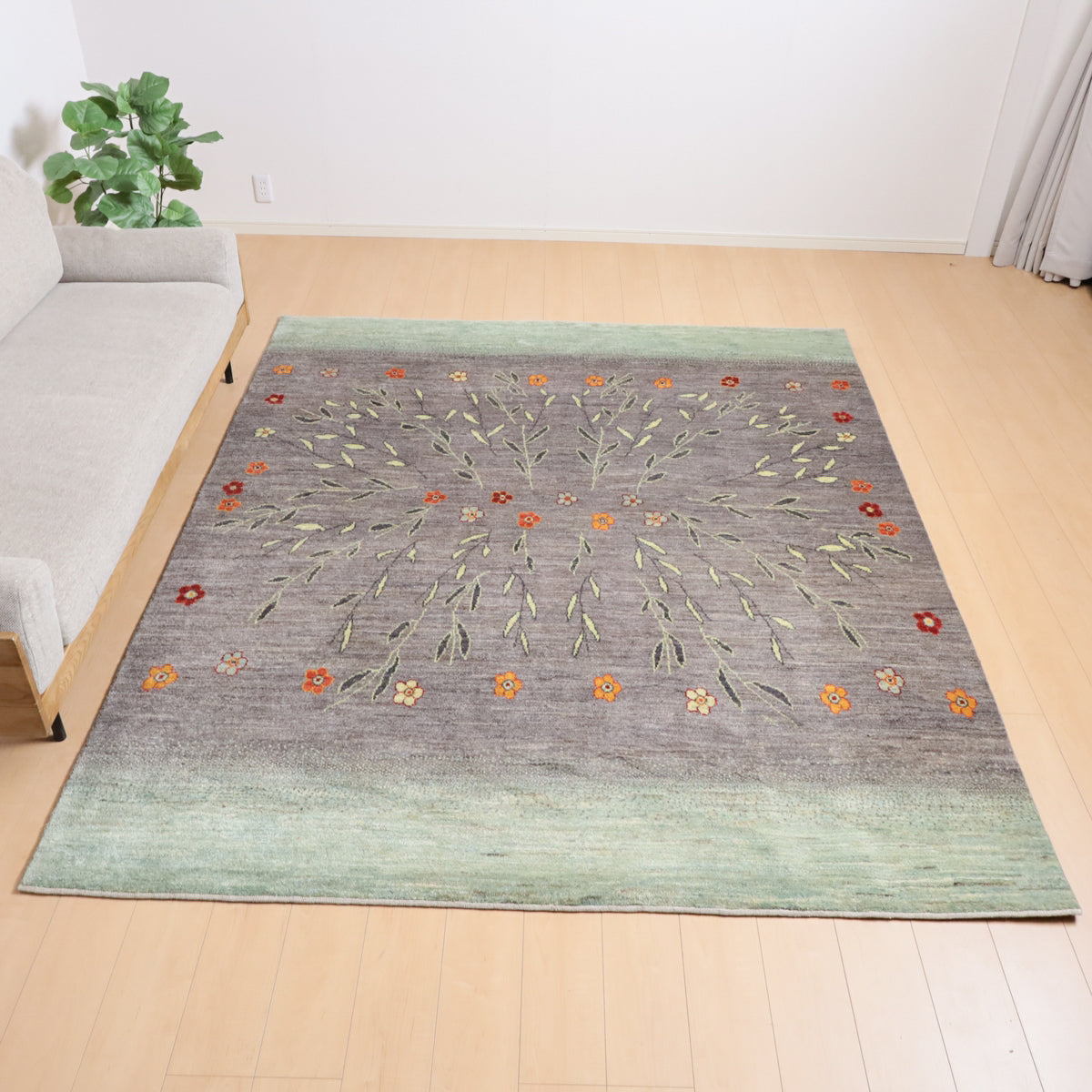落ち着いたグレーのグラデーションを基調に、カラフルな花のモチーフが印象的に描かれたギャッベです。赤や珊瑚色の花々と茎のモチーフが中心から放射状に広がり、ダイナミックでありながらも調和のとれたデザインです。お部屋に温かみと華やかさをプラスしてくれる一枚です。