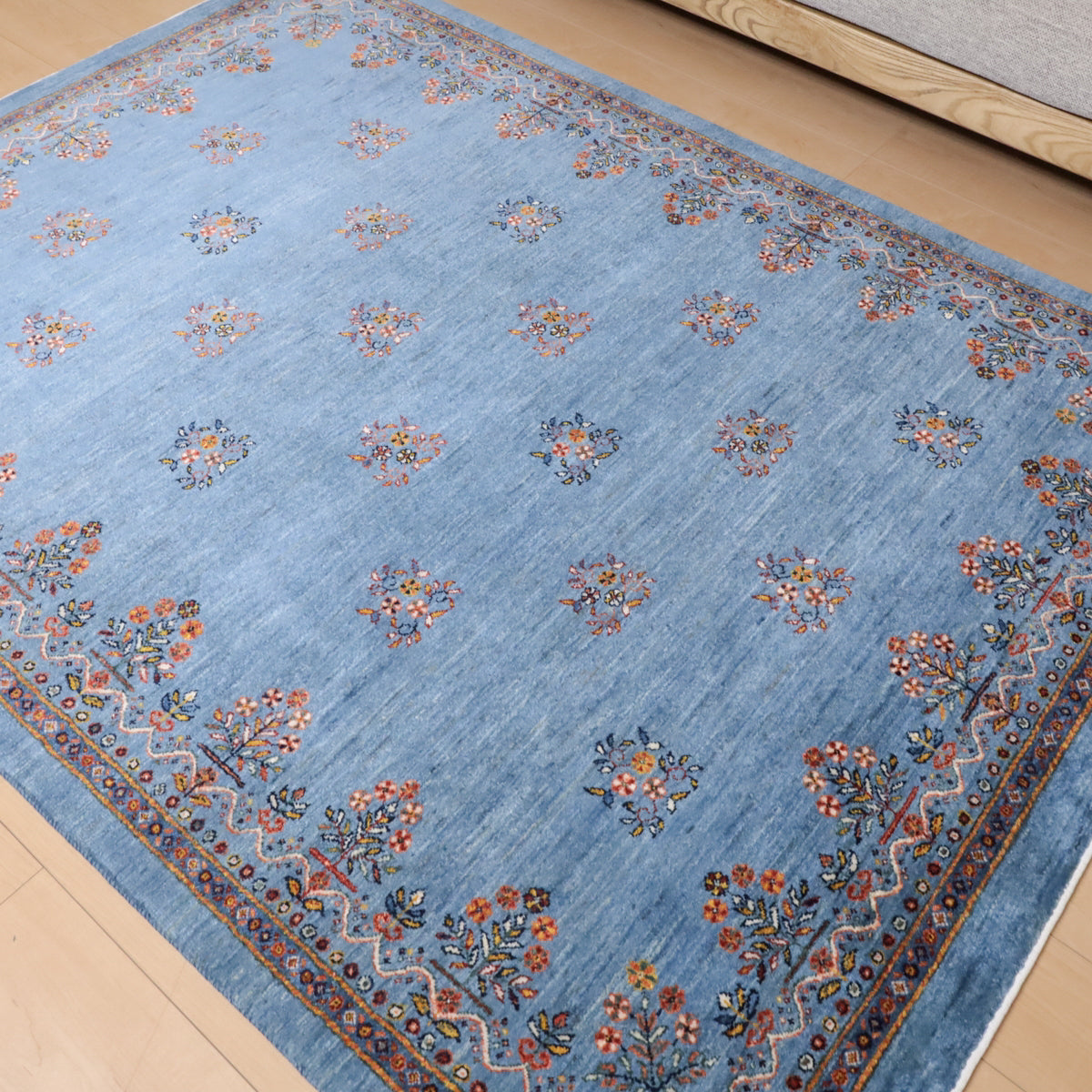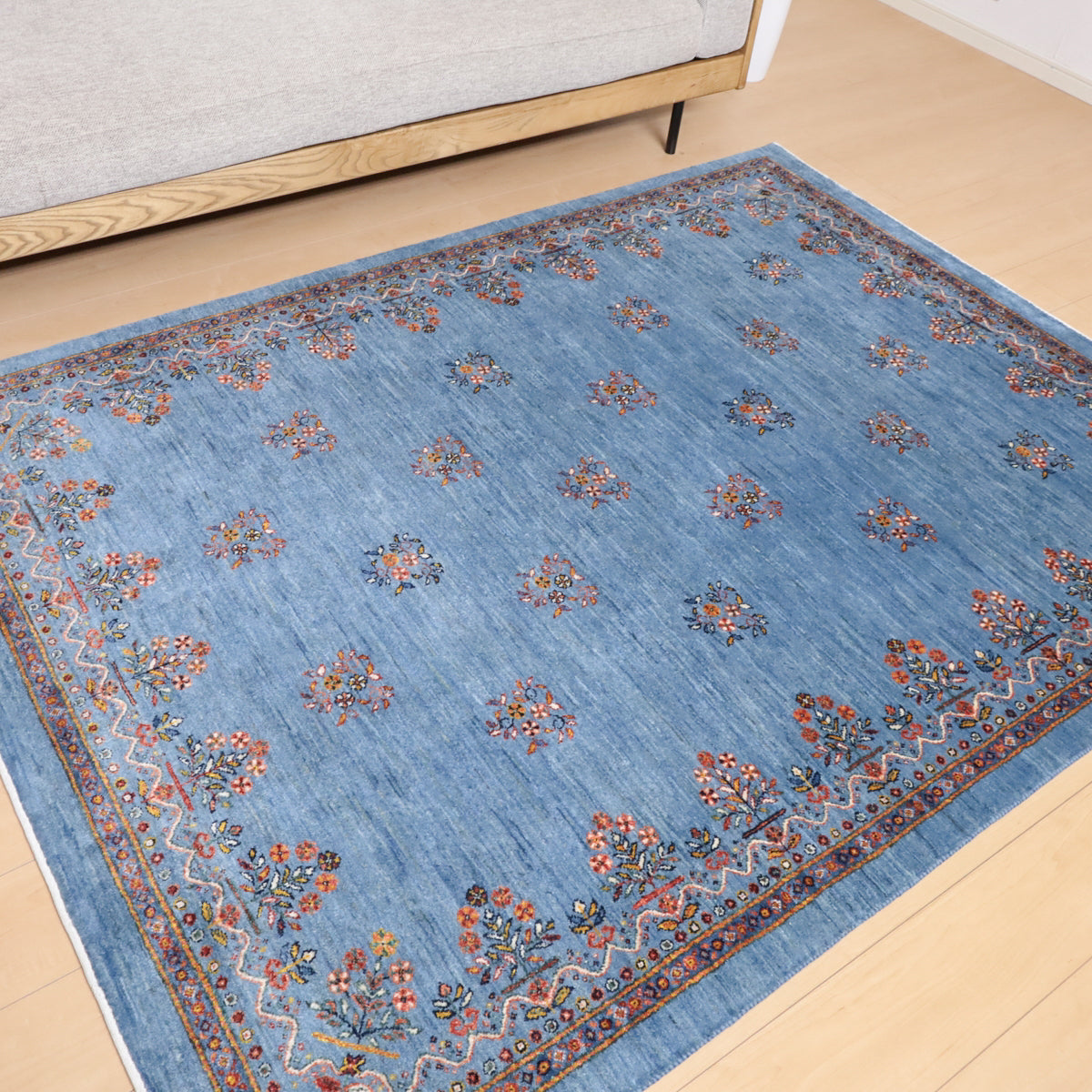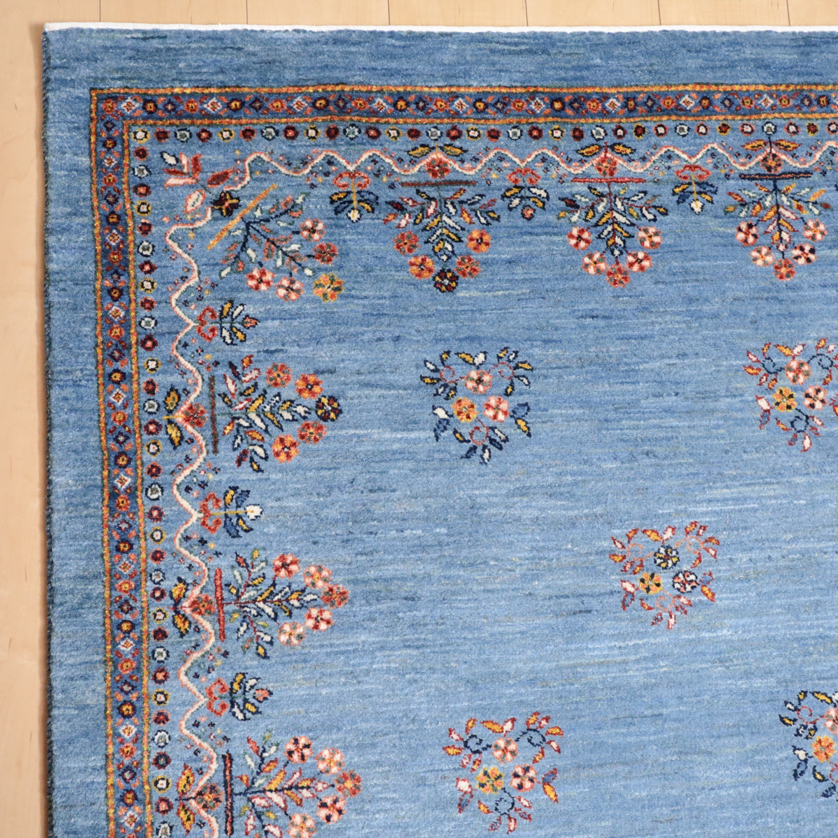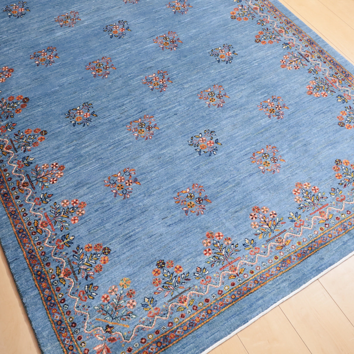 優しい青のアブラシ(グラデーション)を基調としたこのギャッベは、細かい花のモチーフが散りばめられた美しいデザインが印象的。縁にもカラフルな花々が描かれ、全体に華やかさをプラスしています。手織りの温かみと繊細なデザインが、優雅で心地よい空間を演出します。