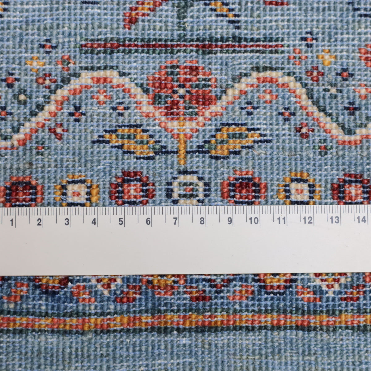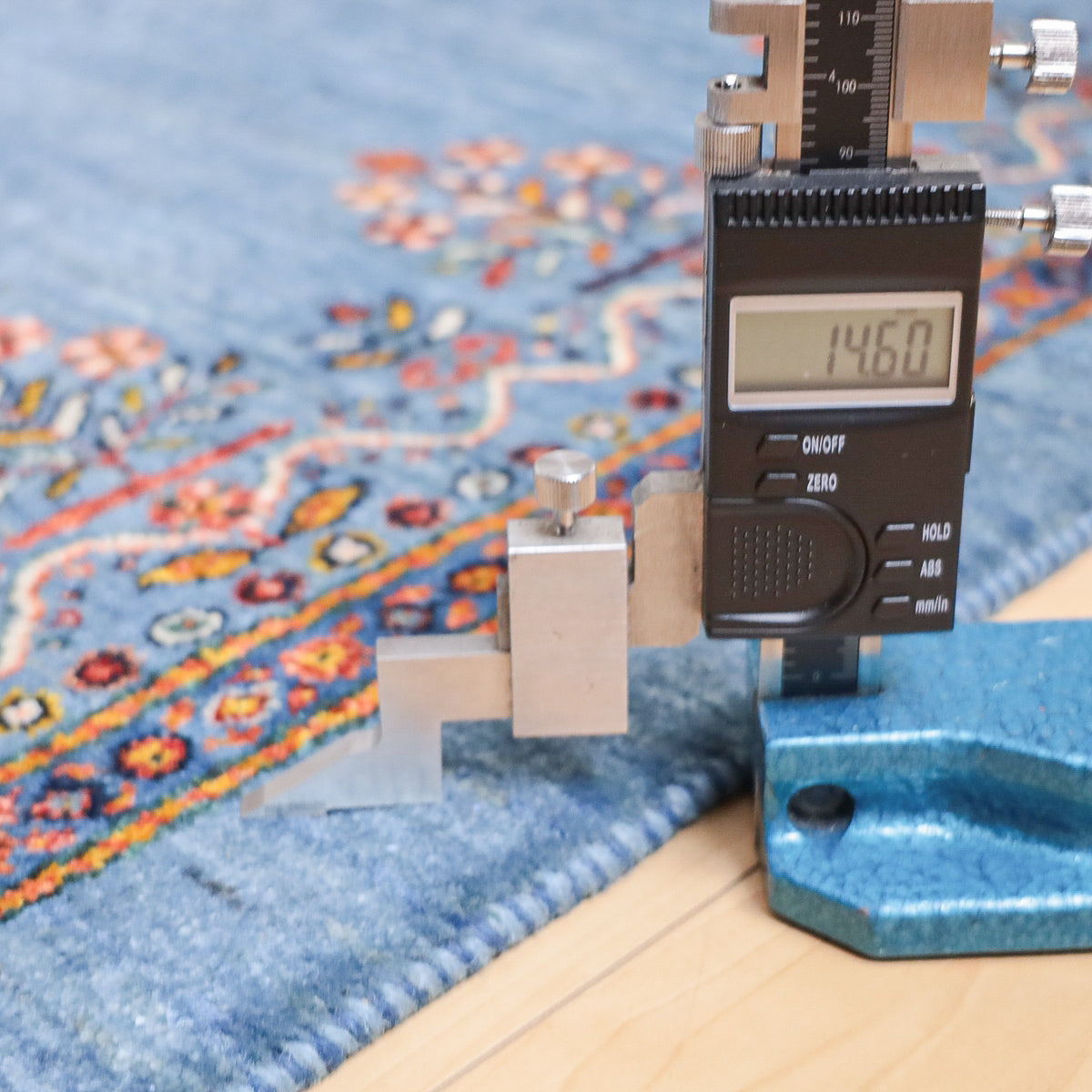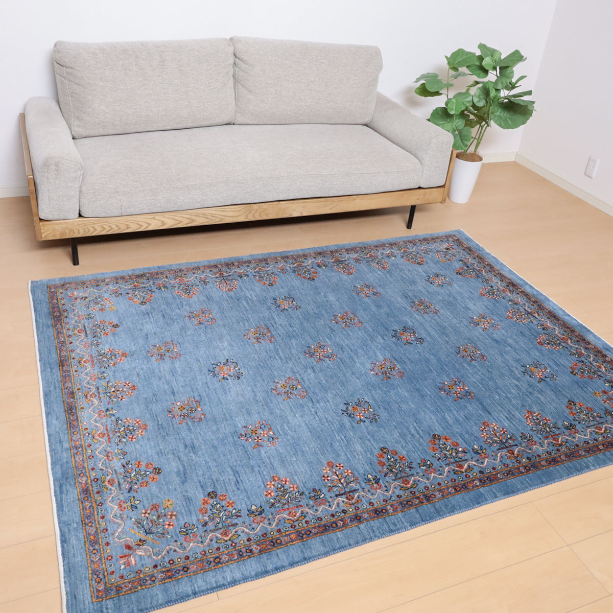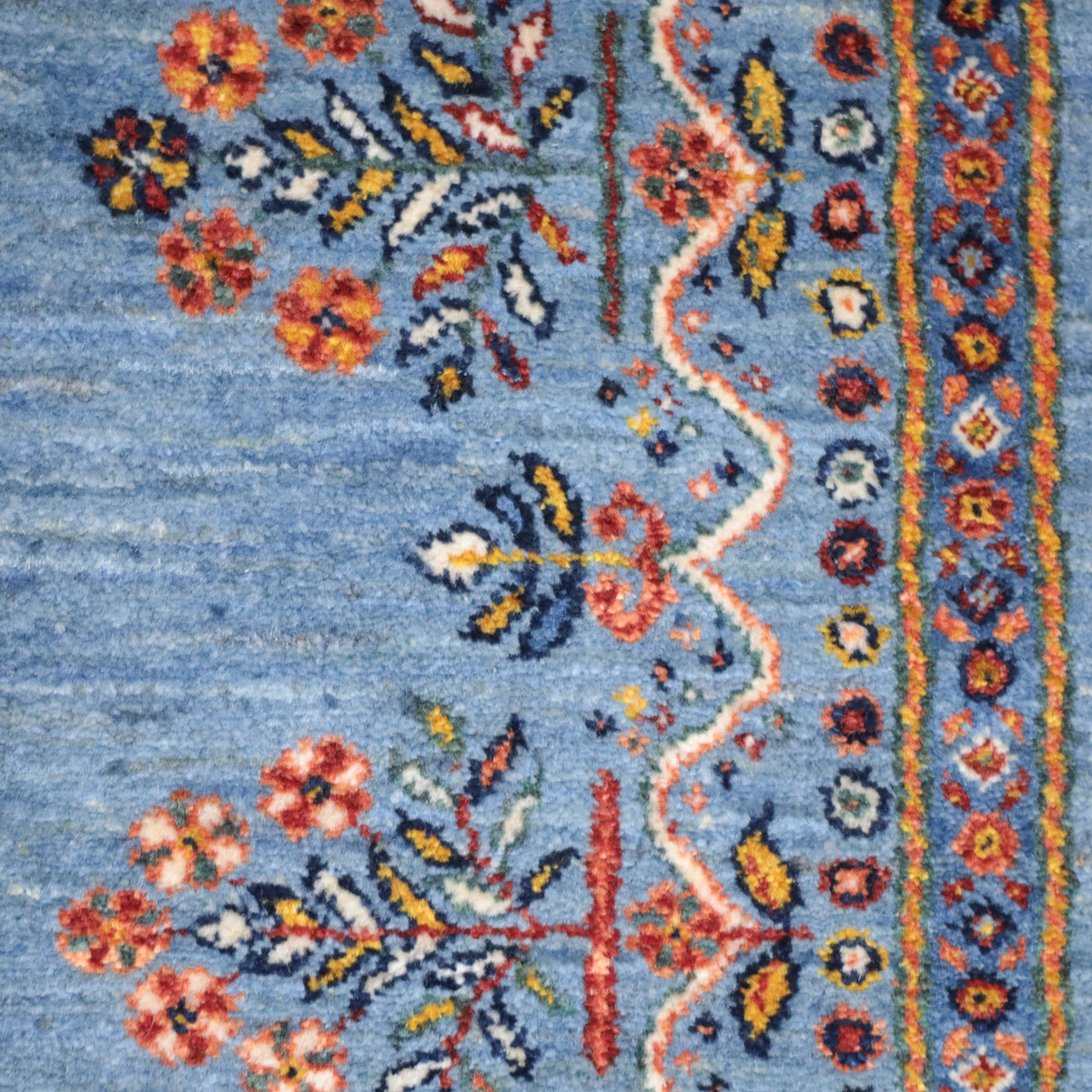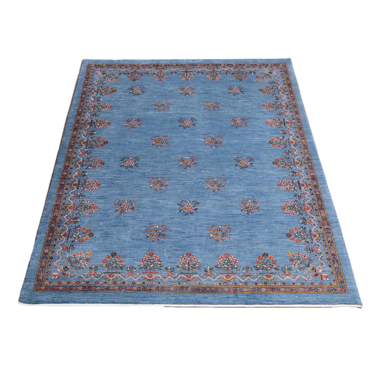 優しい青のアブラシ(グラデーション)を基調としたこのギャッベは、細かい花のモチーフが散りばめられた美しいデザインが印象的。縁にもカラフルな花々が描かれ、全体に華やかさをプラスしています。手織りの温かみと繊細なデザインが、優雅で心地よい空間を演出します。