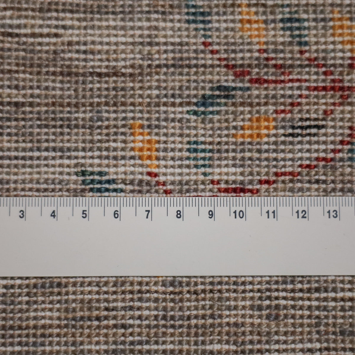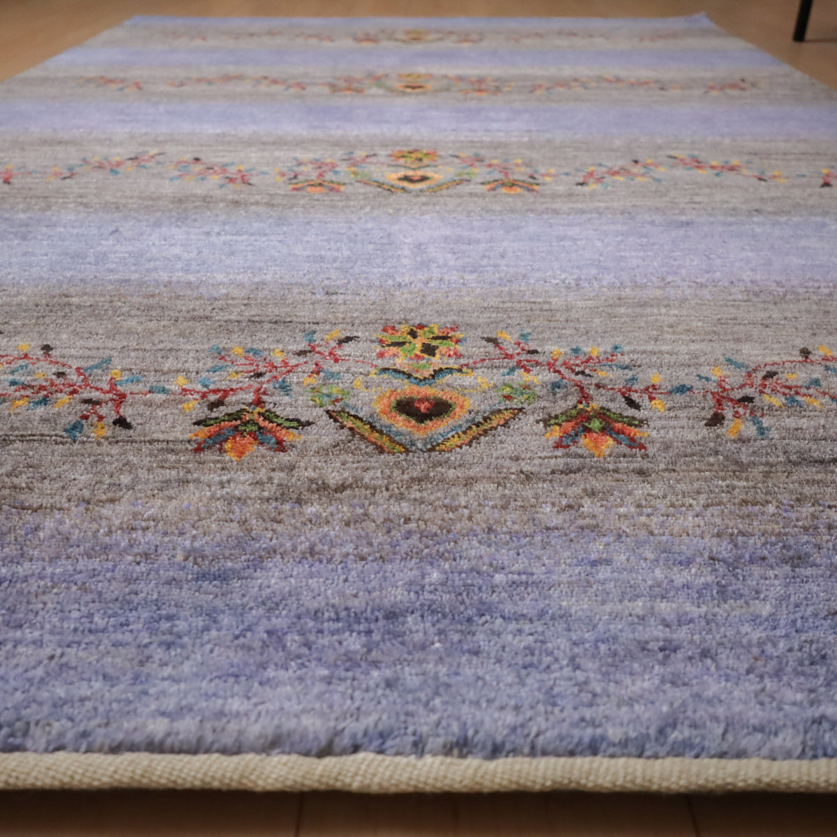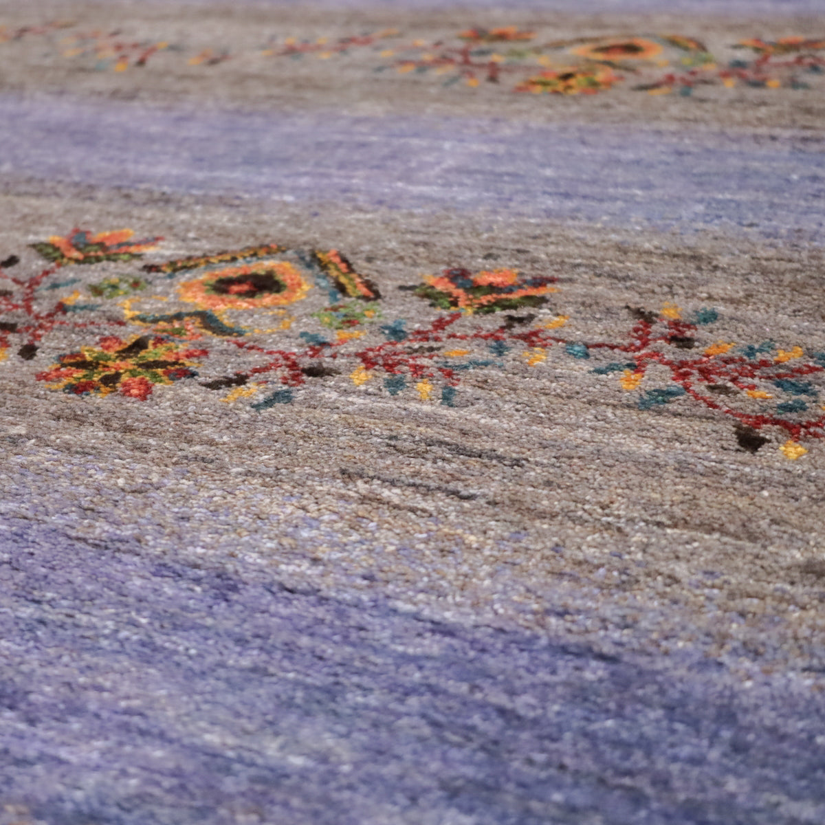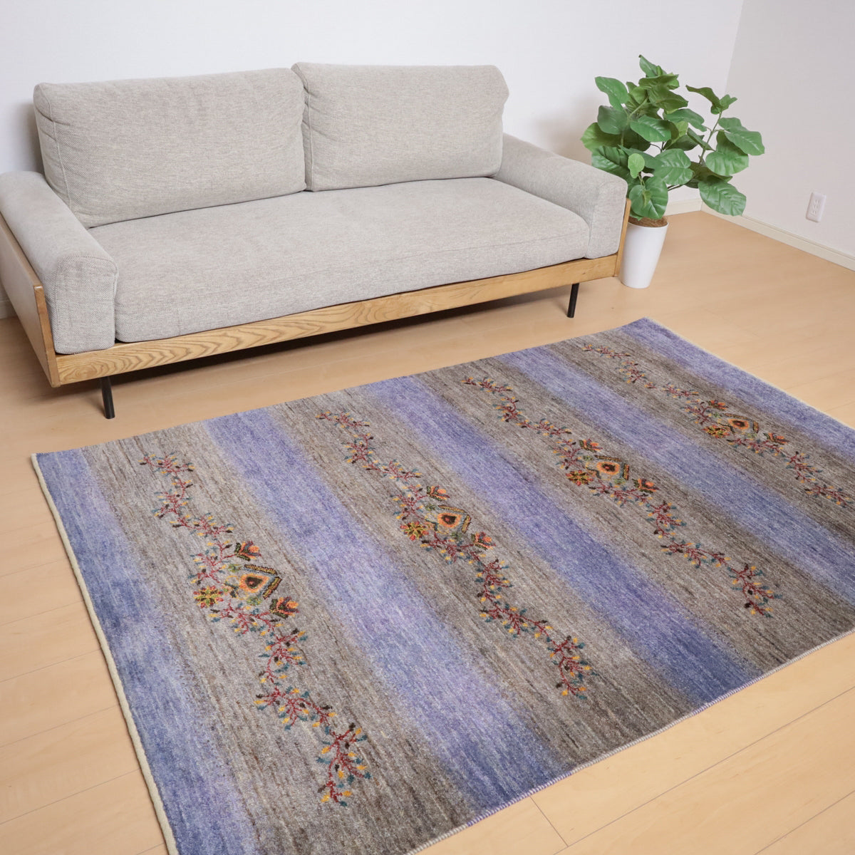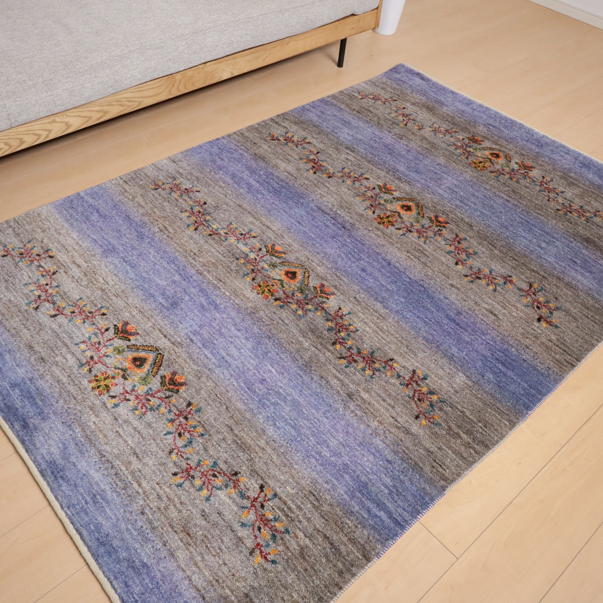 青紫と灰茶のボーダーが美しい一枚。灰茶のボーダーには、明るい橙や黄色で花と蔦のモチーフが描かれ、鮮やかなアクセントになっています。敷くだけでお部屋をぐっと個性的でモダンな雰囲気にしてくれる一枚です。
