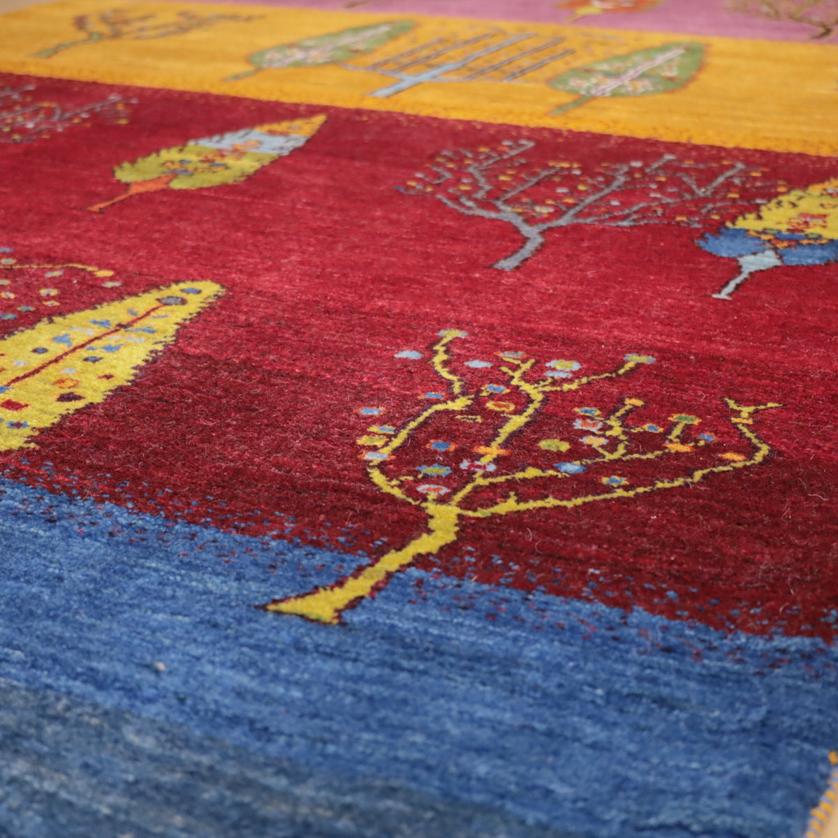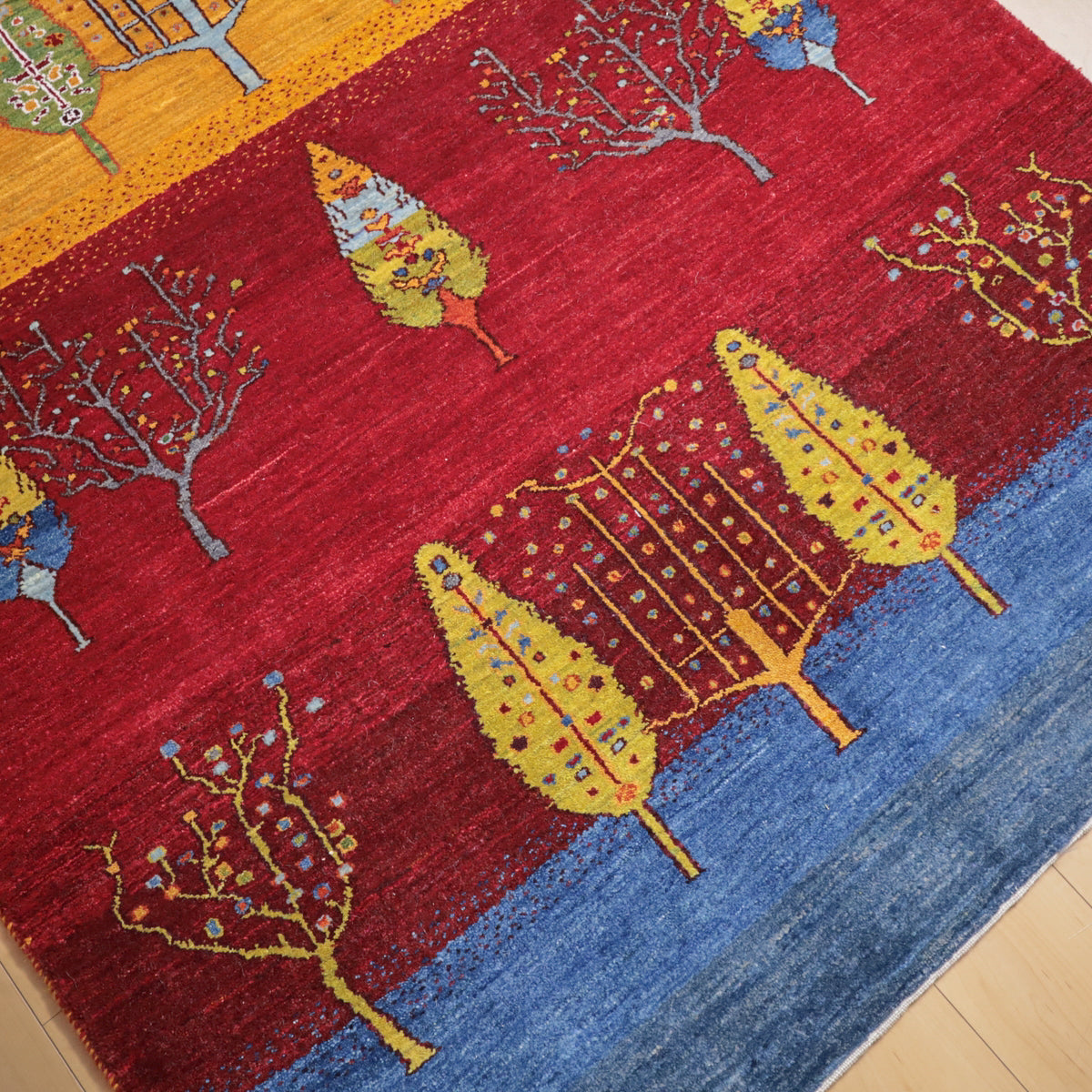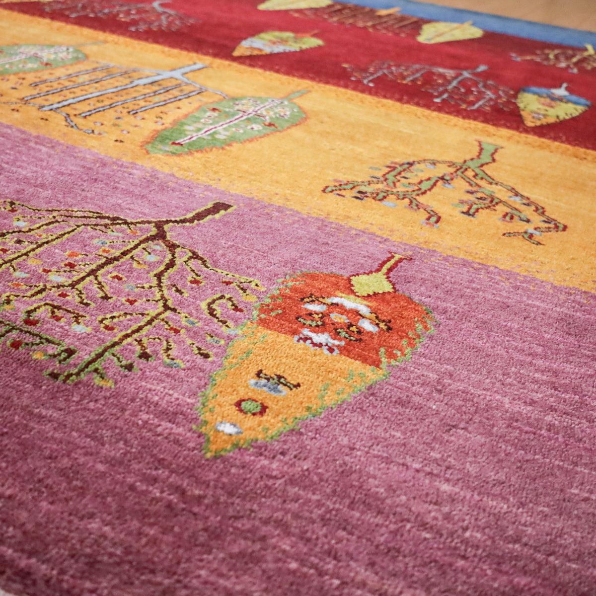 様々なデザインの生命の木のモチーフが描かれた、とてもカラフルなギャッベです。二本の木の間に立つ不思議な形の木は家族を支える父親、周囲の美しい木々は妻や子どもたちなど、家族の温かさを表現するとともに繁栄を願う気持ちが込められています。鮮やかな色彩と個性的なデザインが、お部屋を明るく彩る一枚です。