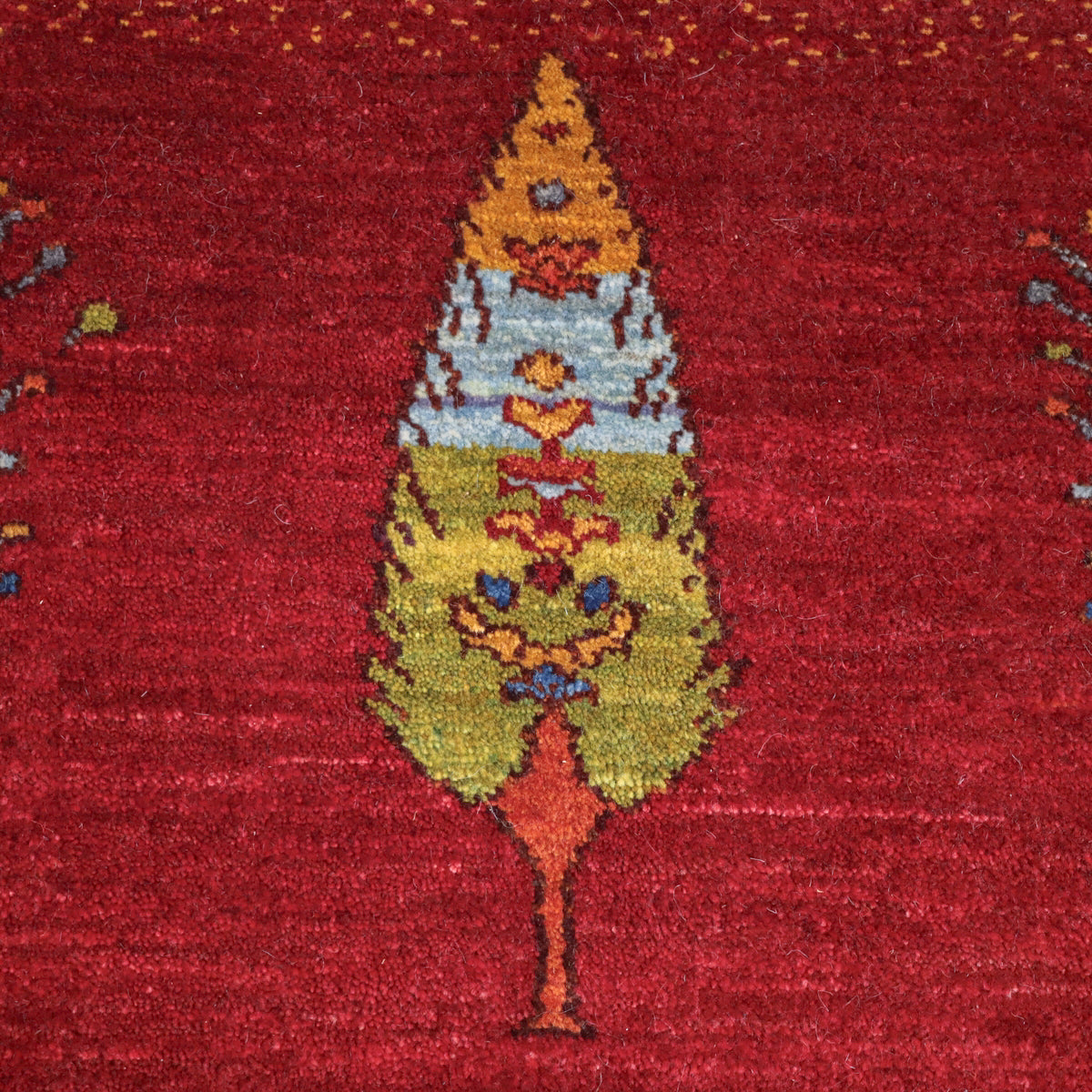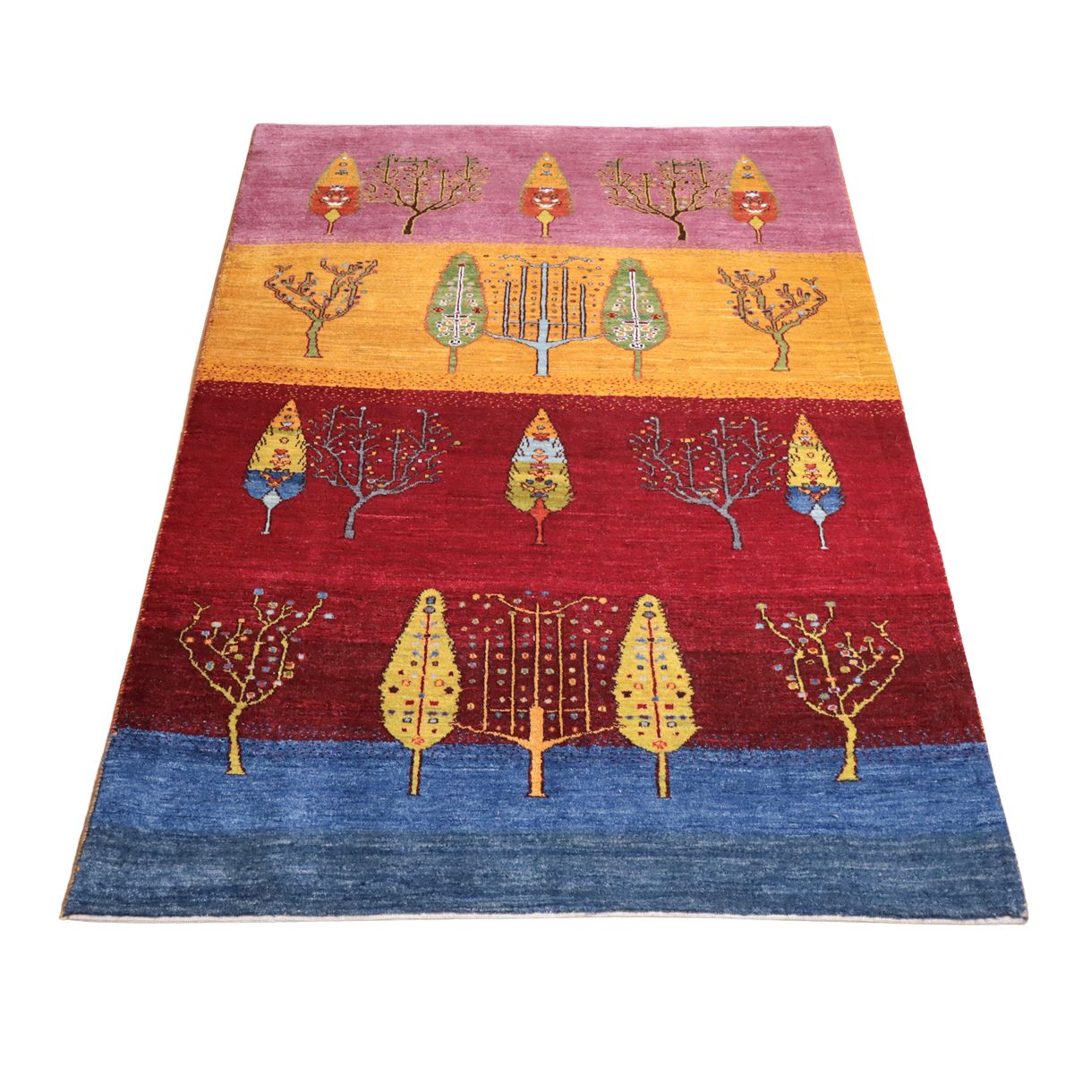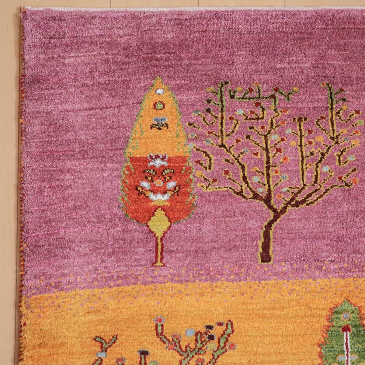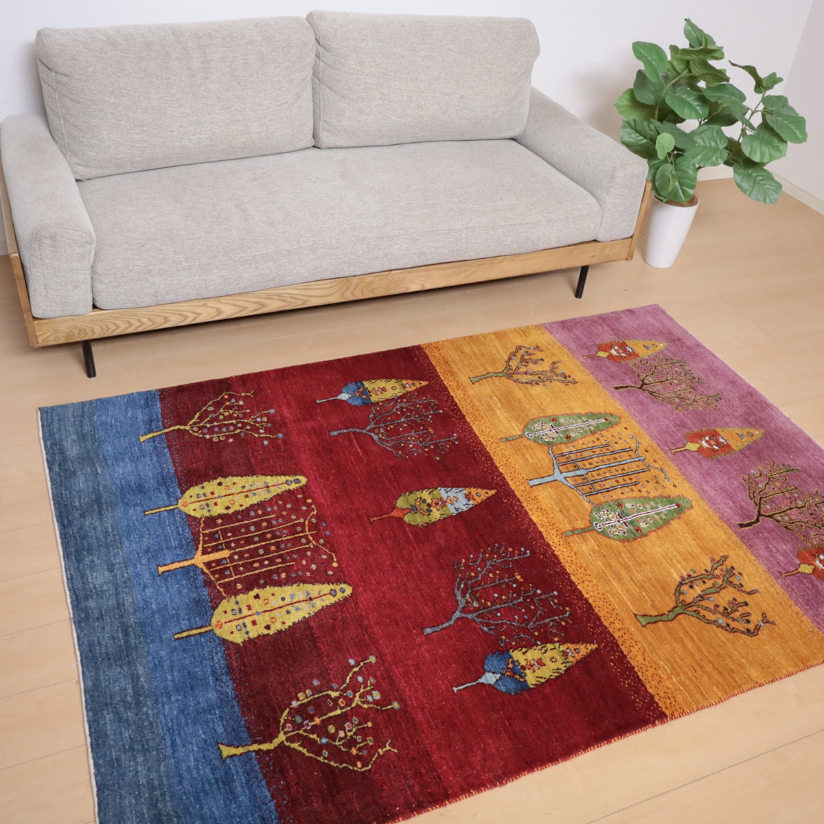 様々なデザインの生命の木のモチーフが描かれた、とてもカラフルなギャッベです。二本の木の間に立つ不思議な形の木は家族を支える父親、周囲の美しい木々は妻や子どもたちなど、家族の温かさを表現するとともに繁栄を願う気持ちが込められています。鮮やかな色彩と個性的なデザインが、お部屋を明るく彩る一枚です。