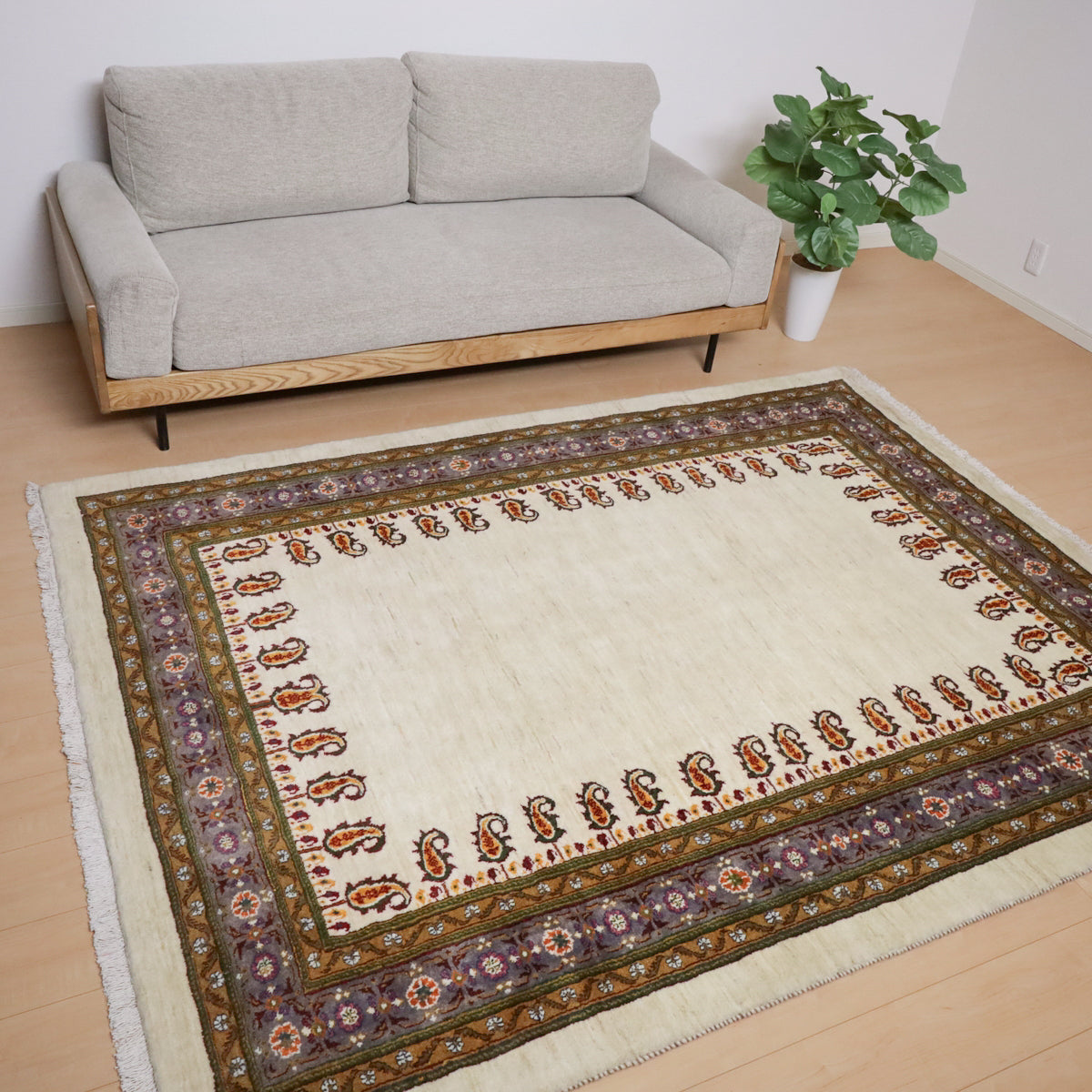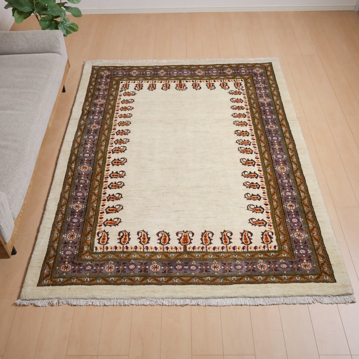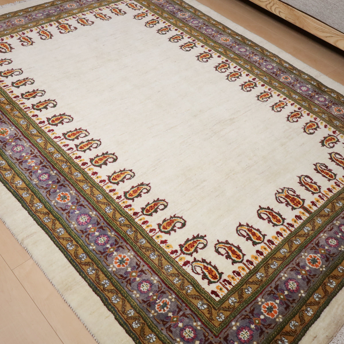 羊の毛色を生かした生成の背景に、繊細に描かれたボテ(ペイズリー)モチーフが印象的なギャッベです。外側のフレームには、紫がかったグレーの背景に魔除けのオオカミの足跡が描かれ、全体に伝統的モチーフの持つ上品さと落ち着きを感じさせます。お部屋に優雅な彩りをもたらす一枚です。